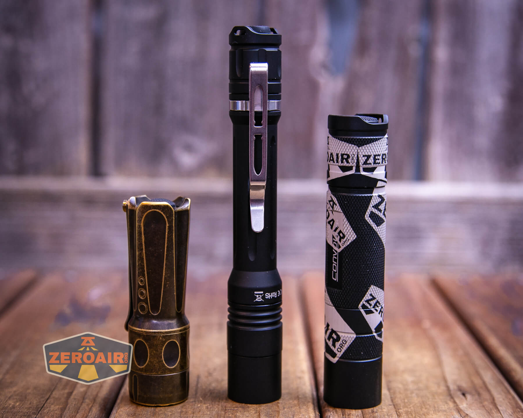 Also above is the light beside a TorchLAB BOSS 35, an 18350 light. I reviewed the aluminum version of that light in both 35 and 70 formats. I also reviewed that specific edition, the “Oveready BOSS FT Collector Vintage Brass” 35. I love it!