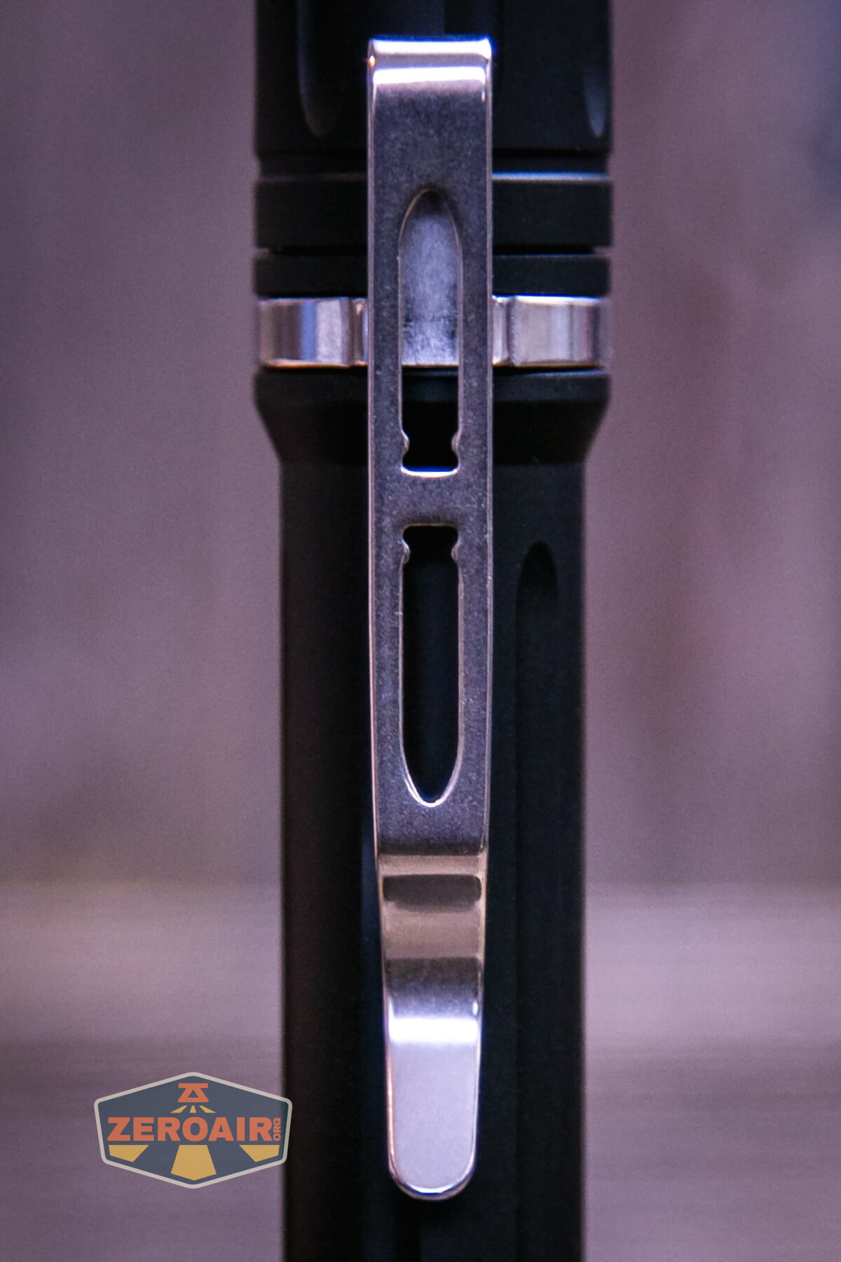 A friction-fit pocket clip is included. It attaches only on the tail end, for bezel-down carry. The clip is notably sturdy.