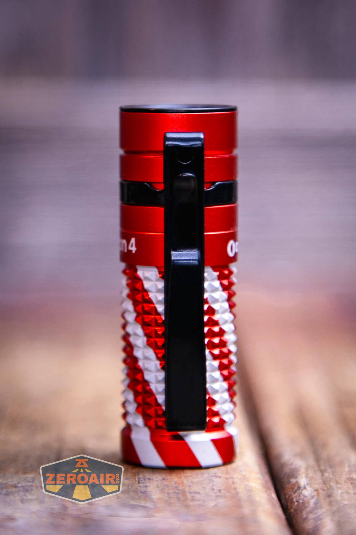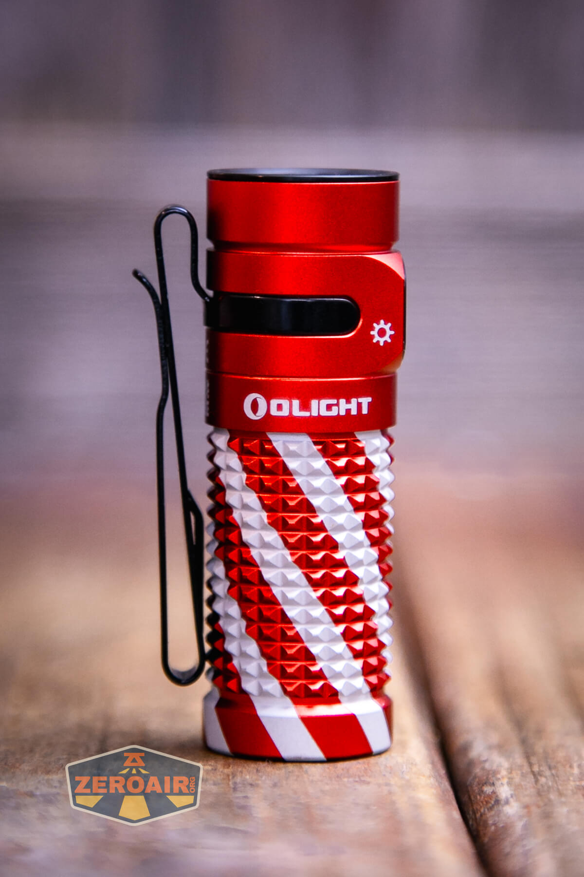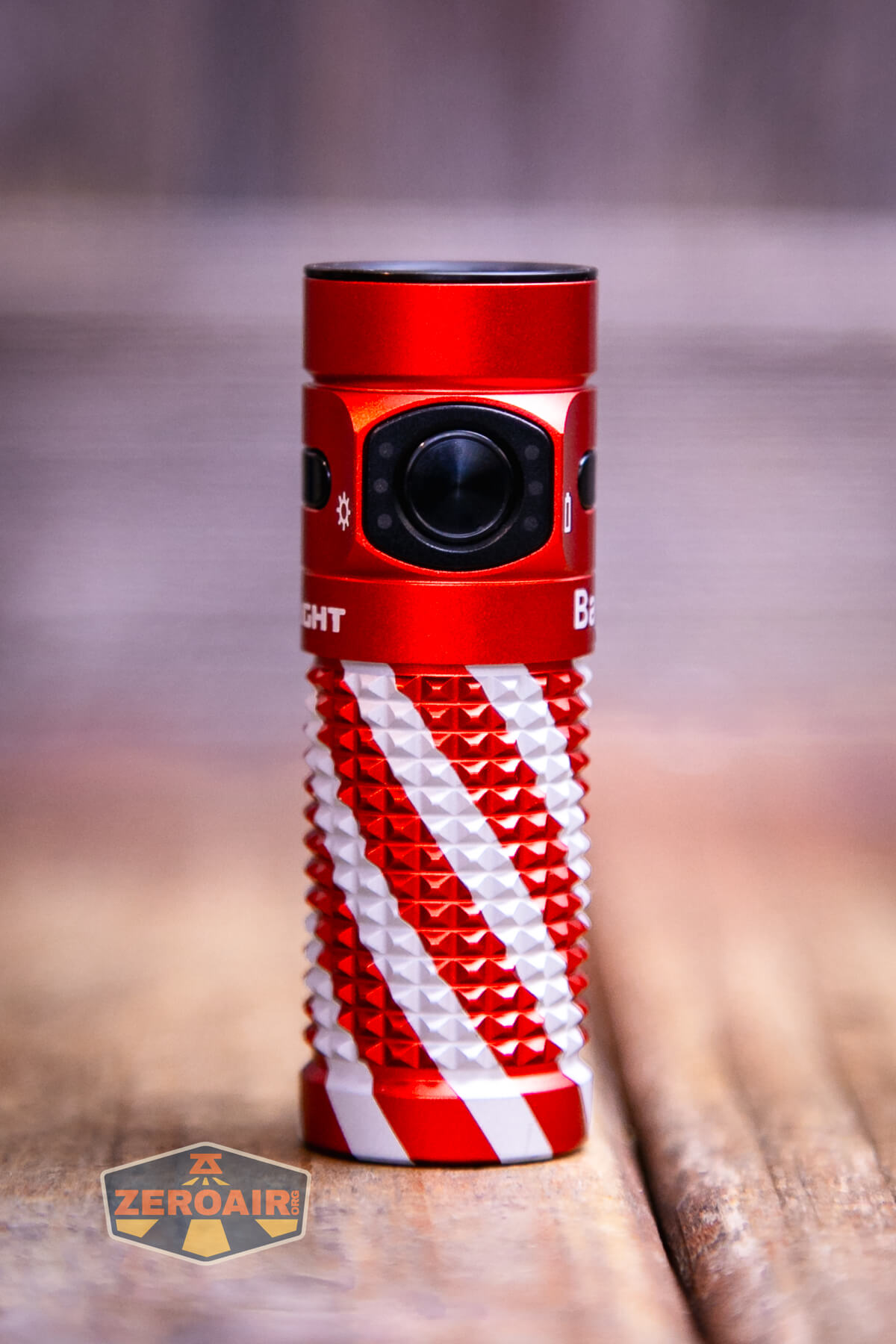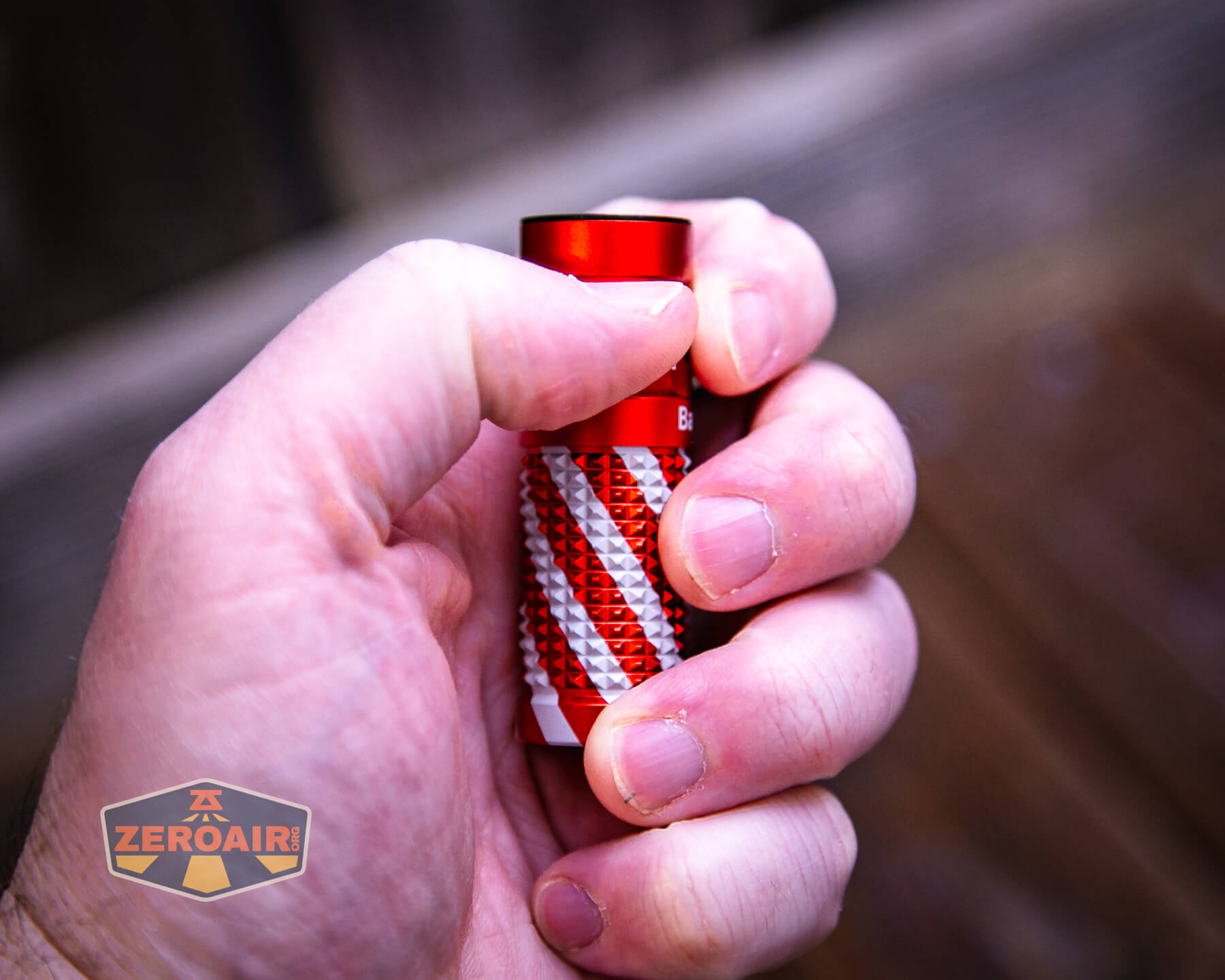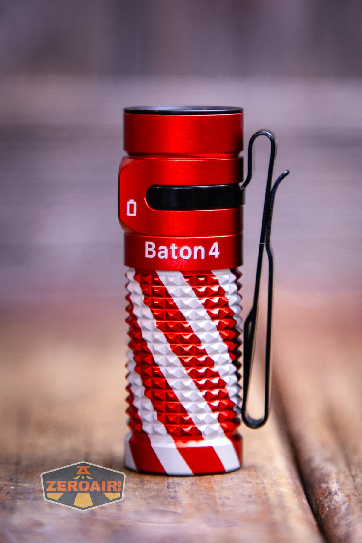 A small, red and silver textured flashlight, likely an Olight Baton 4 EDC Flashlight with a black button, lies on a wooden surface. The lower left of the image shows a “ZeroAir” logo.