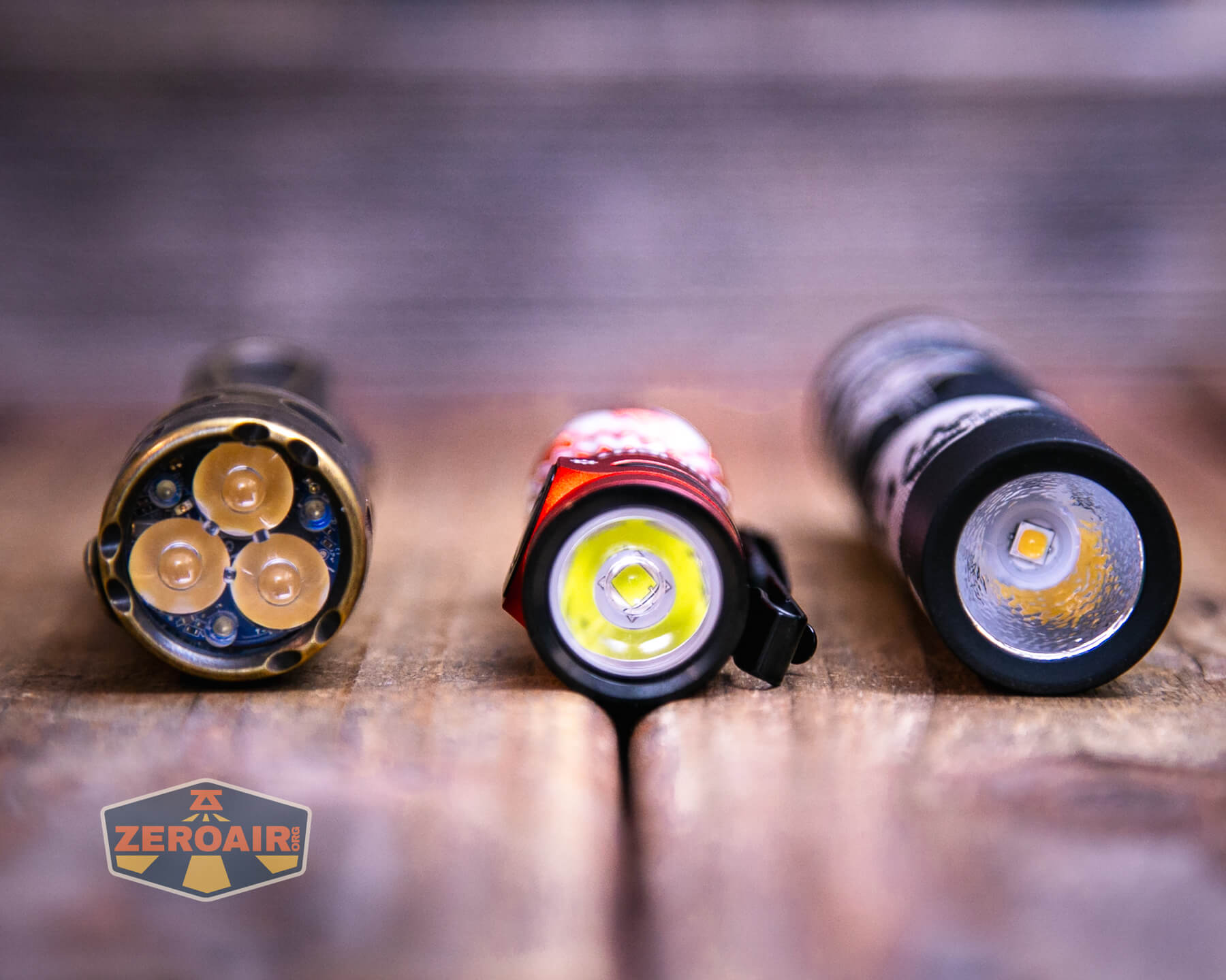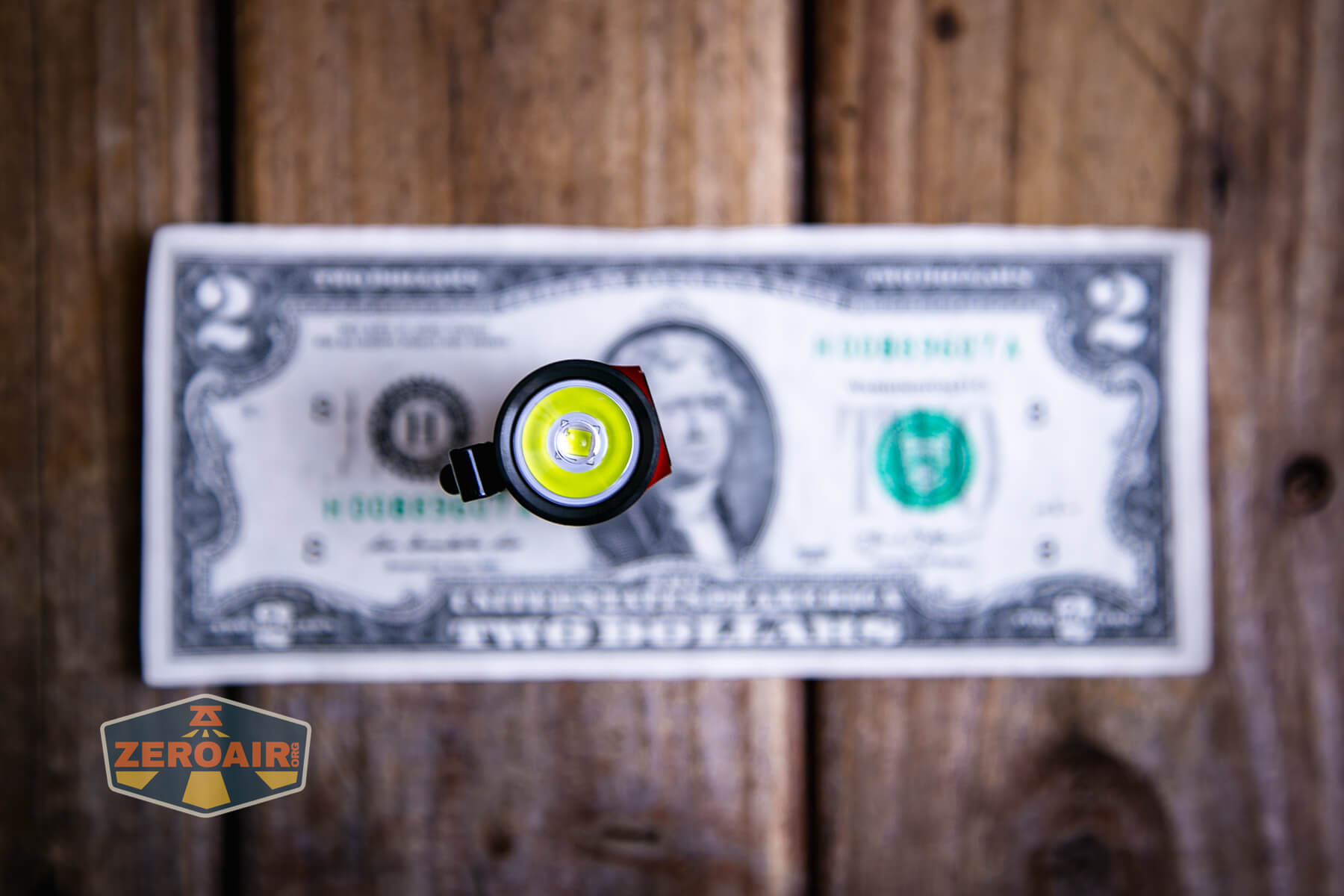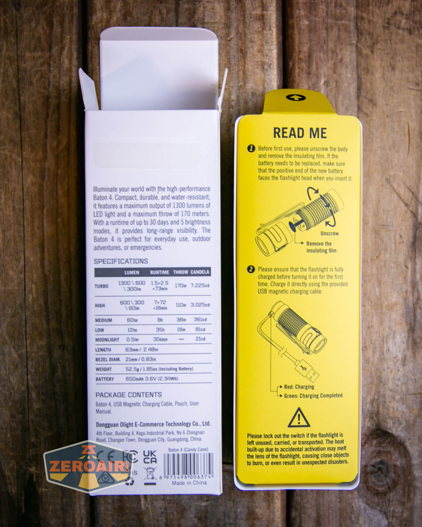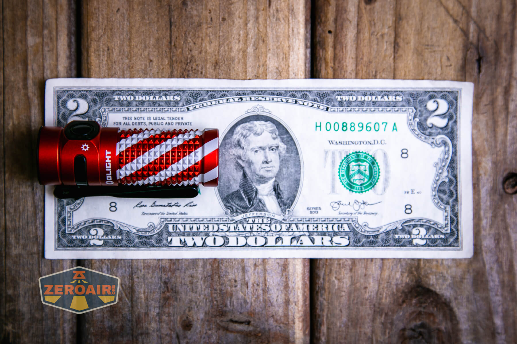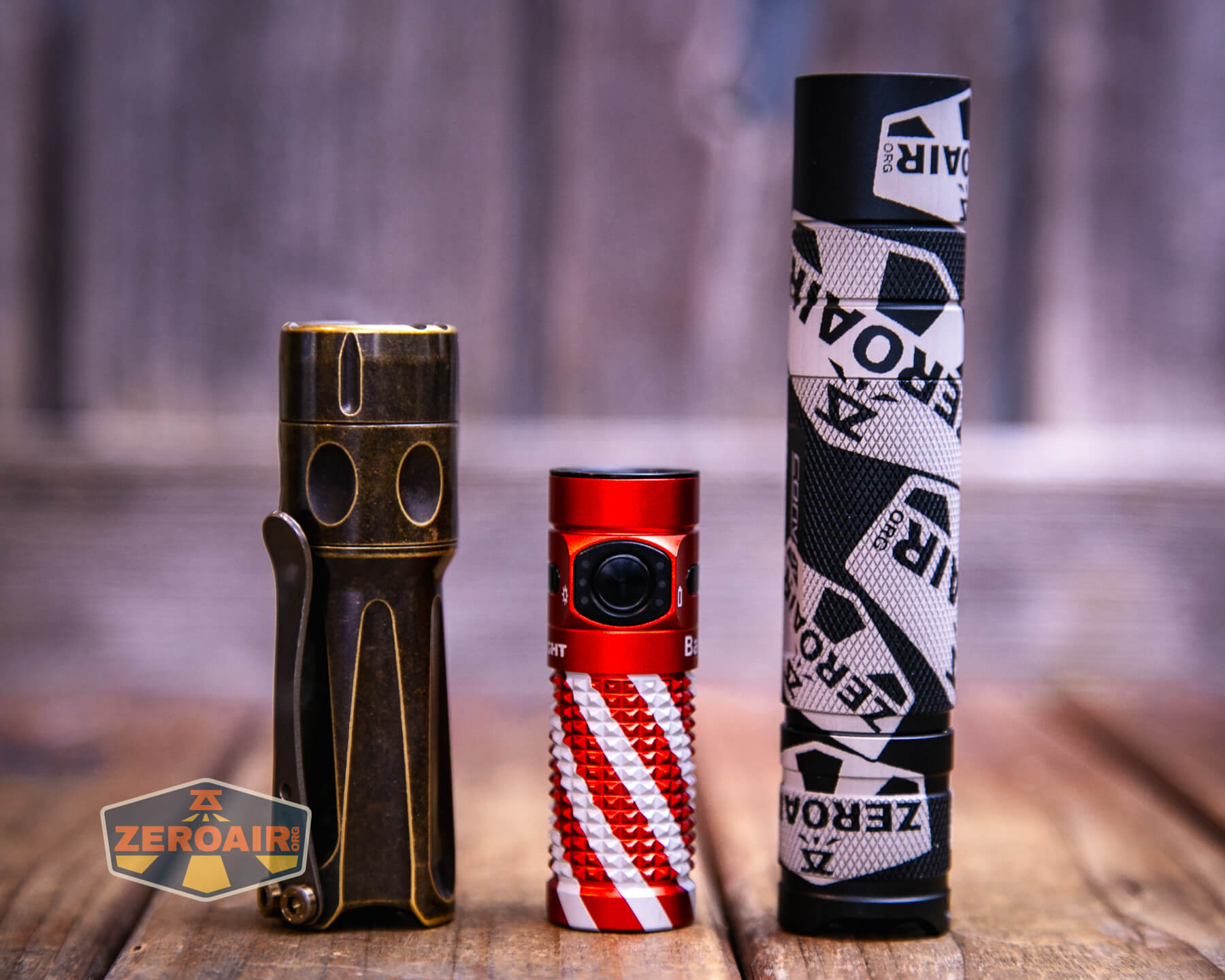 A small, red and silver textured flashlight, likely an Olight Baton 4 EDC Flashlight with a black button, lies on a wooden surface. The lower left of the image shows a “ZeroAir” logo.
