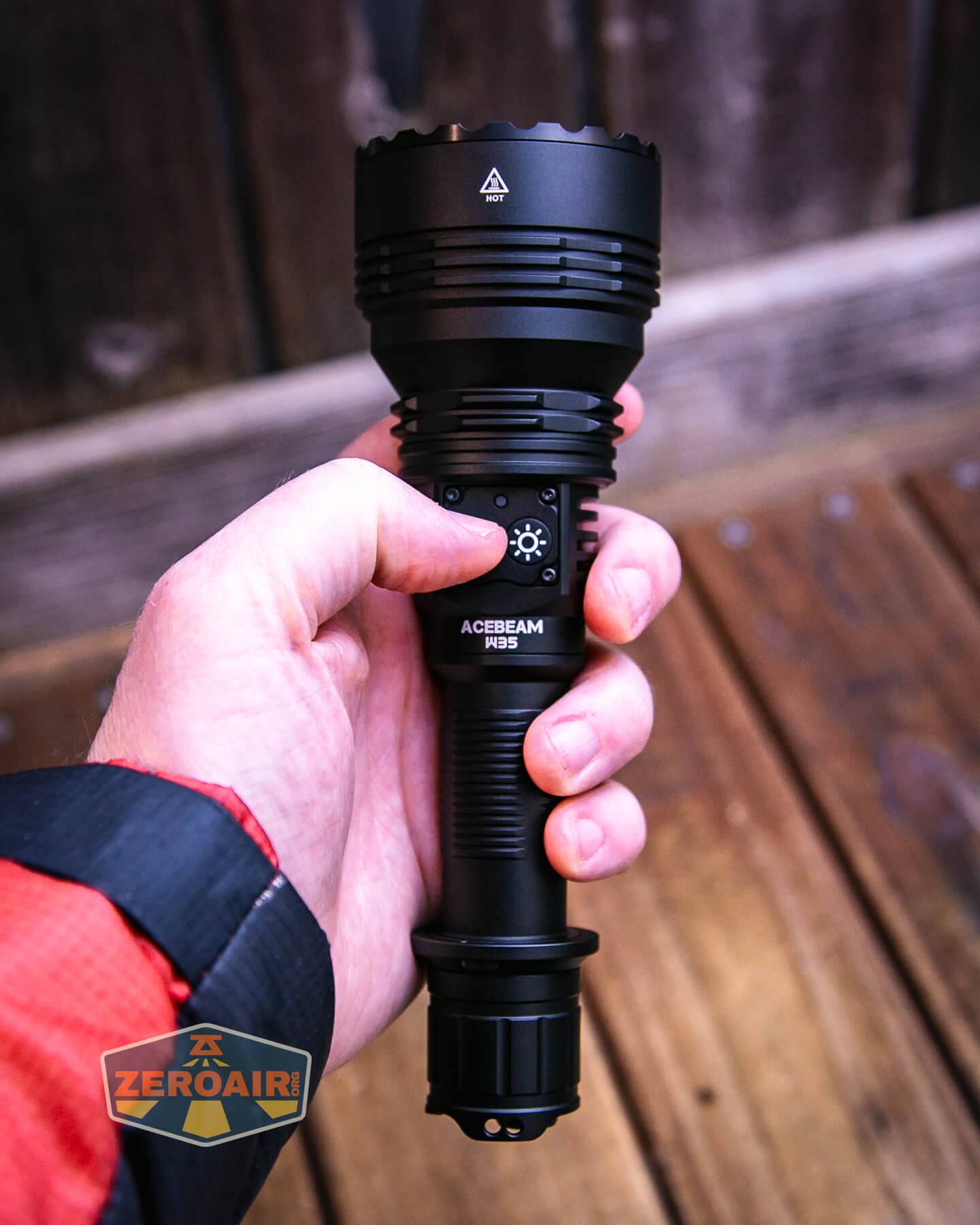 The Acebeam W35 Zoom LEP flashlight features a couple of switches. First, there’s a mechanical tail switch. The light doesn’t do anything if this switch is in the off position.