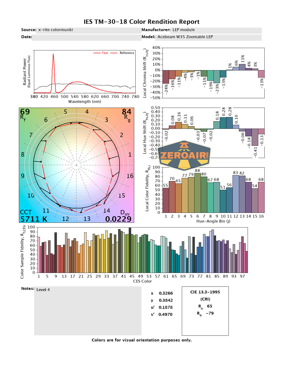 CRI and CCT are really not the point of the Acebeam W35 Zoom LEP flashlight. However, we can still check it! There is a bunch of tint shift across this very throwy beam; I usually take readings from as close to the center as I can get. So the edge might appear different in the photos than what the reports say. CCT is neutral, at around 5500K and CRI is very low, in the low 60s.
