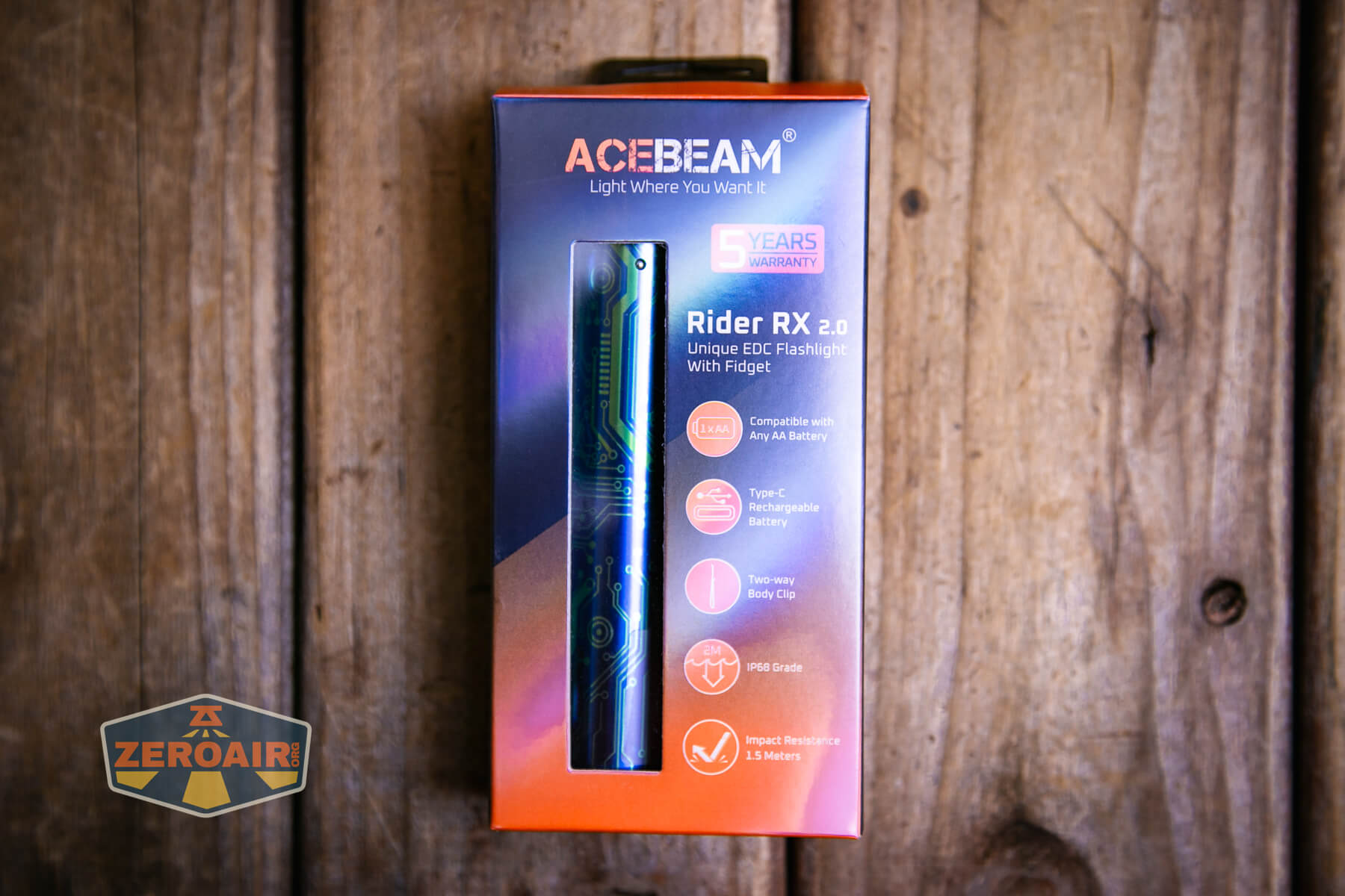 Included with the Acebeam Rider RX Titanium v2 flashlight is a lithium-ion 14500 cell. However, the Rider RX V2 will also run on a single AA cell, too (that is, a 1.5V cell – primary or NiMH.)