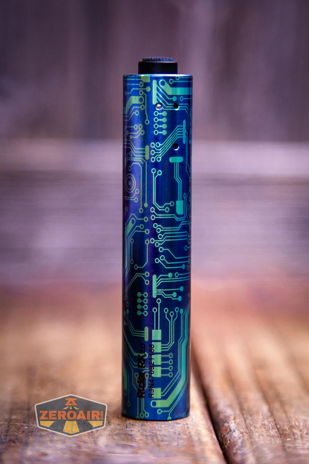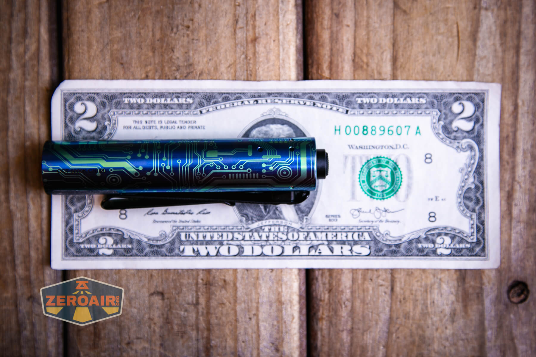 No surprises here. The Acebeam Rider RX Titanium v2 flashlight has a very nice build quality. It’s slick as glass, though, so if that’s going to be a problem, you should probably move on from this light. The whole light has a circuit-type design. I would guess this is laser anodization. Probably, the whole light is anodized blue, then the green parts are laser anodized again. But who knows! Anyway, it hasn’t rubbed off, and it’s pretty neat!