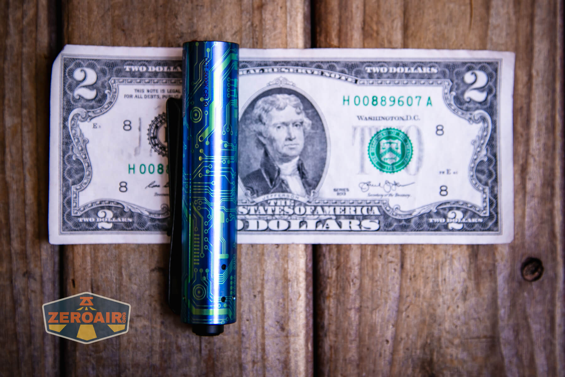 When in the resting state, the pocket clip has a little groove to rest in. When in the extended state, there is no groove. This version (the titanium) ships with a little patch. This might be just intended for shipping purposes, but it’d be reasonable to leave it in place to protect the titanium. That said, on this version, the pocket clip doesn’t even touch the body anyway.