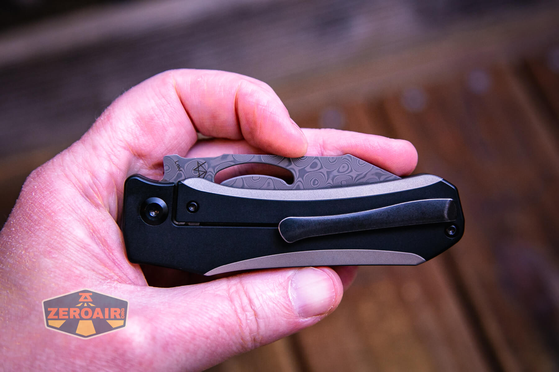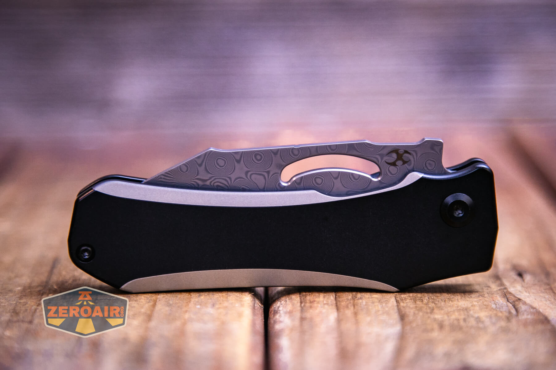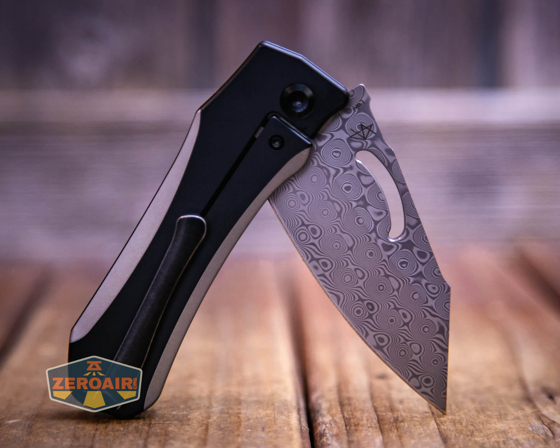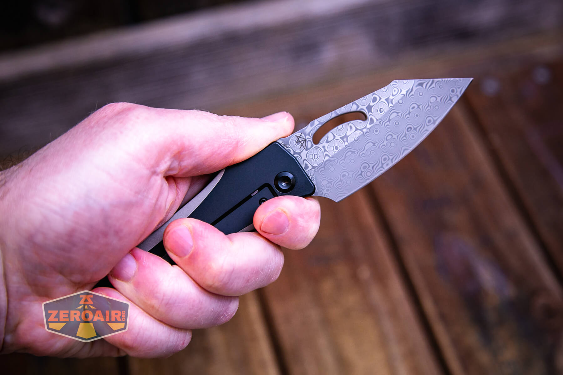 The Kansept Loki thumb hole knife offers Damascus (or S35VN) steel as well as a unique hole for opening. Titanium handles and pocket clip round the design out!