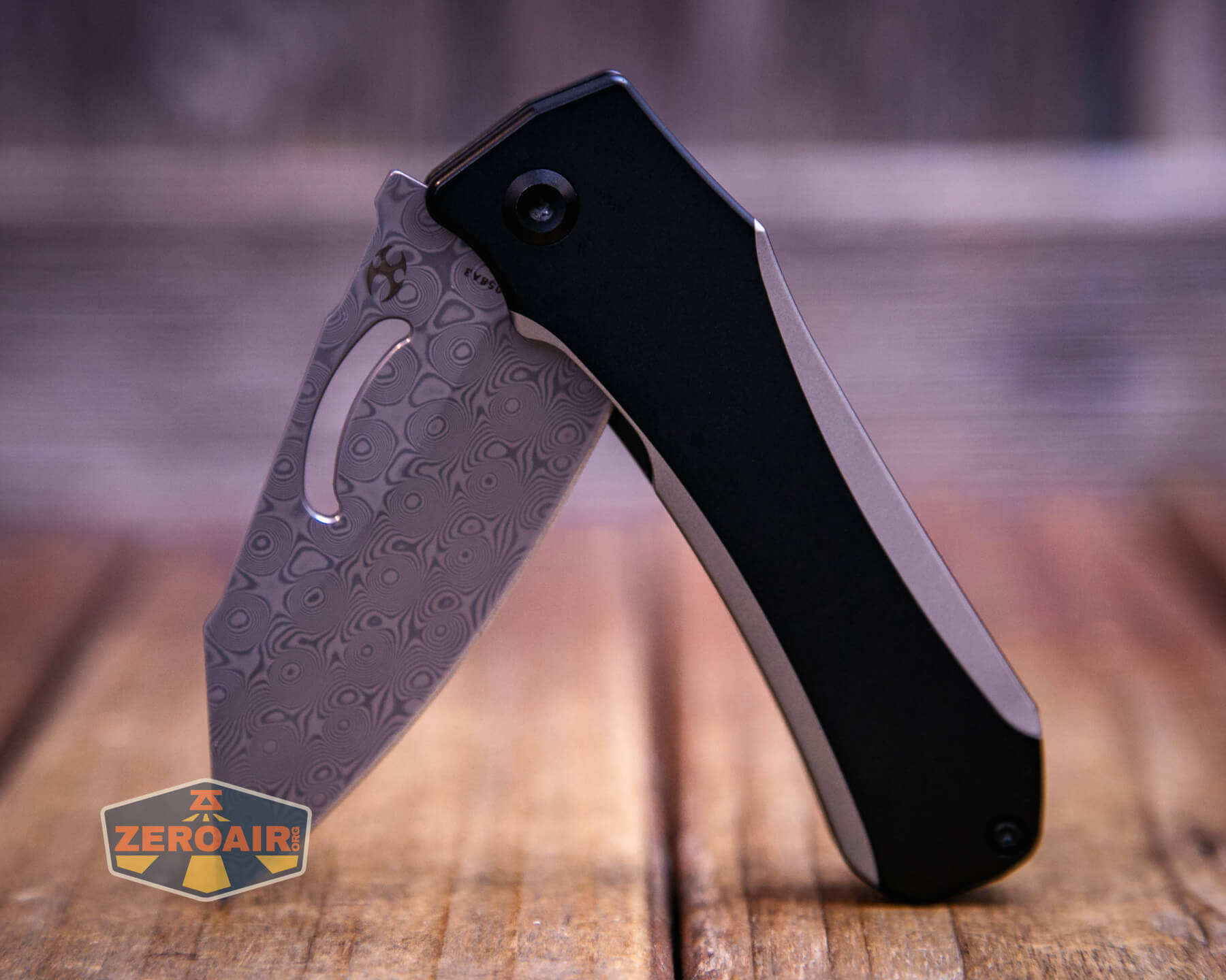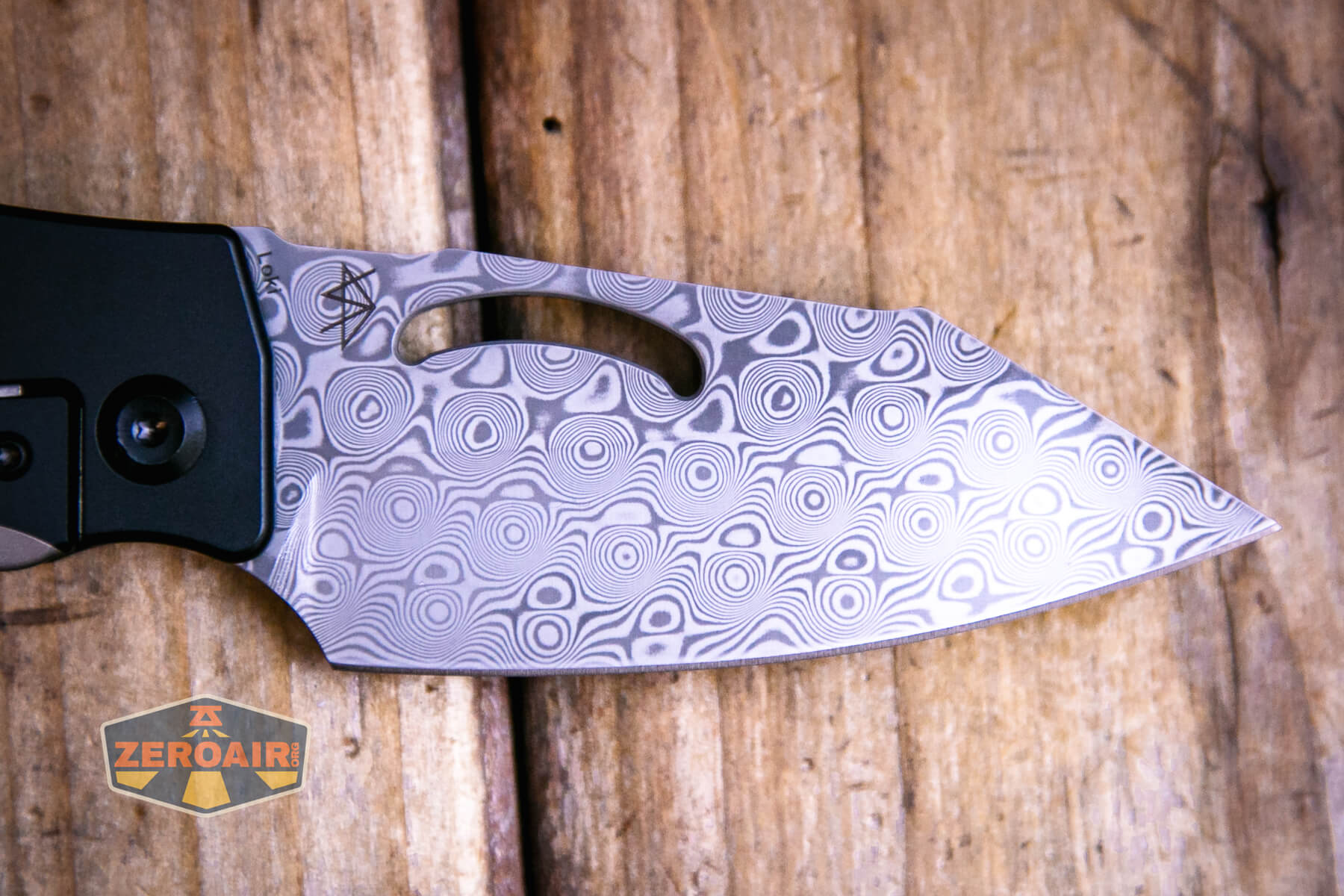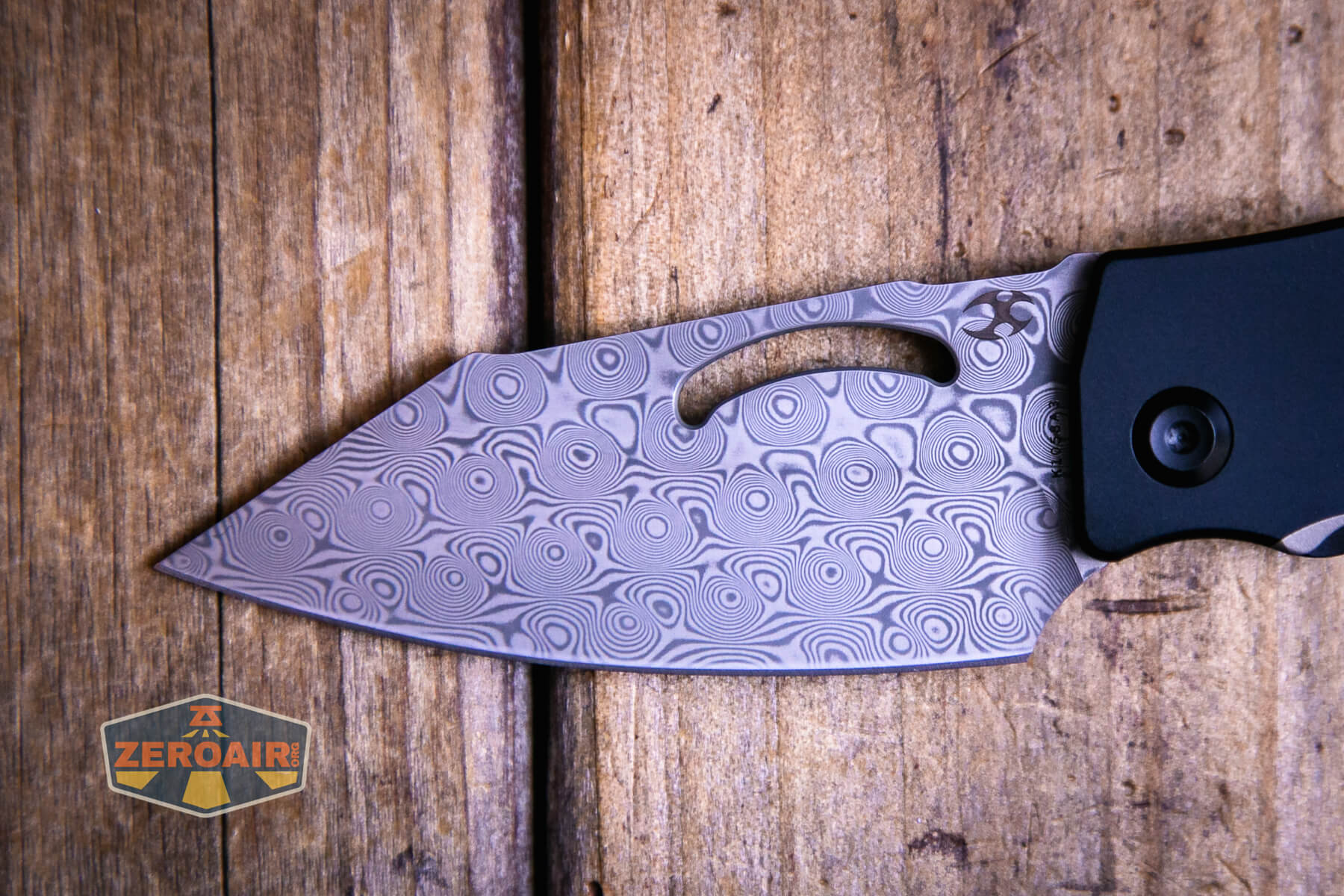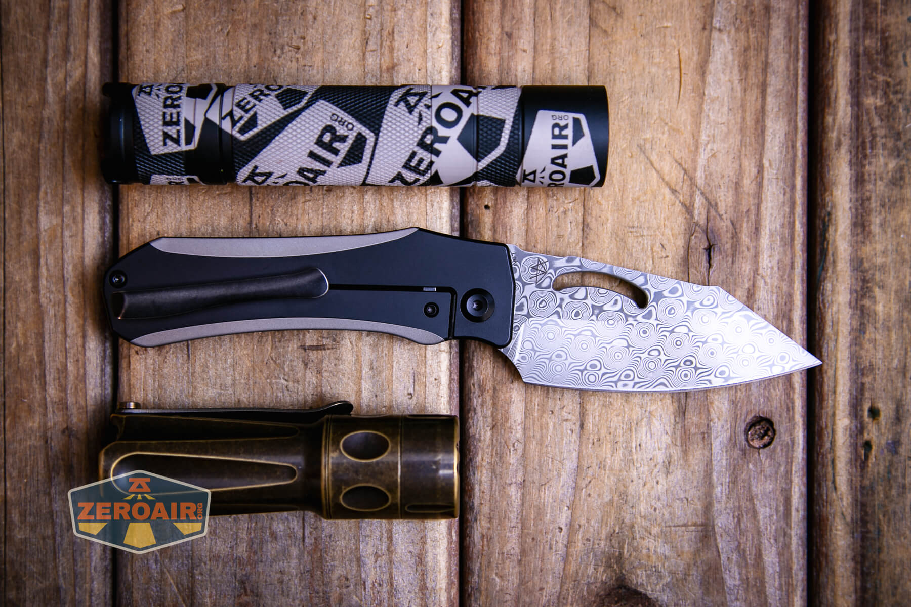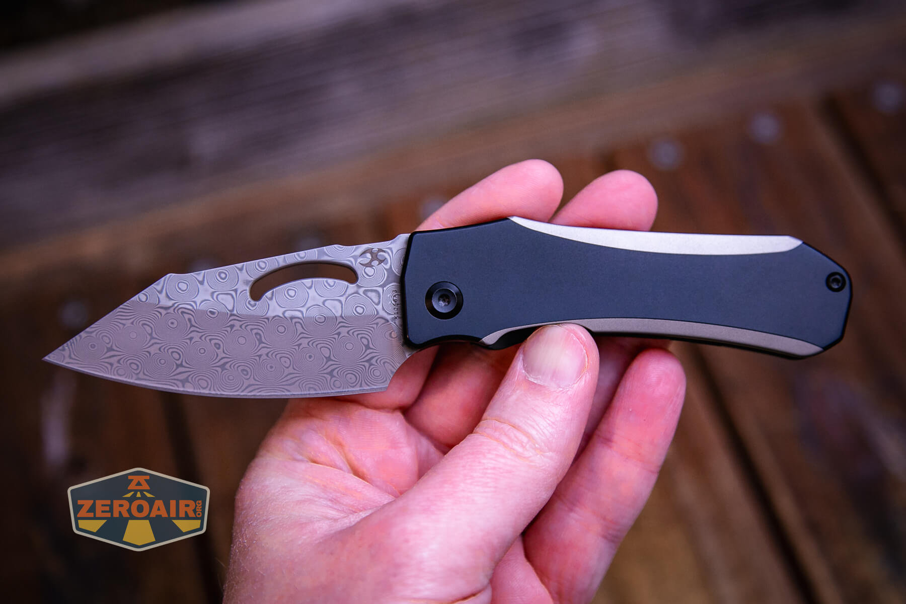 The Kansept Loki thumb hole knife offers Damascus (or S35VN) steel as well as a unique hole for opening. Titanium handles and pocket clip round the design out!