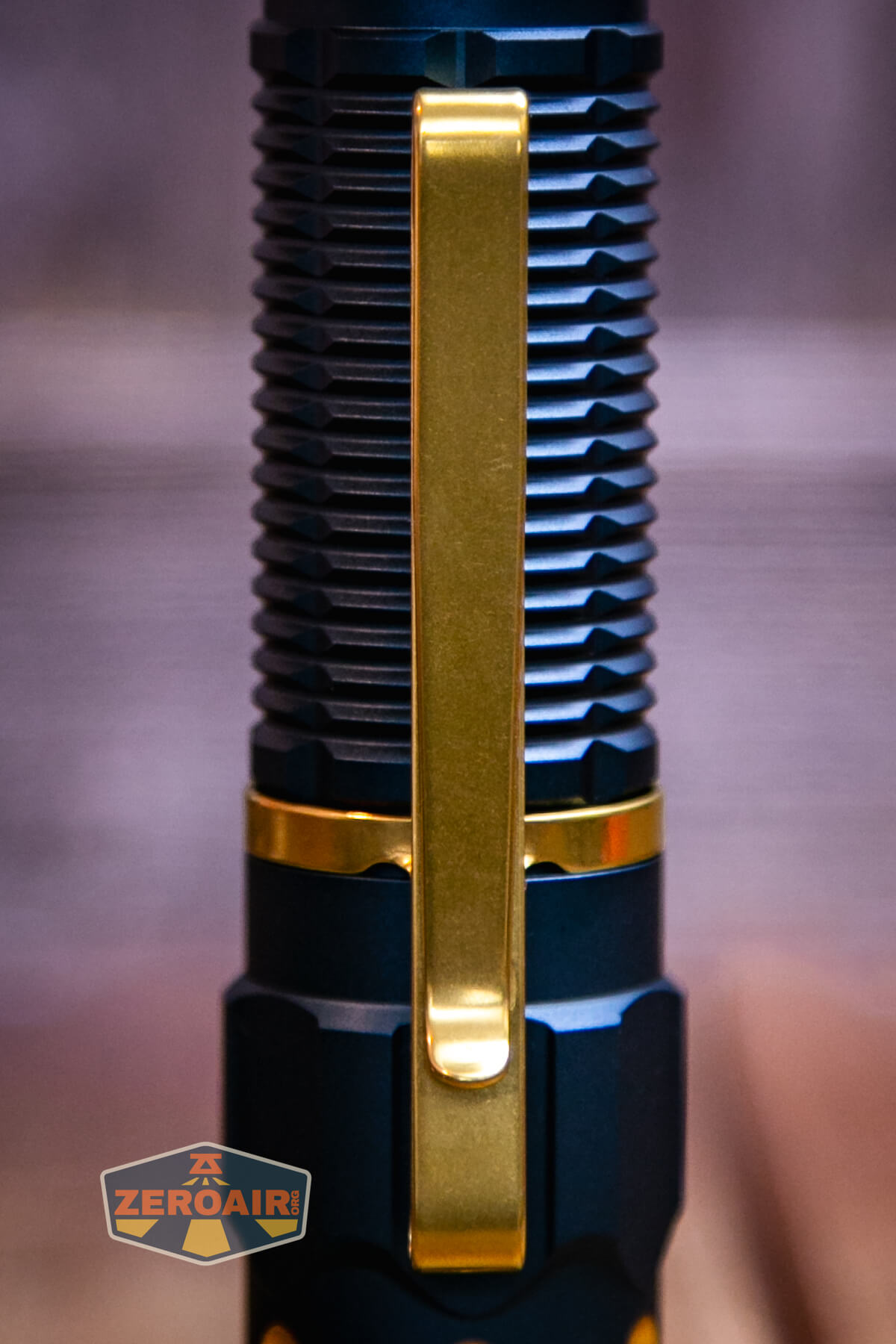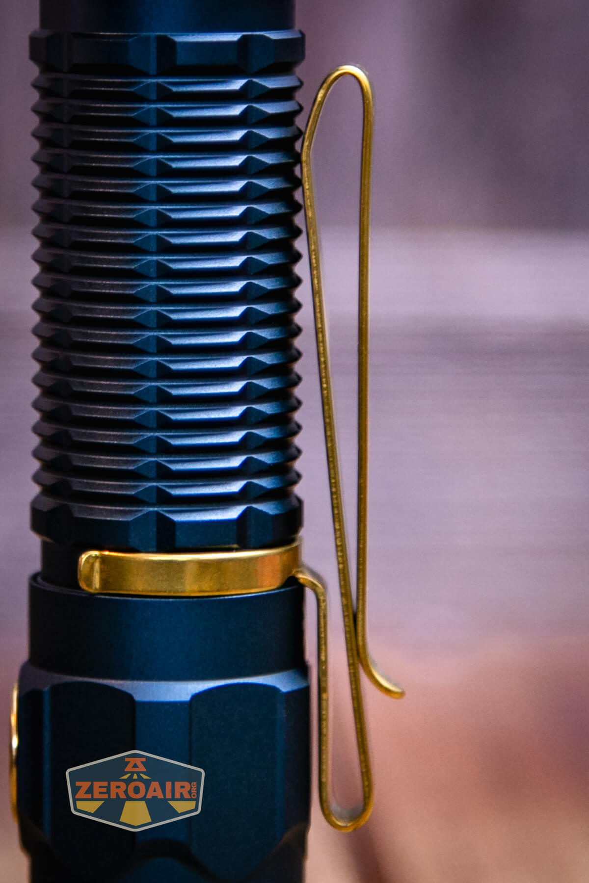 First off I’ll mention the pocket clip. Not only does it fit on the head or tail end of the light, it’s also a “two-way” friction-fit clip. The clip is long and well-suited for this light.