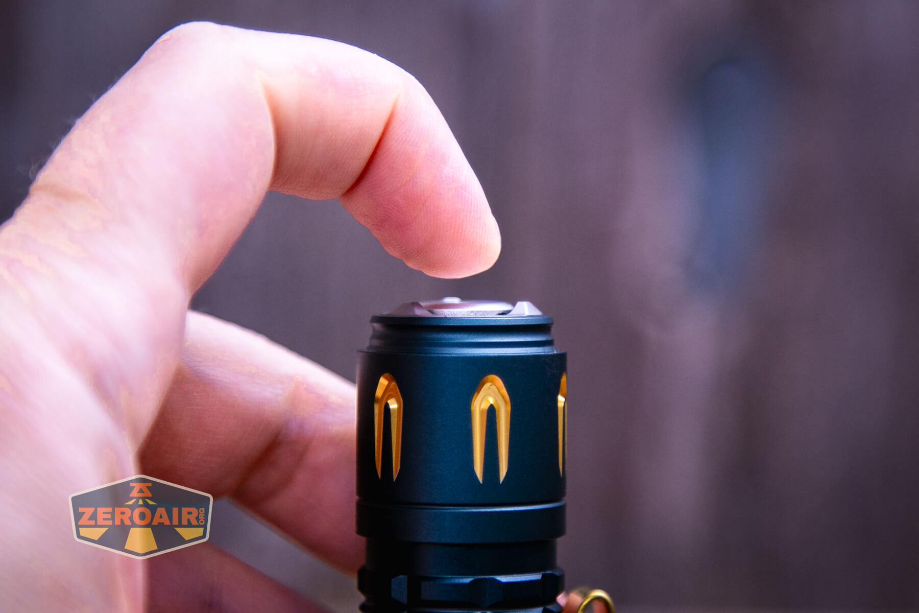 There are two switches on the Olight Warrior 3S flashlight. First is the metal tail switch which also is used in charging. (I forgot to grab a pic of this Dream Blue from this angle. Below, this is the titanium model.)