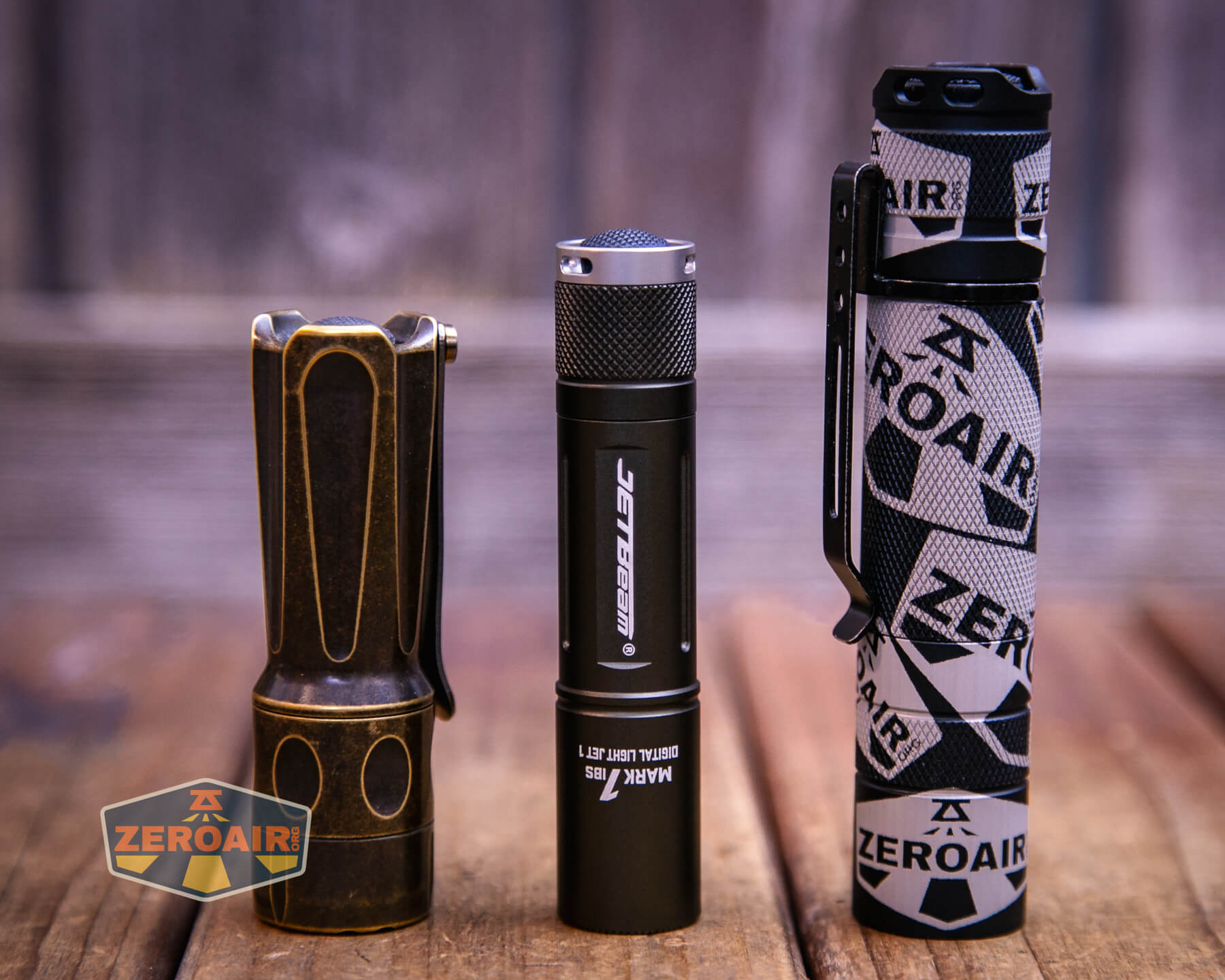 Also above is the light beside a TorchLAB BOSS 35, an 18350 light. I reviewed the aluminum version of that light in both 35 and 70 formats. I also reviewed that specific edition, the “Oveready BOSS FT Collector Vintage Brass” 35. I love it!