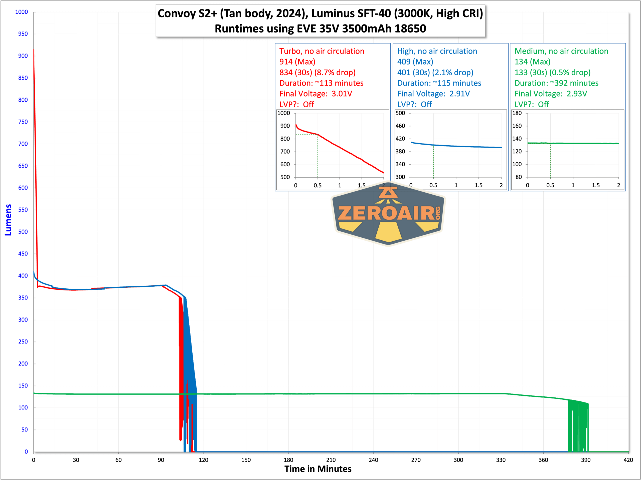 Here are a few runtimes for the 18650 setup. The light does have low voltage protection, and on bench power seemed to shut off electronically at around 2.6V. That’s just a shade low, but still acceptable. This performance is very typical of the Convoy S2+ 12-mode driver. (Again, it’s the emitter with regards to CRI and CCT that we’re most interested in here!)