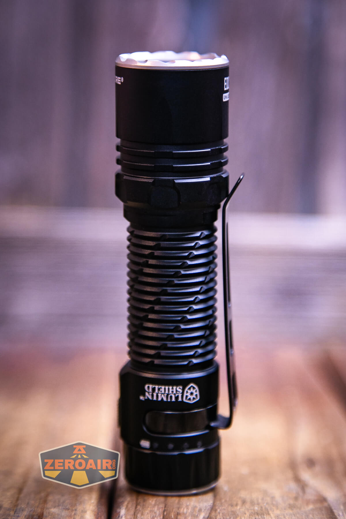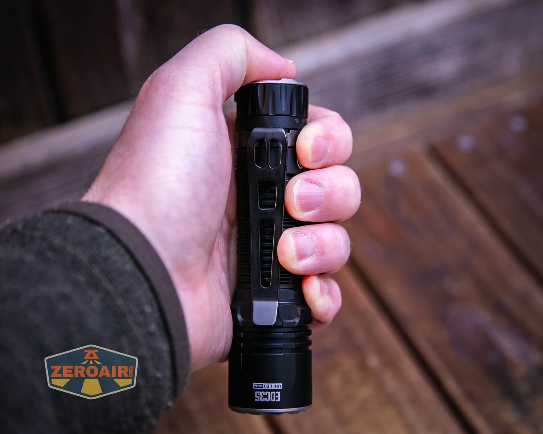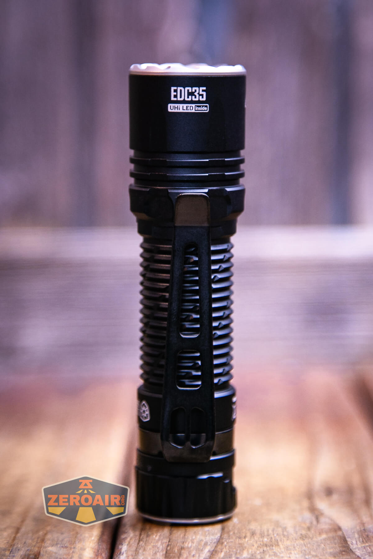 Nitecore ships the EDC35 with a friction-fit pocket clip attached. This clip is located specifically, and can’t rotate around the body.