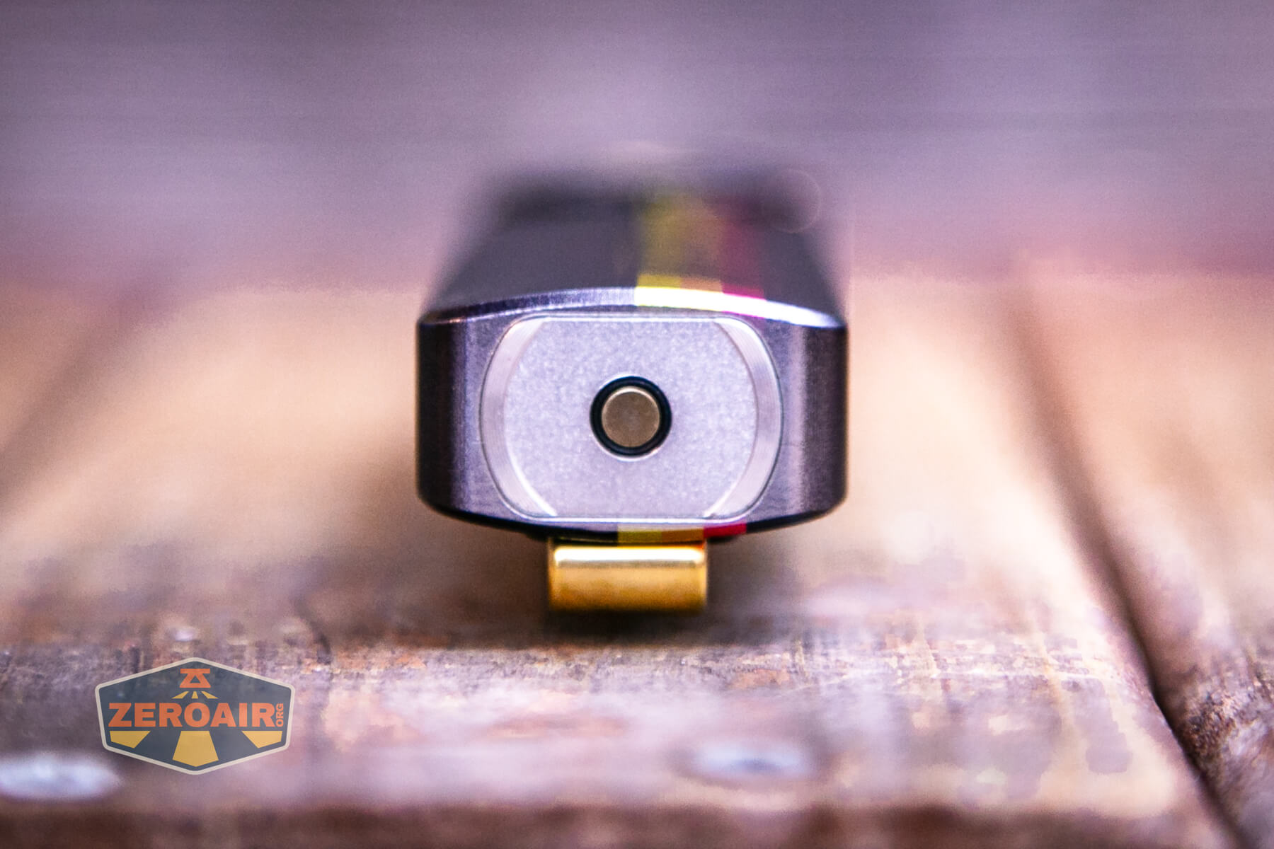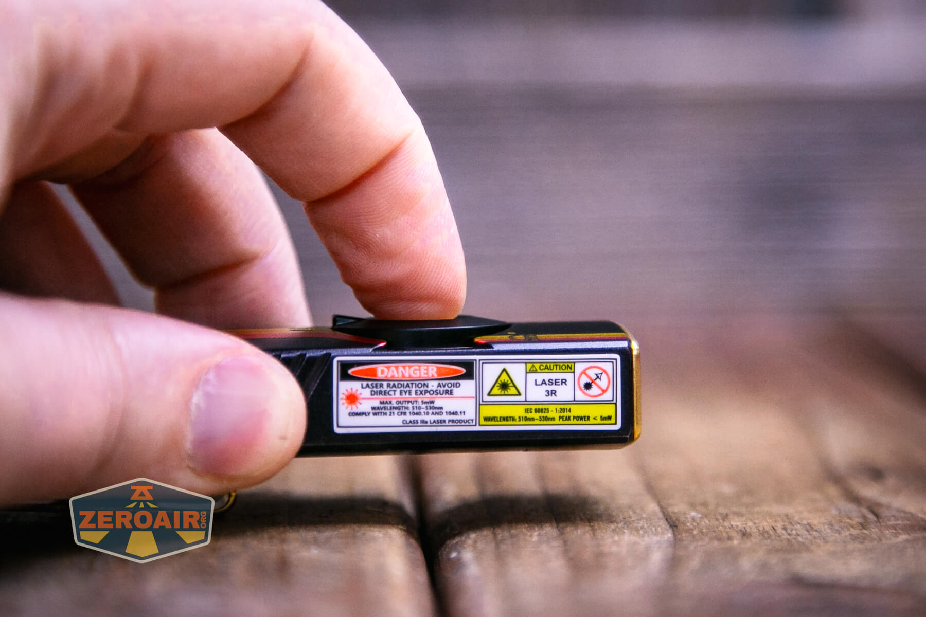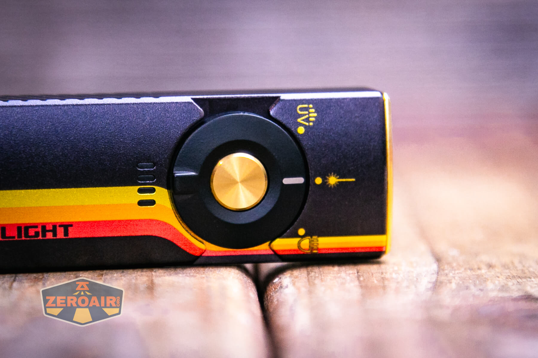 There’s just one e-switch on the Olight Arkfeld Pro Racing Stripes flashlight. Surrounding that e-switch is a selector knob of sorts, which points to either white LED output, ultraviolet, or laser output. Functionally this is exactly the same as previous Arkfelds, but just with one added output option. The gold-colored clip mentioned above matches the gold-colored e-switch you can see below.