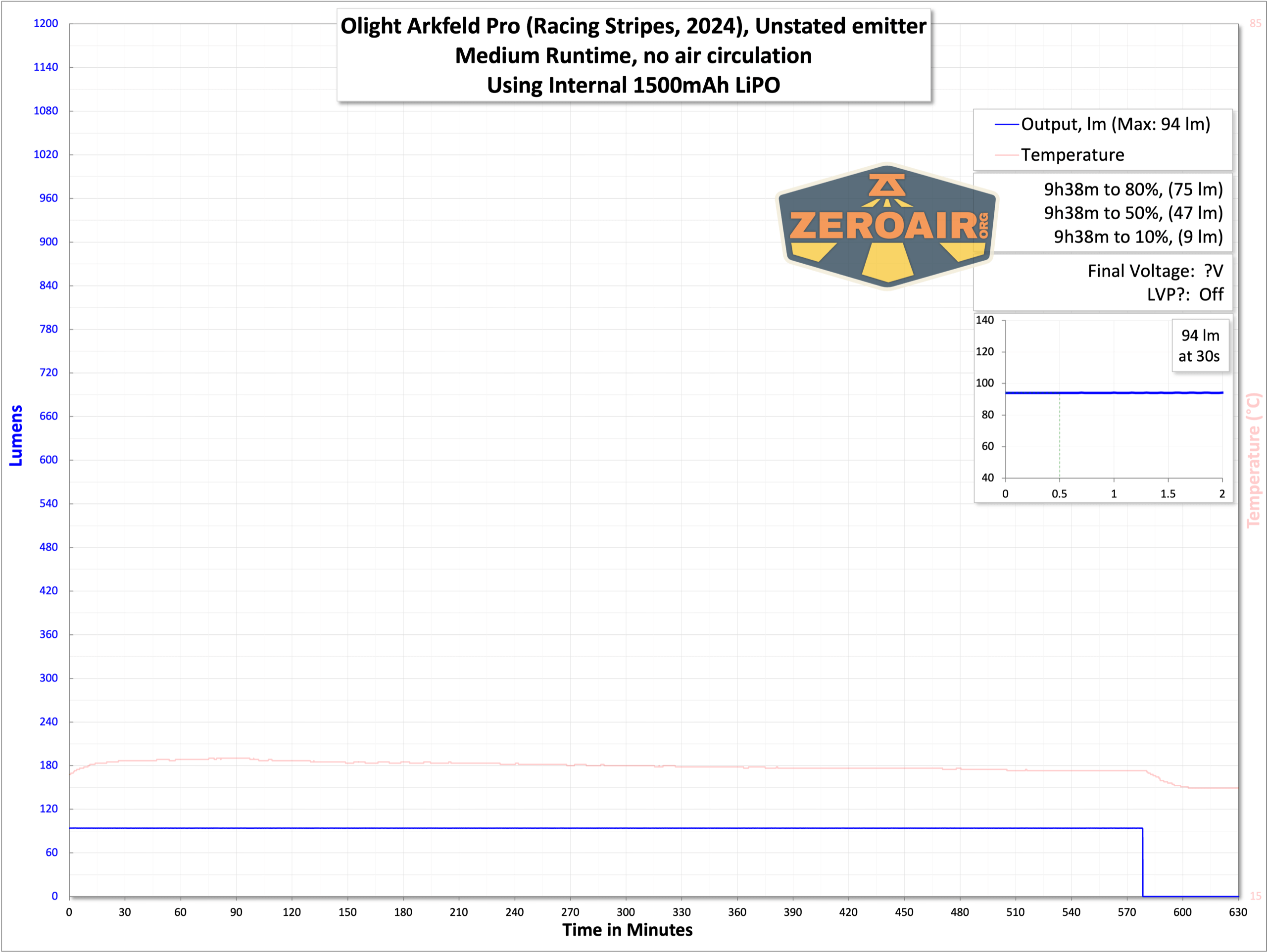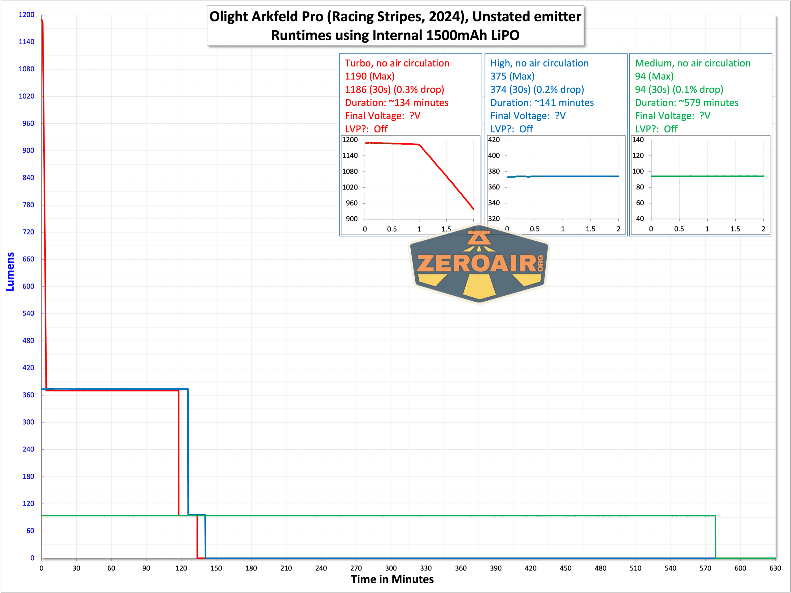 | Mode | Mode Claimed Output (lm) | Claimed Runtime | Measured Lumens |