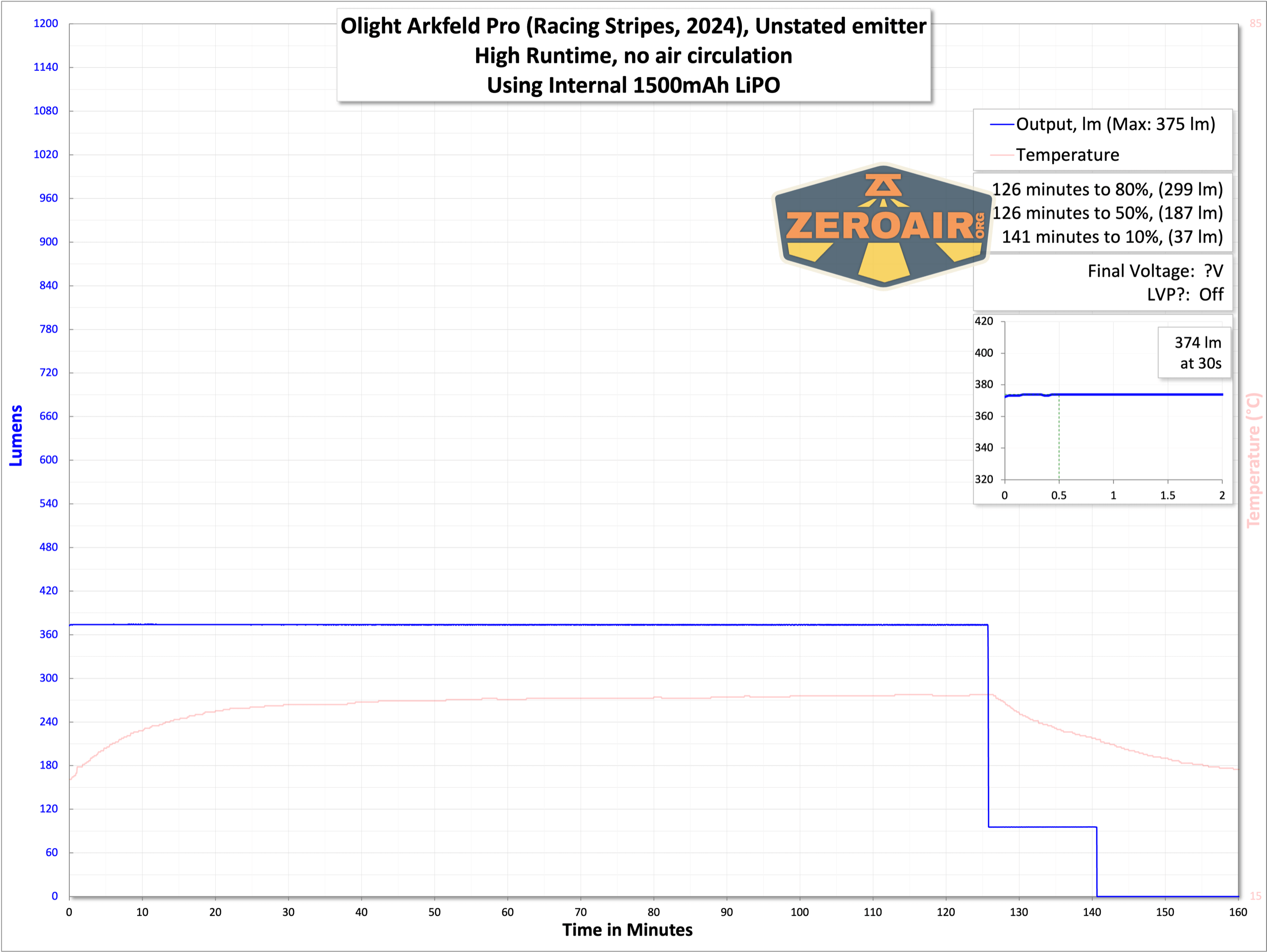 Olight doesn’t state what emitter is in the Arkfeld Pro EDC flashlight. I would guess it’s an Osram P9, but it doesn’t matter too much since we’ll see a characterization of the emitter below.