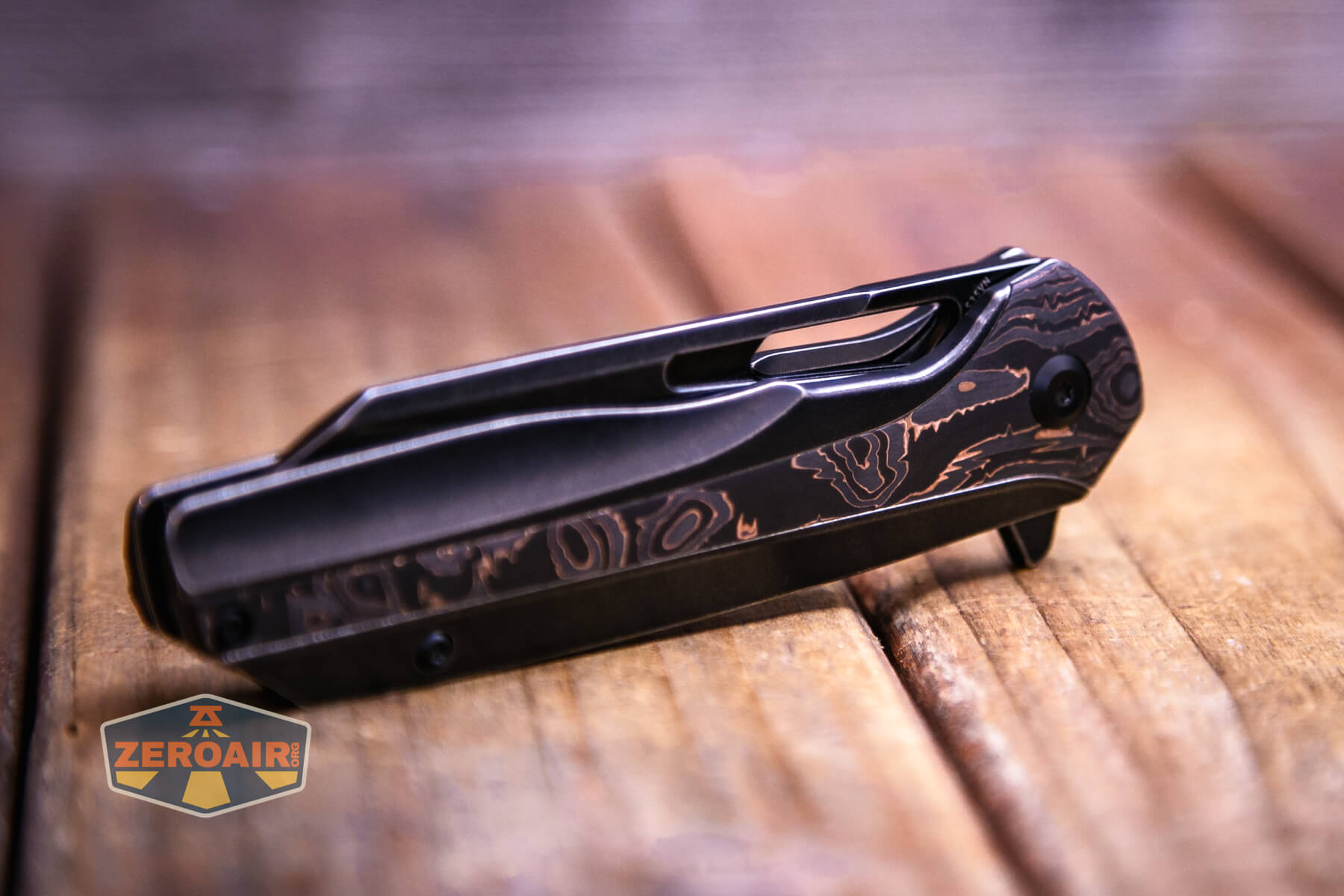 One side has blackwashed titanium and the other has a copper carbon fiber inlay. It’s a very nice finish!