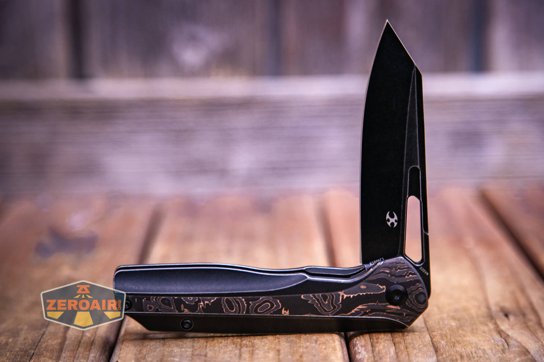The Kansept Shard blackwashed titanium knife offers copper carbon fiber and CPM-S35VN steel. A reverse tanto blade shape completes the package of this flipper.