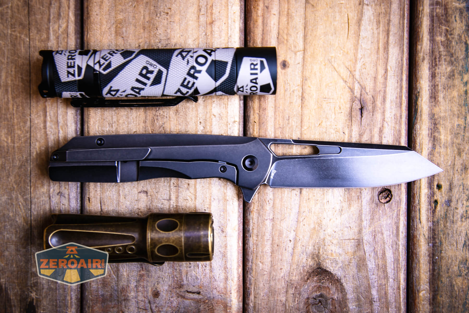 Also above is the Kansept Shard blackwashed titanium knifebeside a TorchLAB BOSS 35, an 18350 light. I reviewed the aluminum version of that light in both 35 and 70 formats. I also reviewed that specific edition, the “Oveready BOSS FT Collector Vintage Brass” 35. I love it!