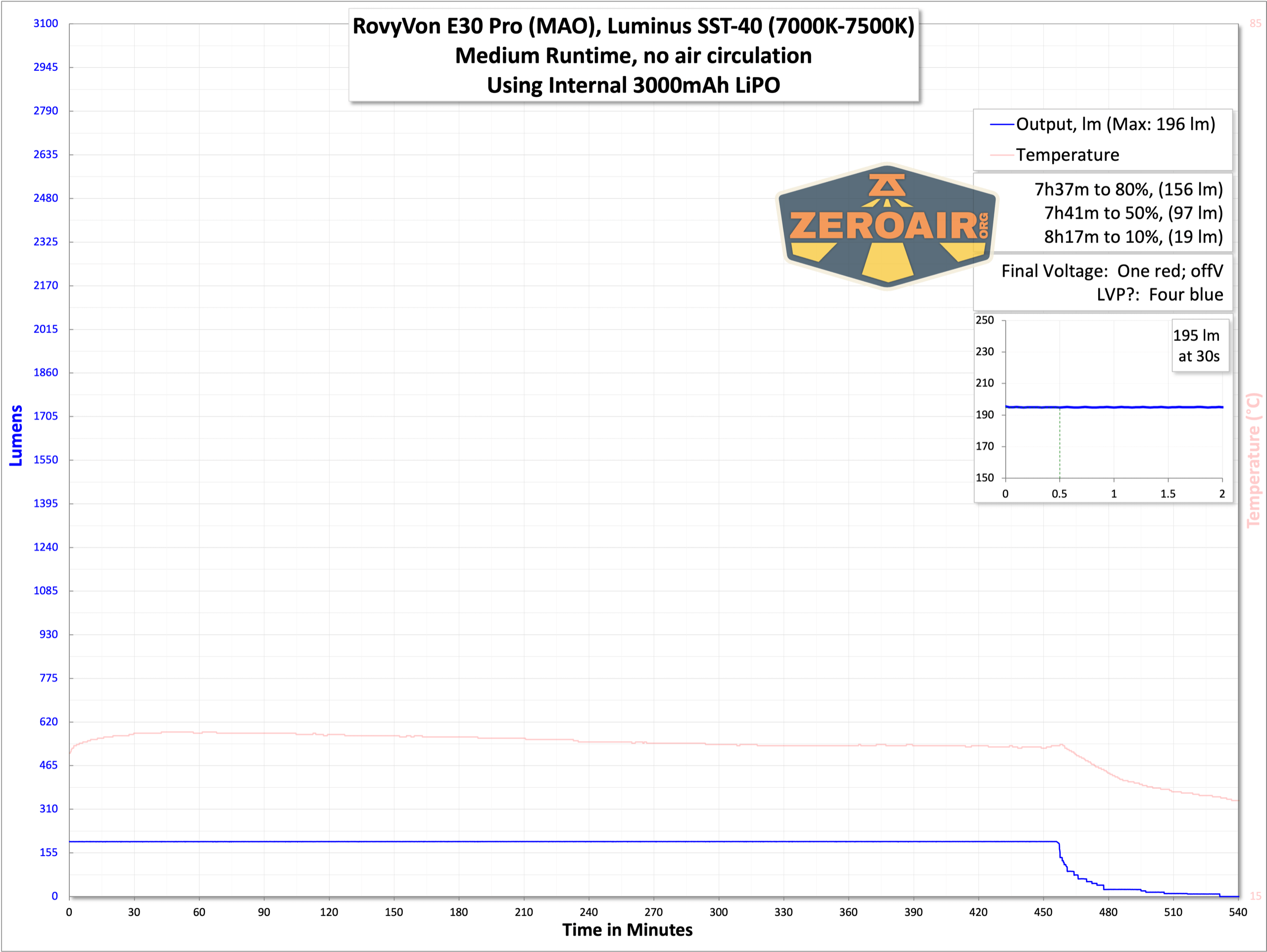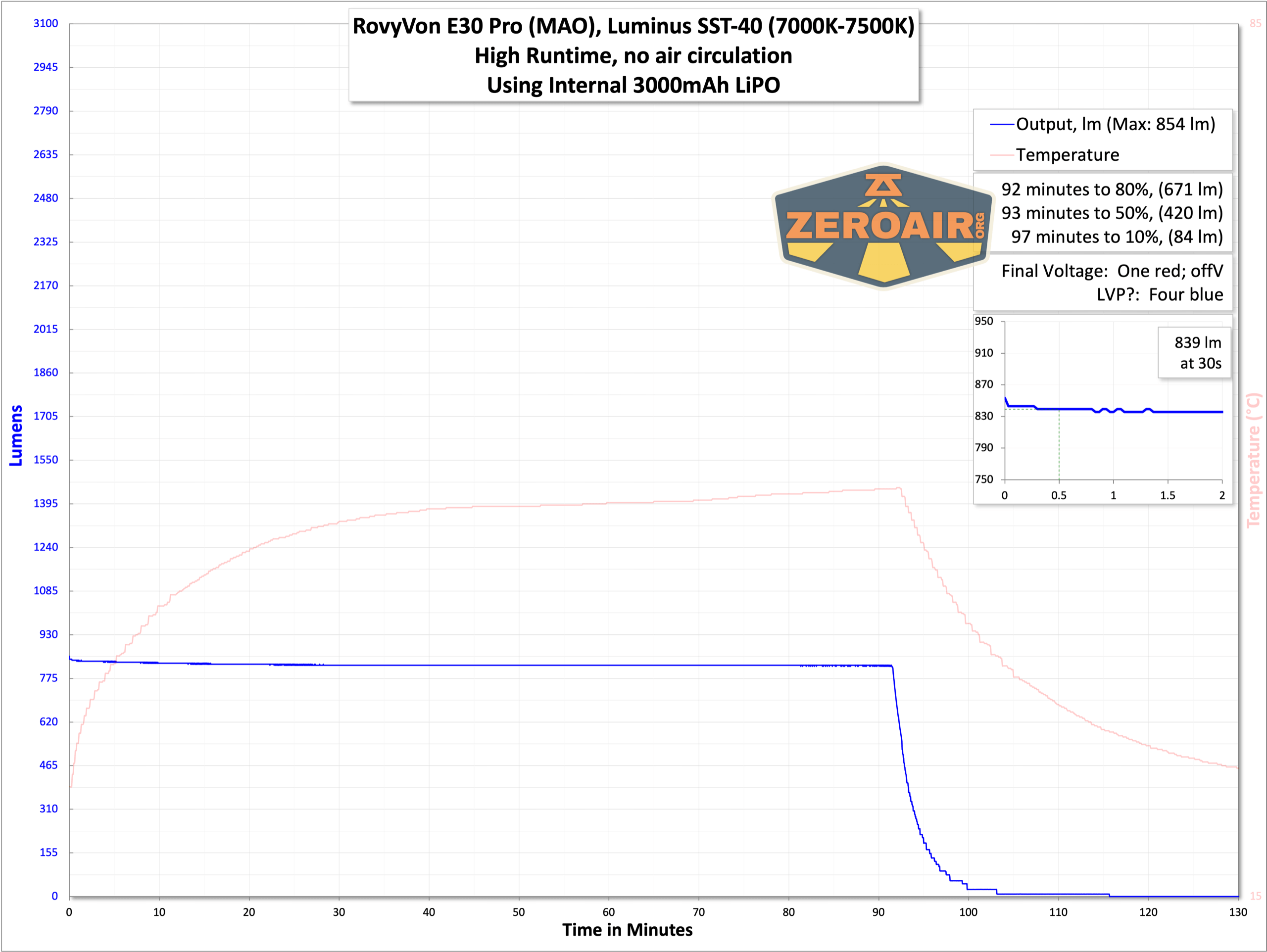 High output is much more stable, holding over 800 lumens for around 1.5 hours.