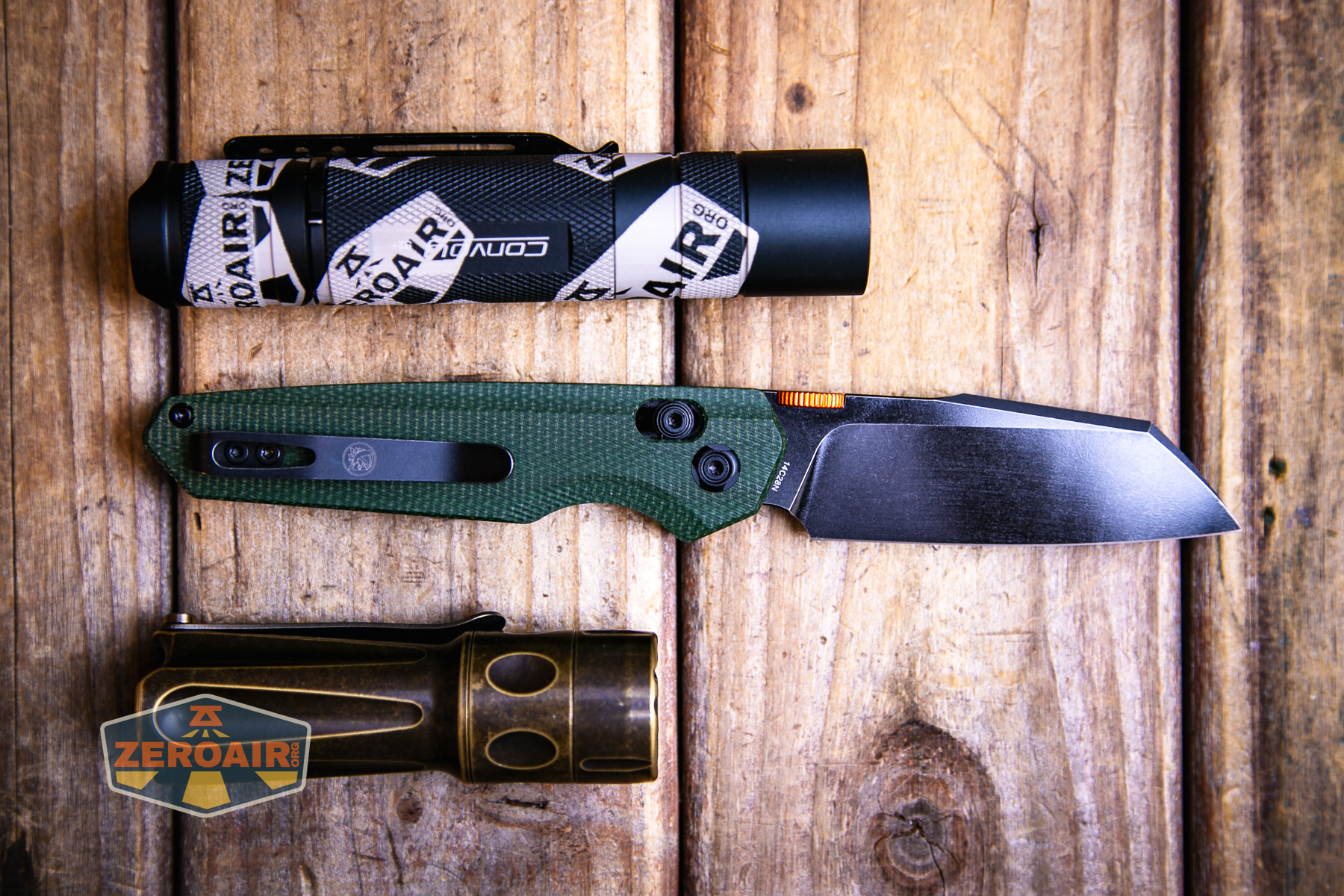 Below you can see the Vosteed Talarurus micarta knife with the venerable Convoy S2+. The version below is a custom laser-engraved Convoy S2+ host by GadgetConnections.com. I did a full post on an engraved orange host right here! Or go straight to GadgetConnections.com to buy your Convoy S2+ now!