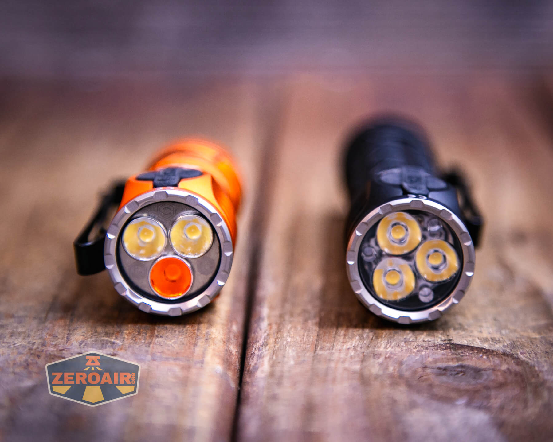 One more thing to note about these reflectors. The 2x white emitters have different reflectors, too! One is smooth and will offer superior throw. One is orange peel and will diffuse the beam for great smoothness and diminishing of artifacts. It’s a very good setup.