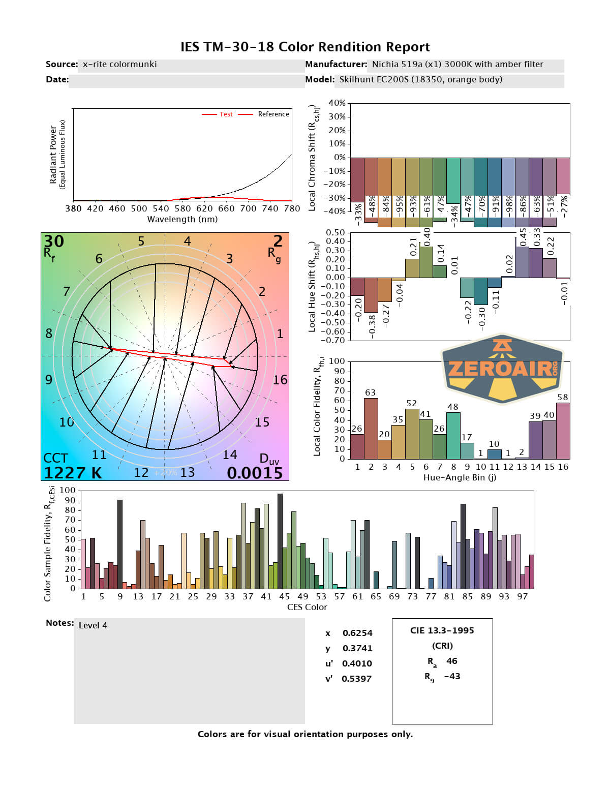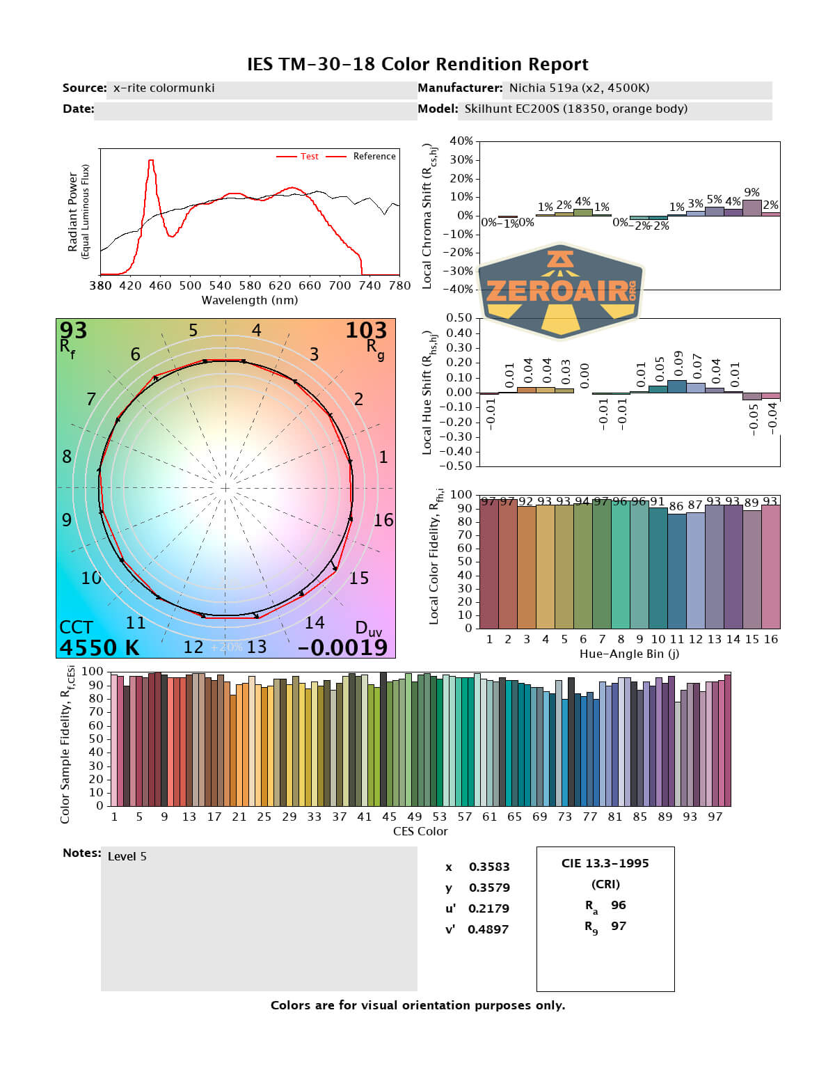 As you should expect from the incredible Nichia 519a emitters, the output is fantastic. It’s very nearly on the BBL (which is good, that’s what you want) and also has the “as claimed” CCT (ranging from 4400K to around 4600K.) CRI is also very high, at over 96.