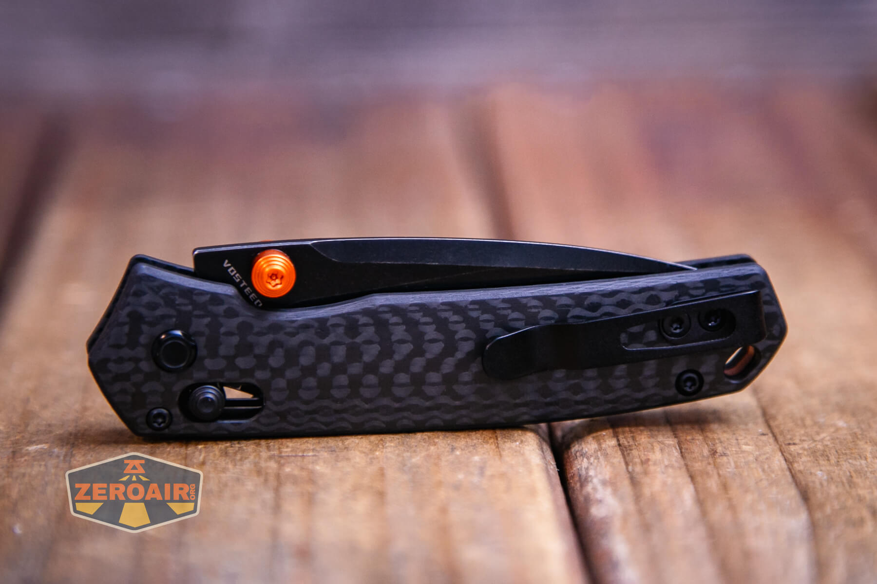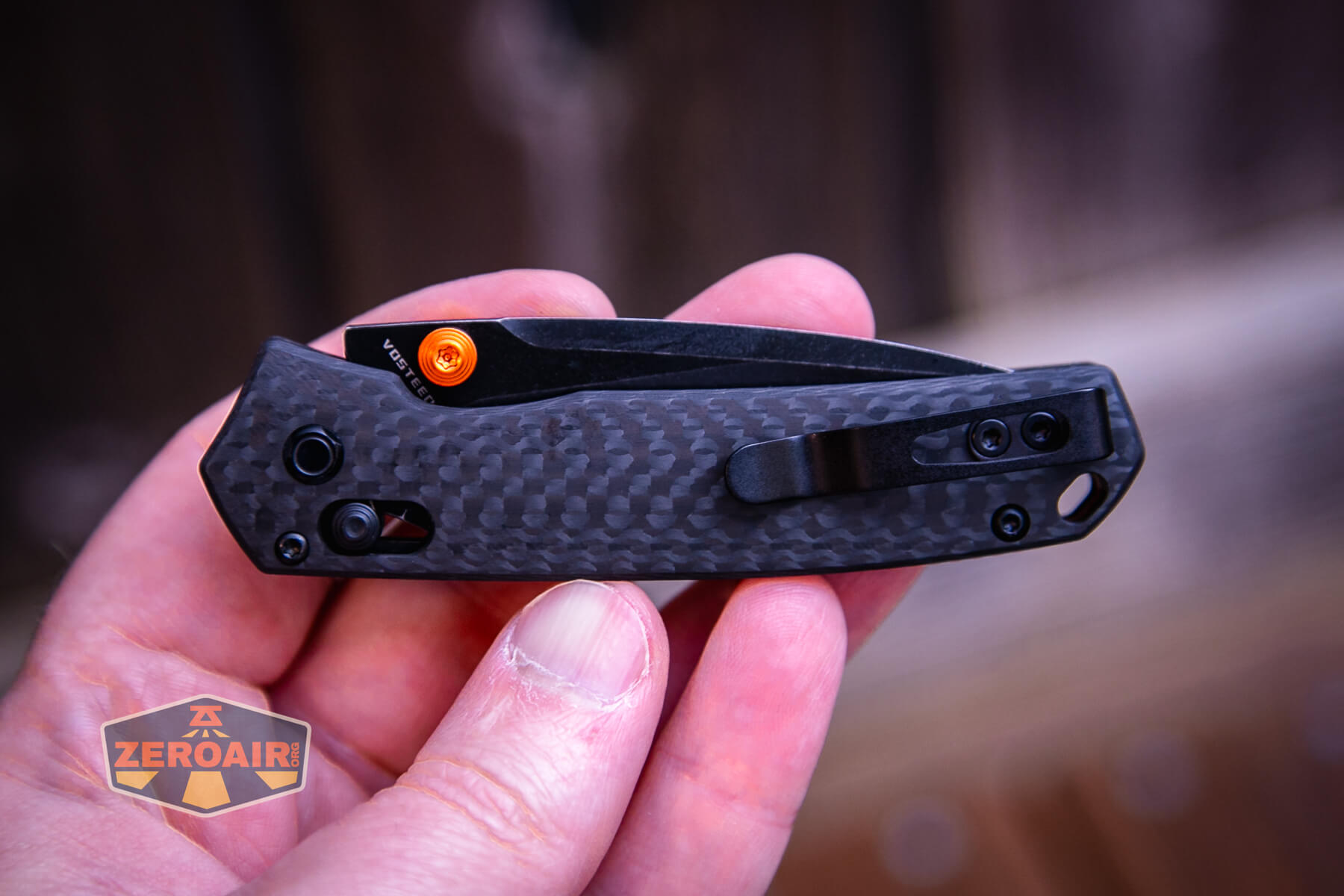 No matter what other knife the Vosteed Mini Psyop is like, it stands on its own for build quality. I love the carbon fiber. It’s clearly carbon fiber and not a printing or dip or whatever. On the scale edges, you can see the layers of carbon fiber! There’s just the most subtle texture of carbon fiber, too.