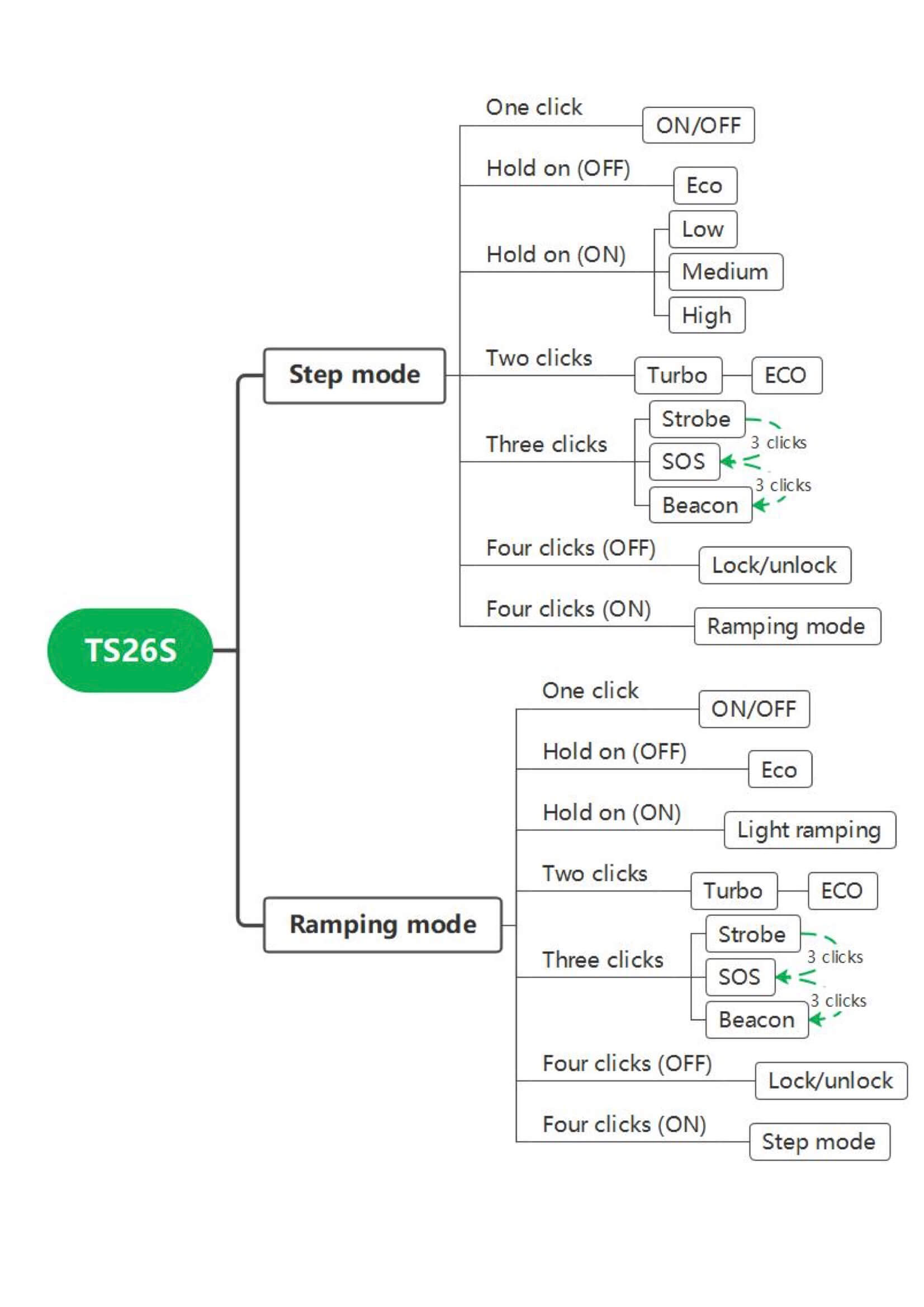 | Lockout | Click | Main emitter flashes 2x to indicate lockout |