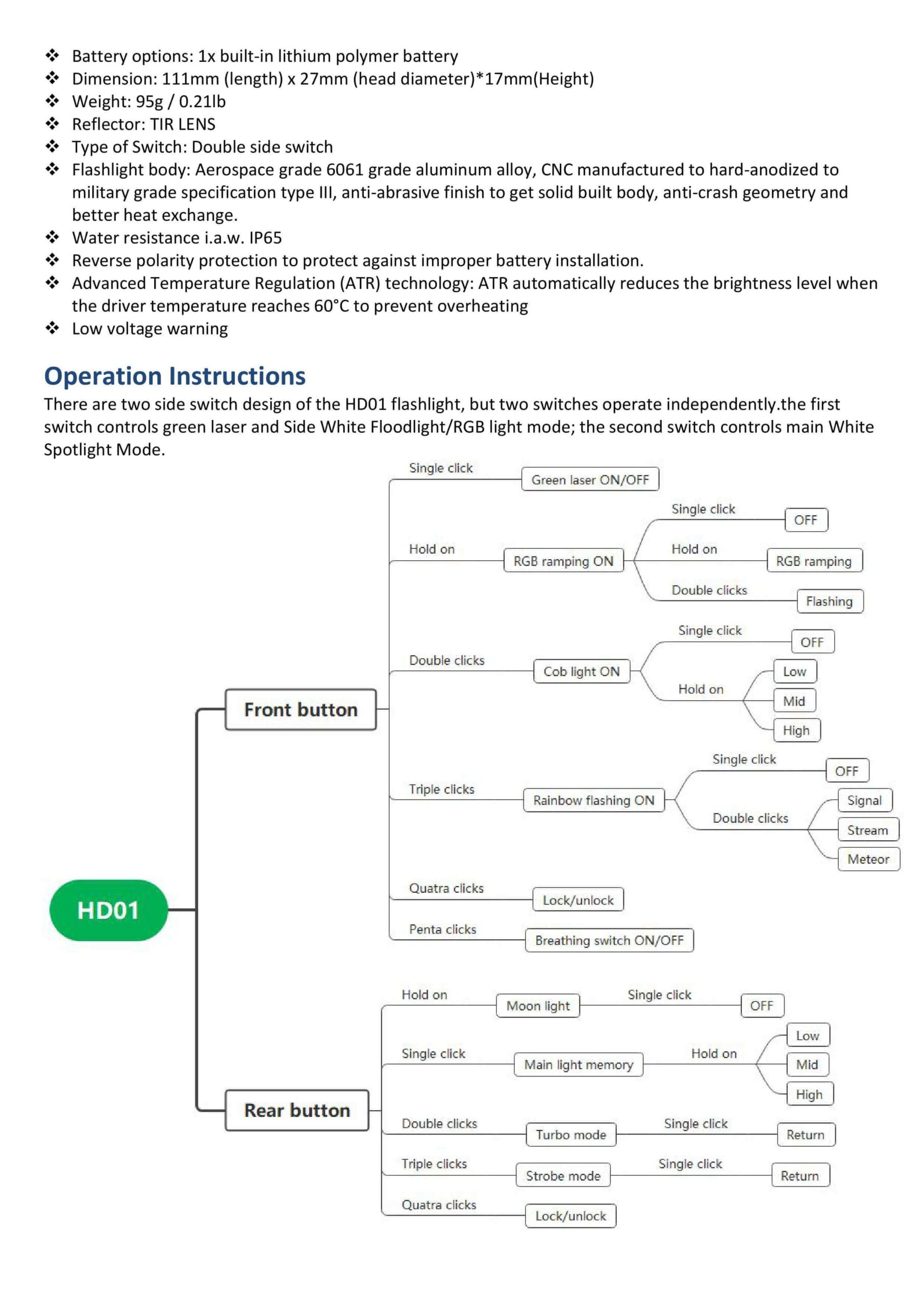 | Rainbow flashing | Click front button | Off |