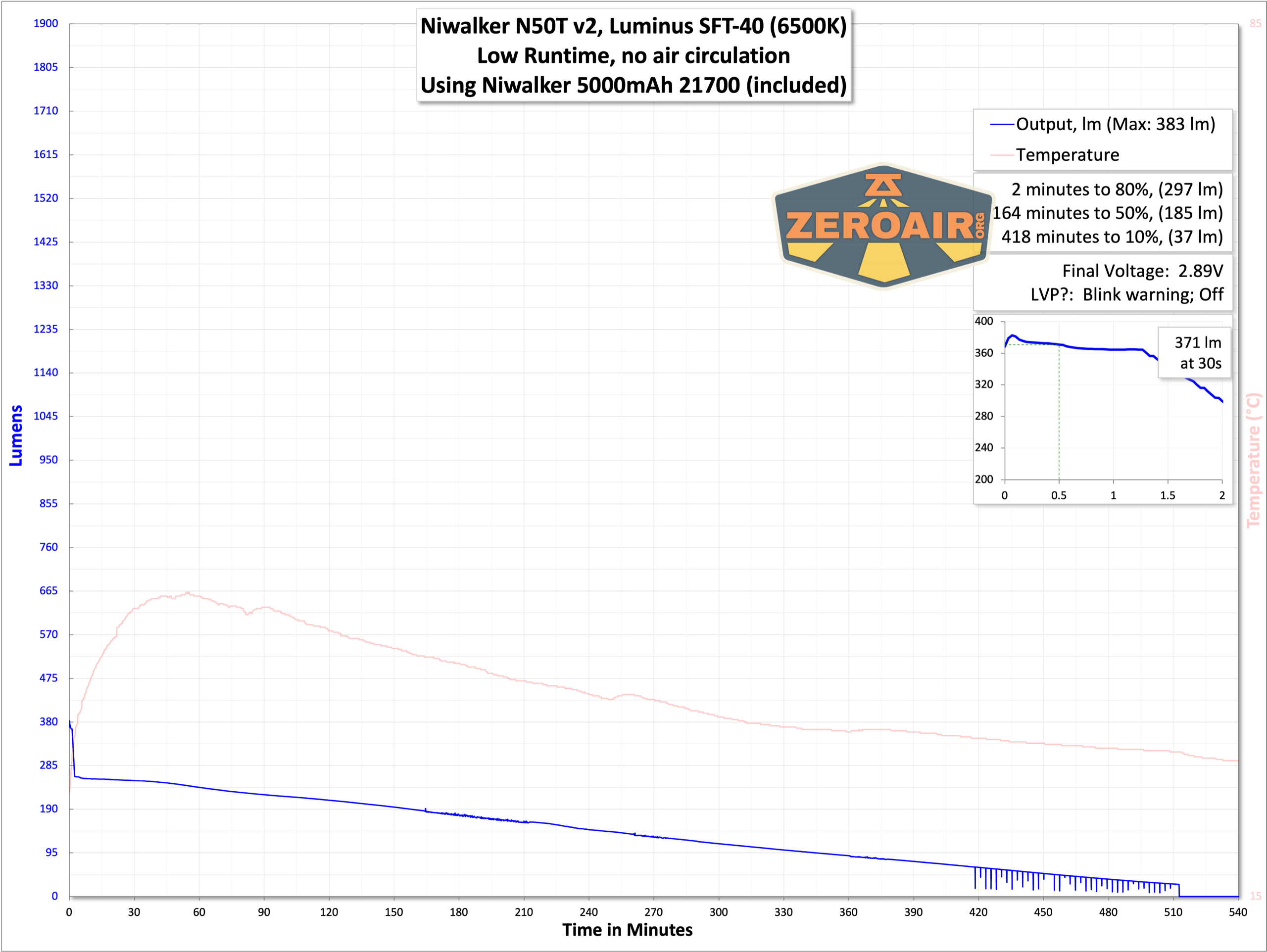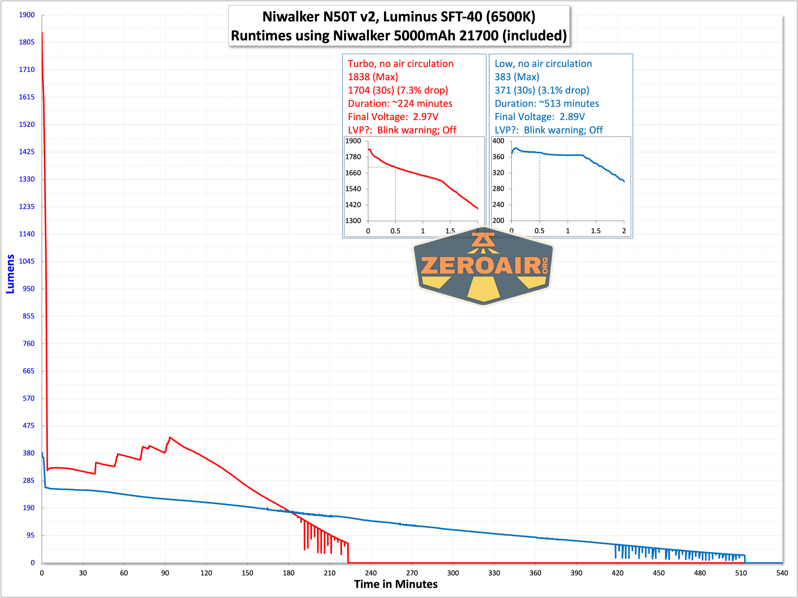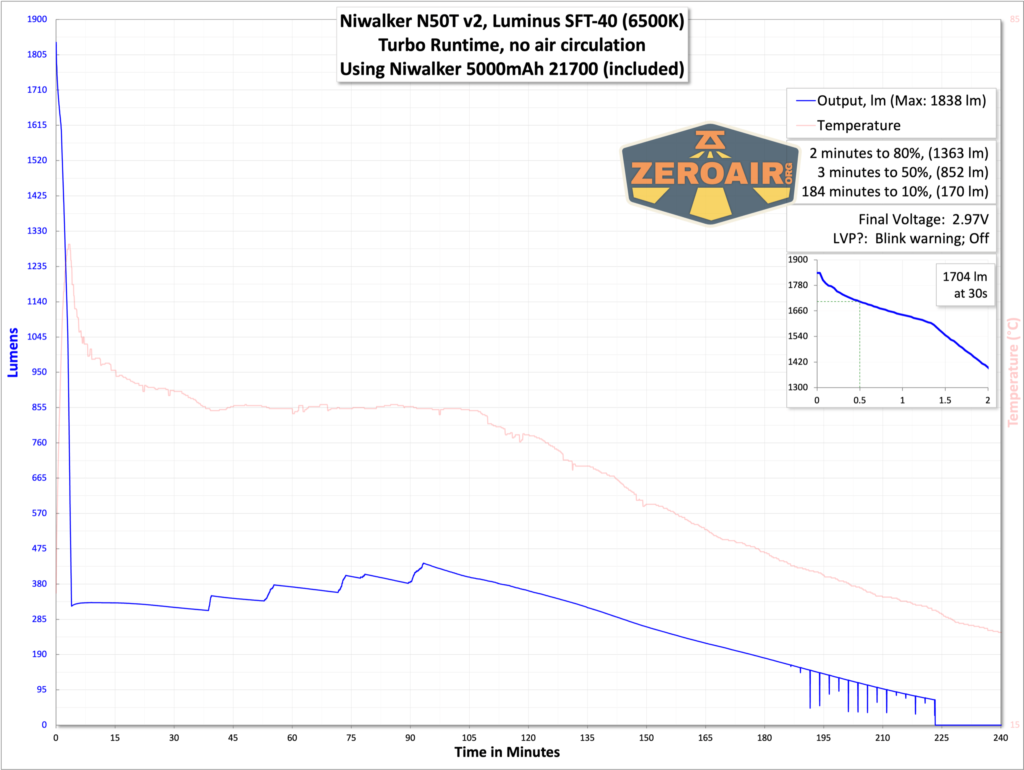 There are just two modes, and I’ve tested both. You can see the graphs below. Toward the end of the cell charge, the light blinks. You’ll noticed this, surely, but the light will also shut off around 3V to protect the cell. (That might not be your desired feature in a tactical light – that’s for you to decide!)