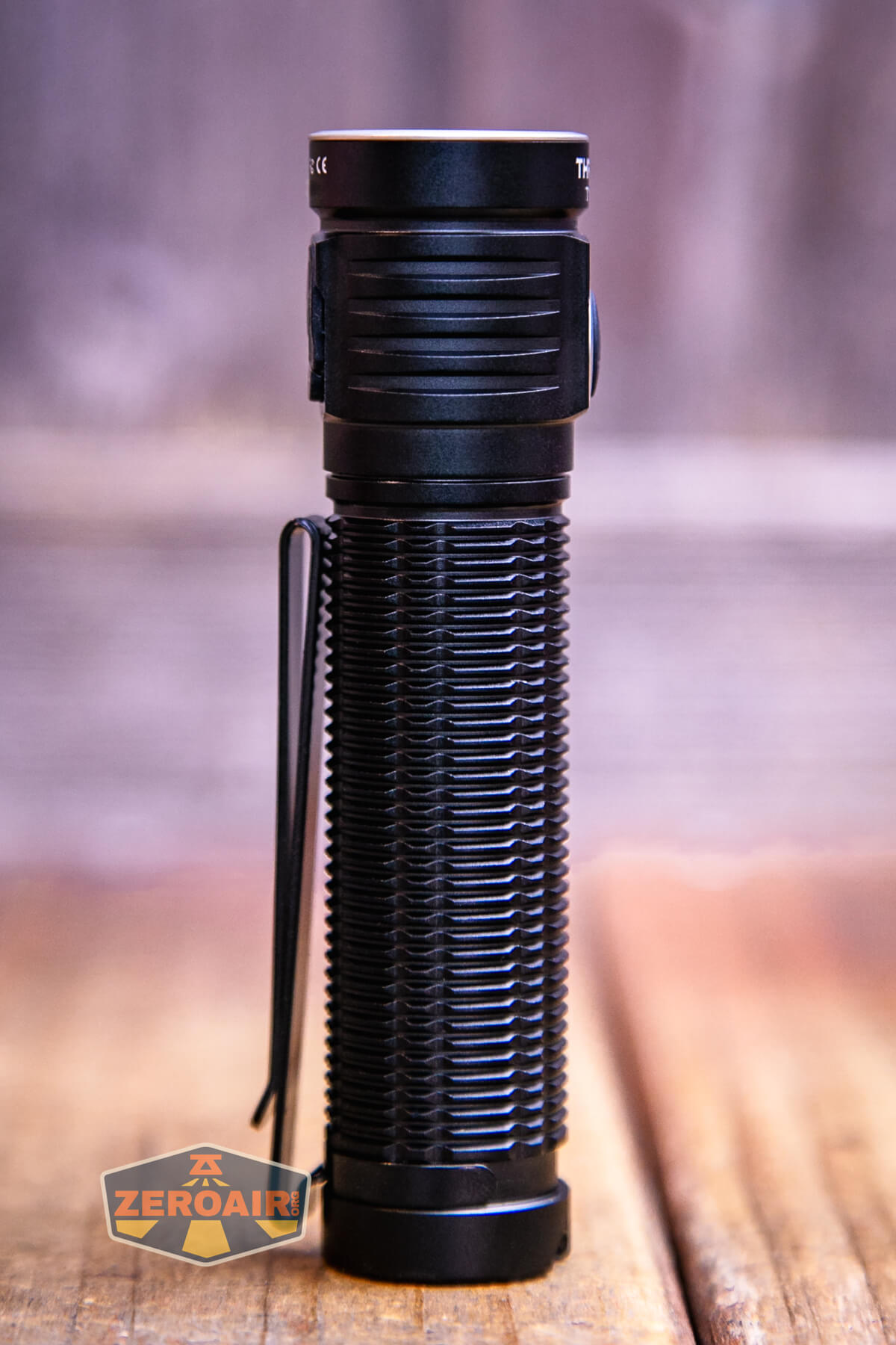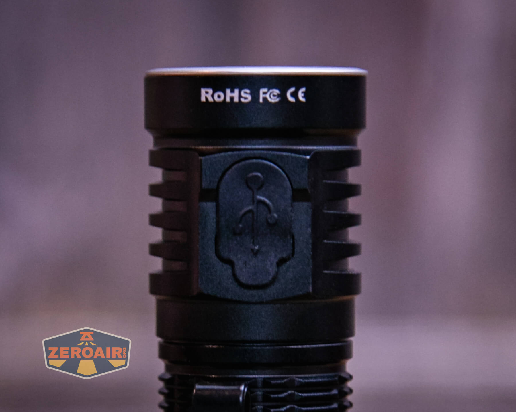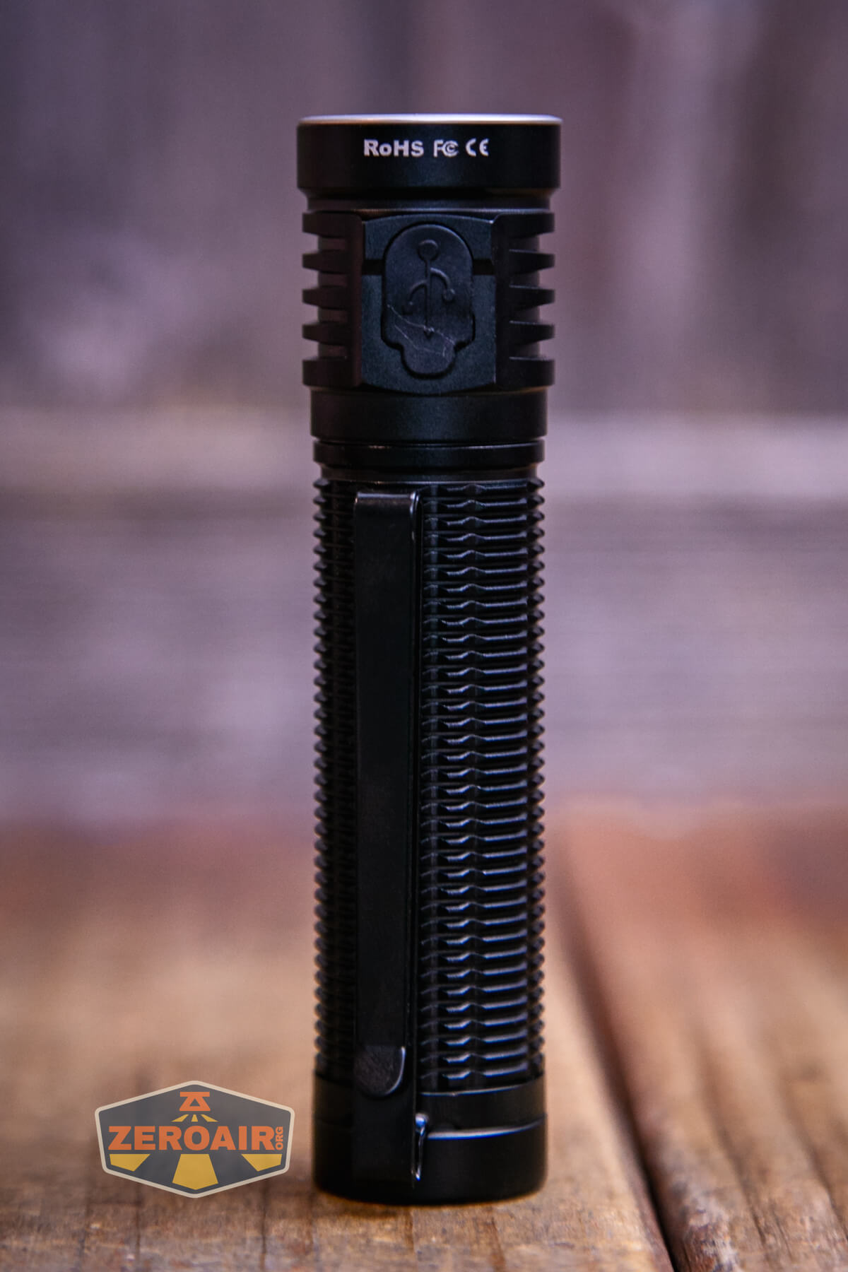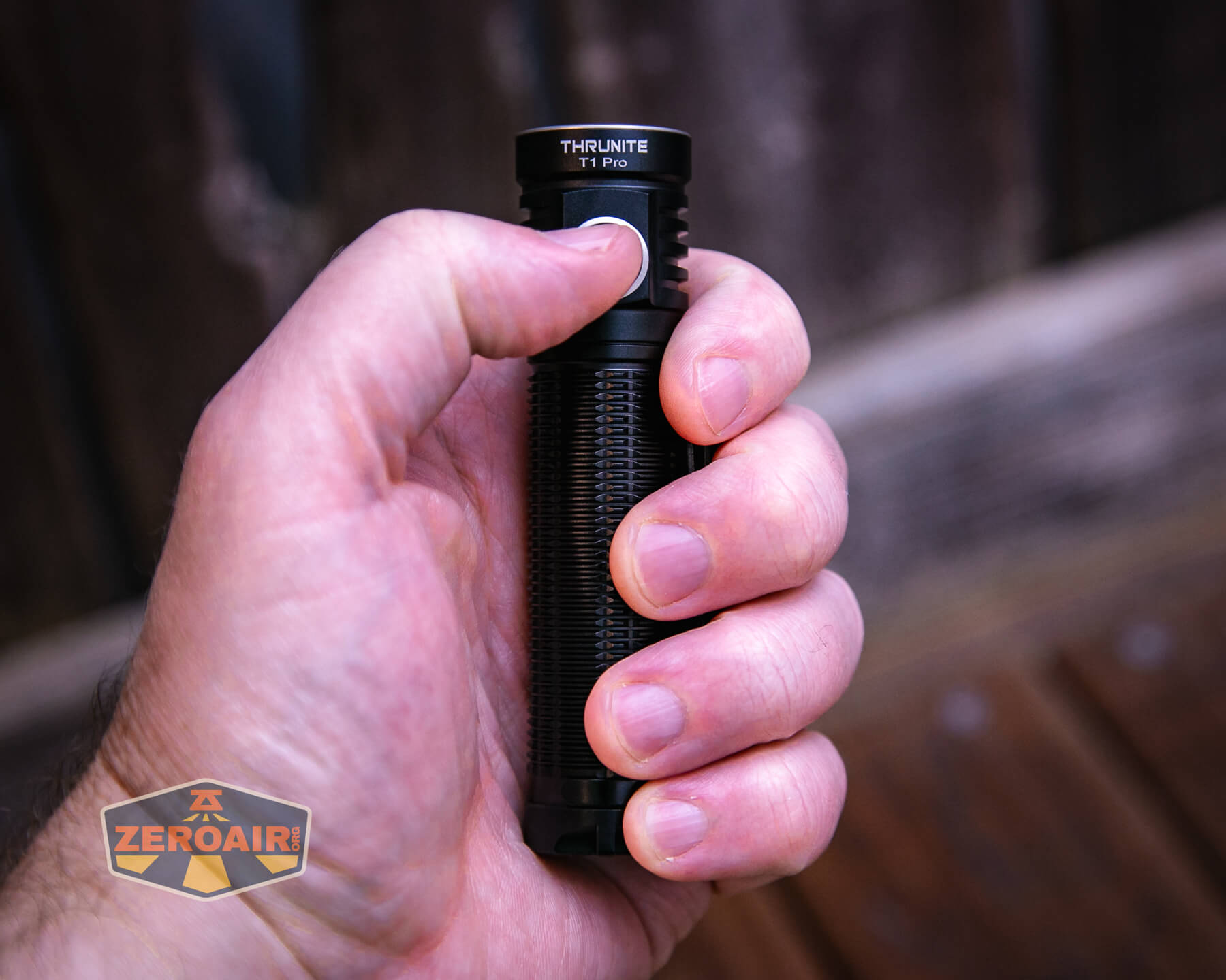 There’s a single switch on the Thrunite T1 Pro flashlight. It’s an indicating e-switch on the head. The button has a black look but really seems to be an opaque gray – of course, since it’s also an indicating switch. It’s barely possible by feel to differentiate the switch and charge port without looking.