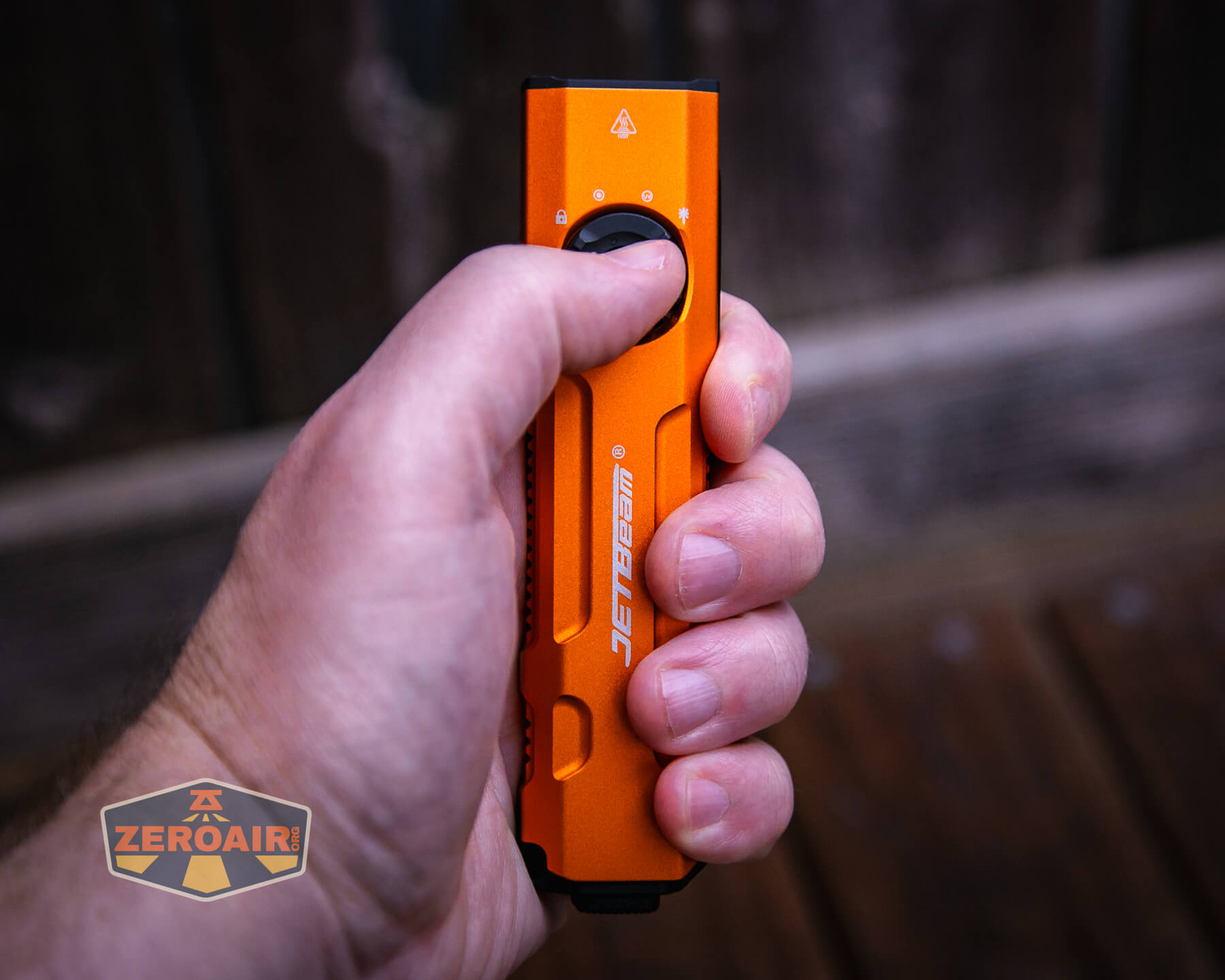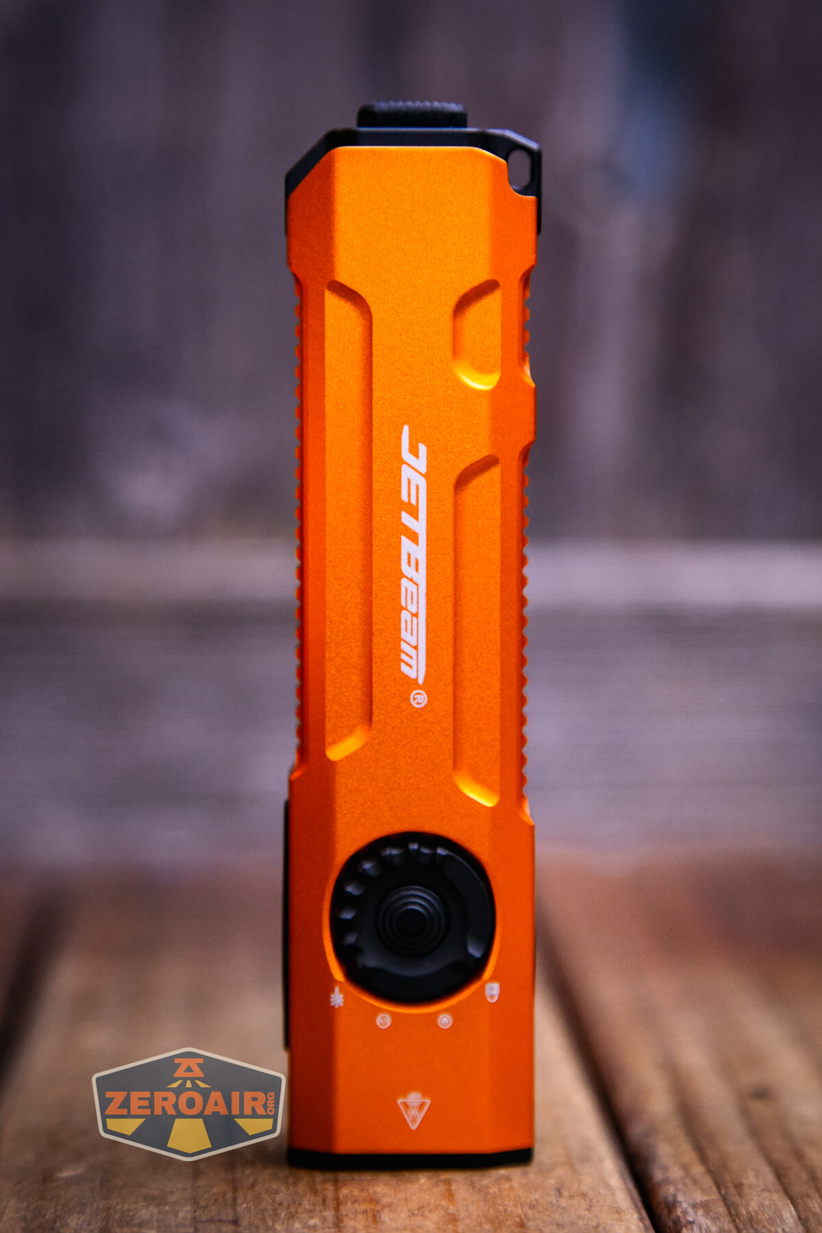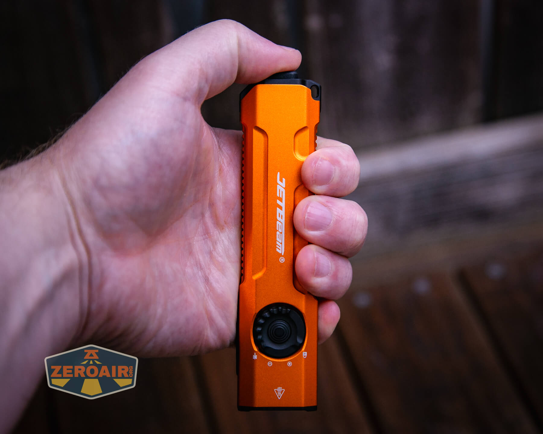 I feel silly gushing about the charging port, but I really do like not having to fool with a charging port cover. Sure, there are plenty of fine charge port covers… But since this one is waterproof and I’m not terribly likely to get a ton of dust in there, this is nice. The color is also great! JETBeam really nailed the orange here (probably better in person than the photos would indicate). This UV version could stand to have 5 white modes just like the non-UV. Lower would be fine. Even a middle mode somewhere would be fine. The tactical switch is something I haven’t seen in a slim/flat light like this before, and it seems well-implemented. So in total, this is a very interesting light that’s definitely worth considering!