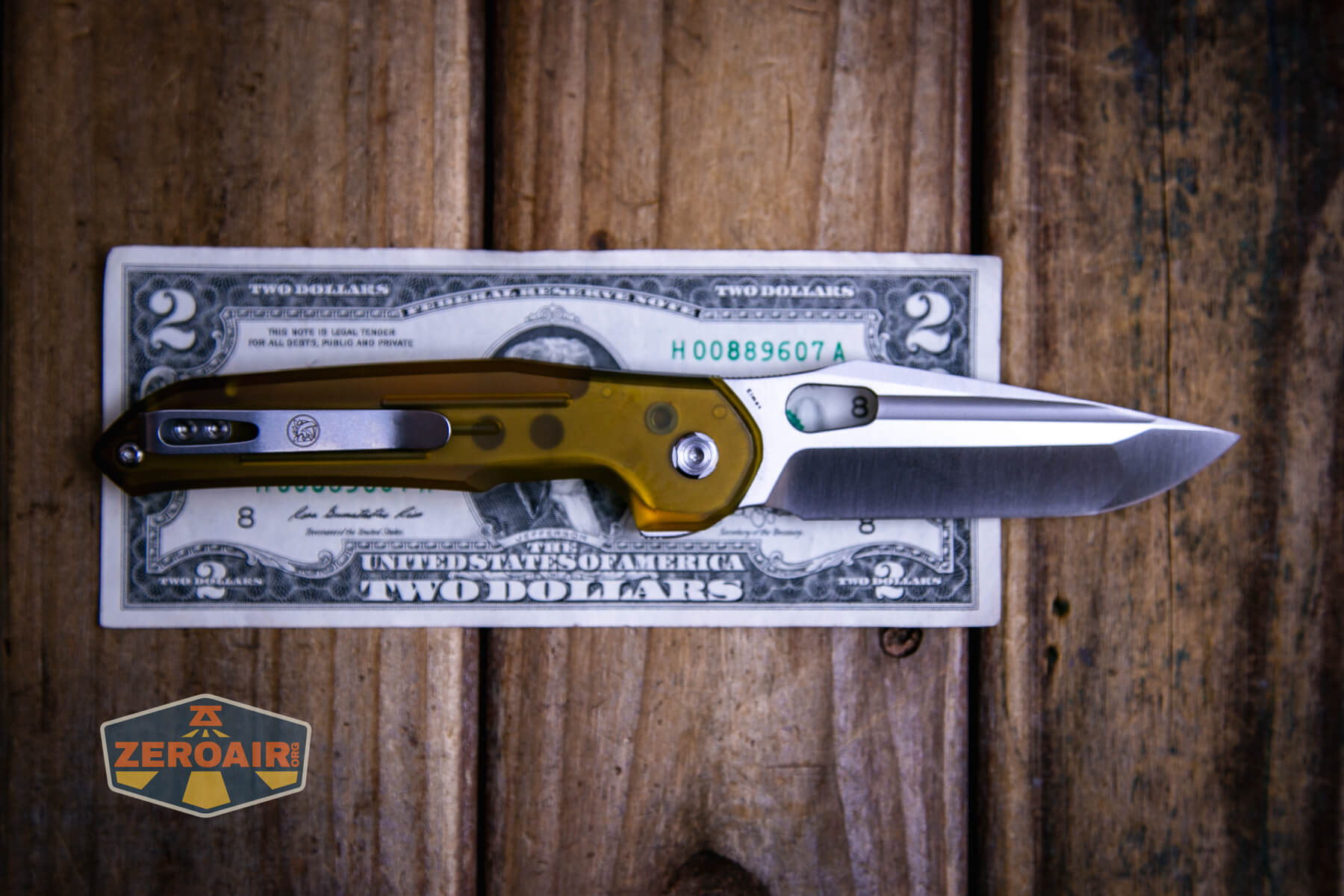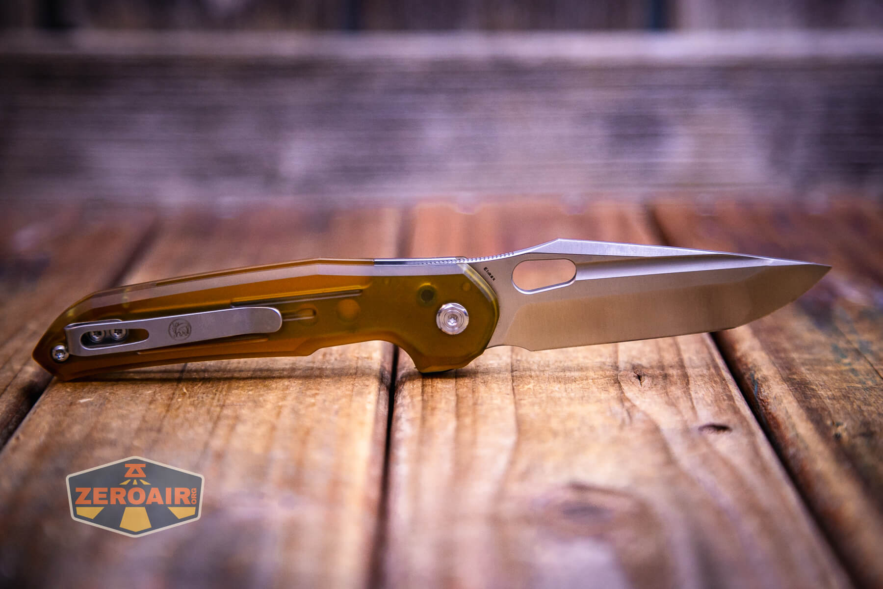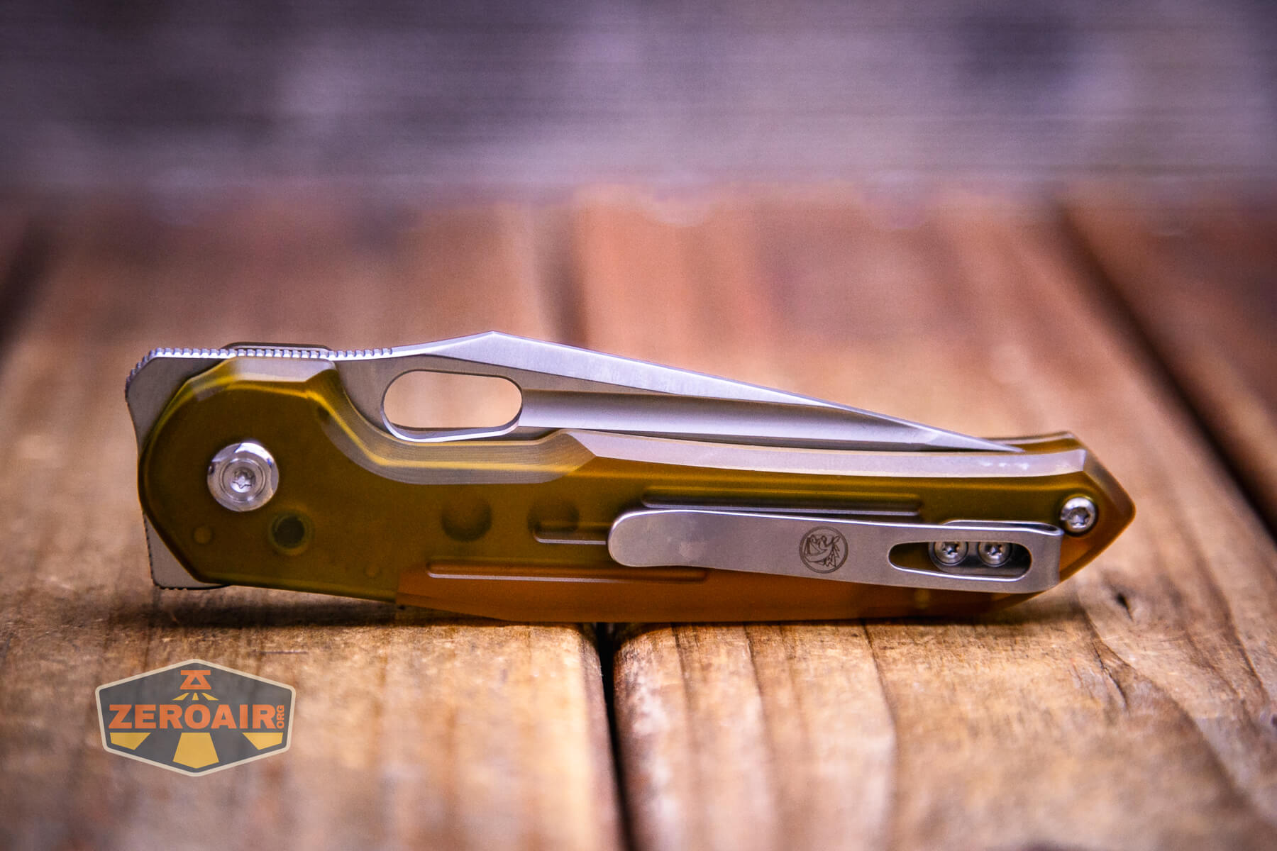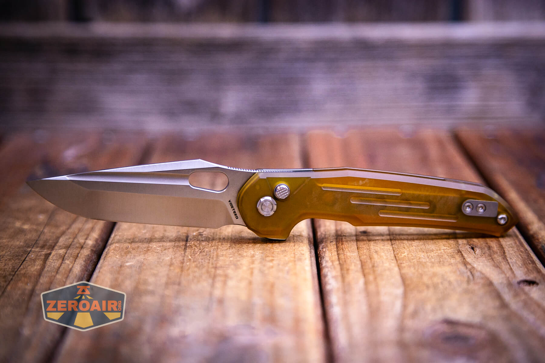 If you like tanto blades and slim knives, the Vosteed Thunderbird Ultem knife is a solid choice. The Trek lock seems very secure and is also easy to actuate. The Thunderbird offers many opening options, giving you the choice of thumb or index finger flipping and also flicking with the thumbhole. It’s very versatile! Probably most importantly, the PEI or Ultem scales on this knife are great! I love this material, and it’s used well in this Thunderbird!