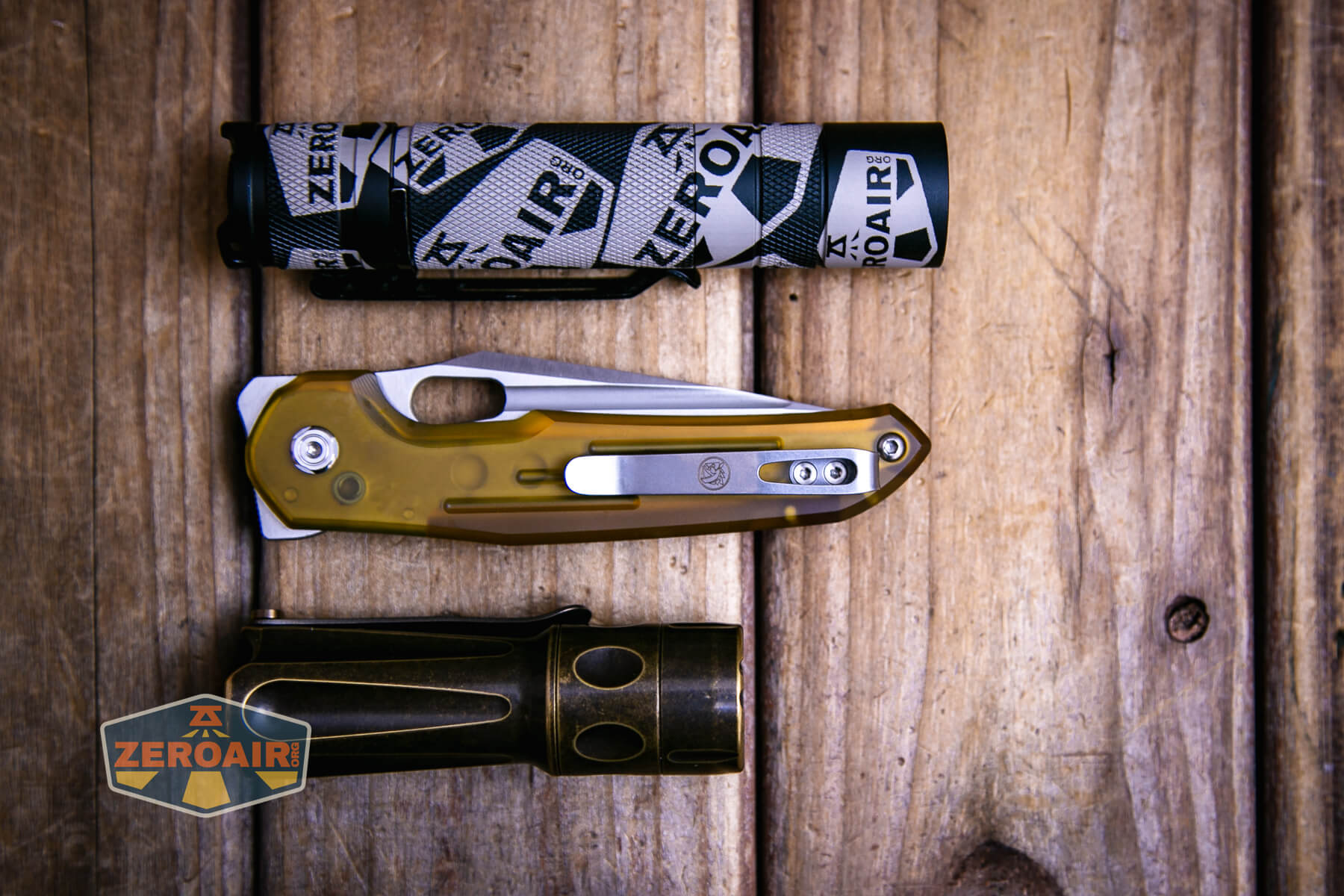 Also above is the knife beside a TorchLAB BOSS 35, an 18350 light. I reviewed the aluminum version of that light in both 35 and 70 formats. I also reviewed that specific edition, the “Oveready BOSS FT Collector Vintage Brass” 35. I love it!