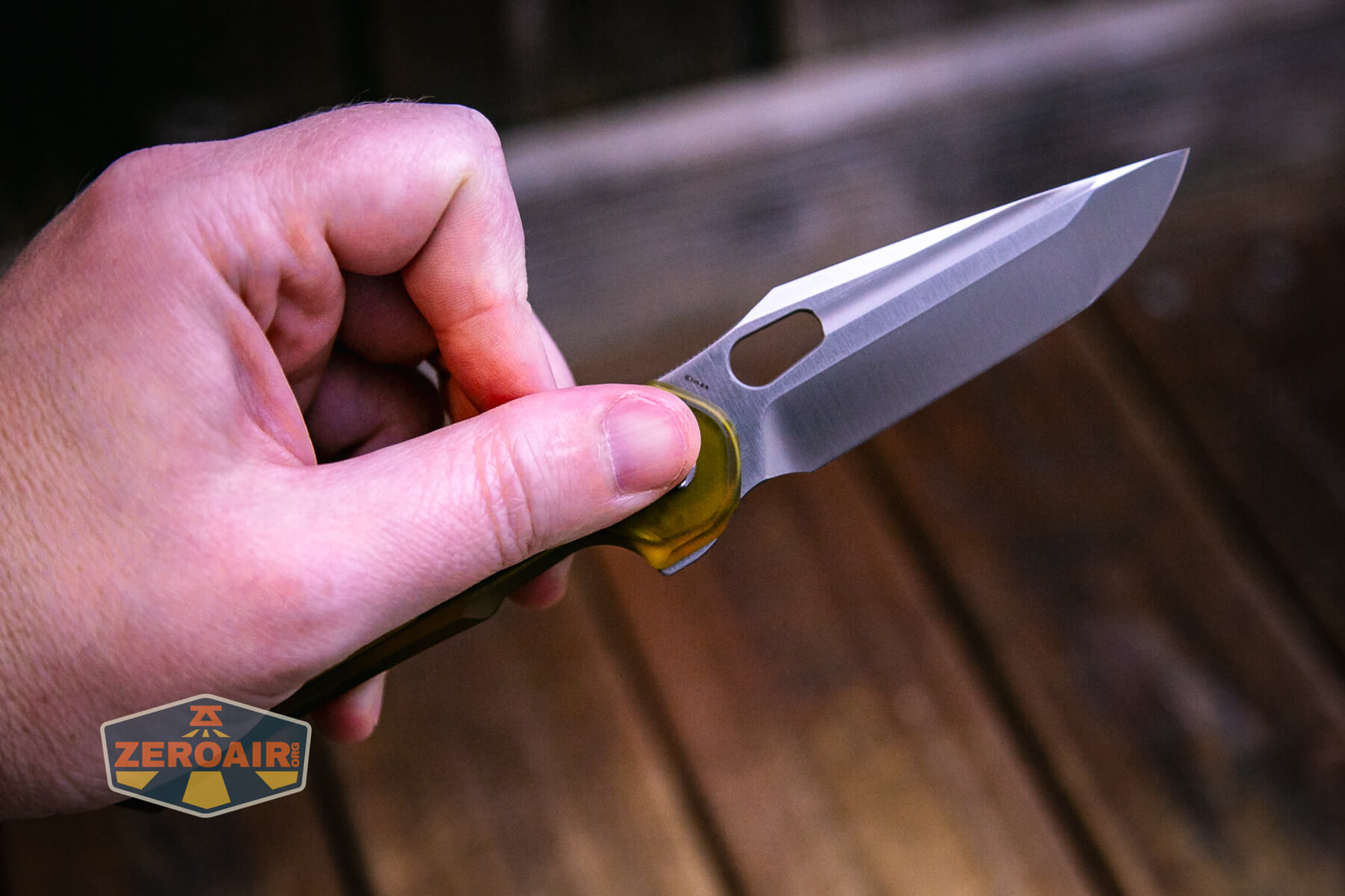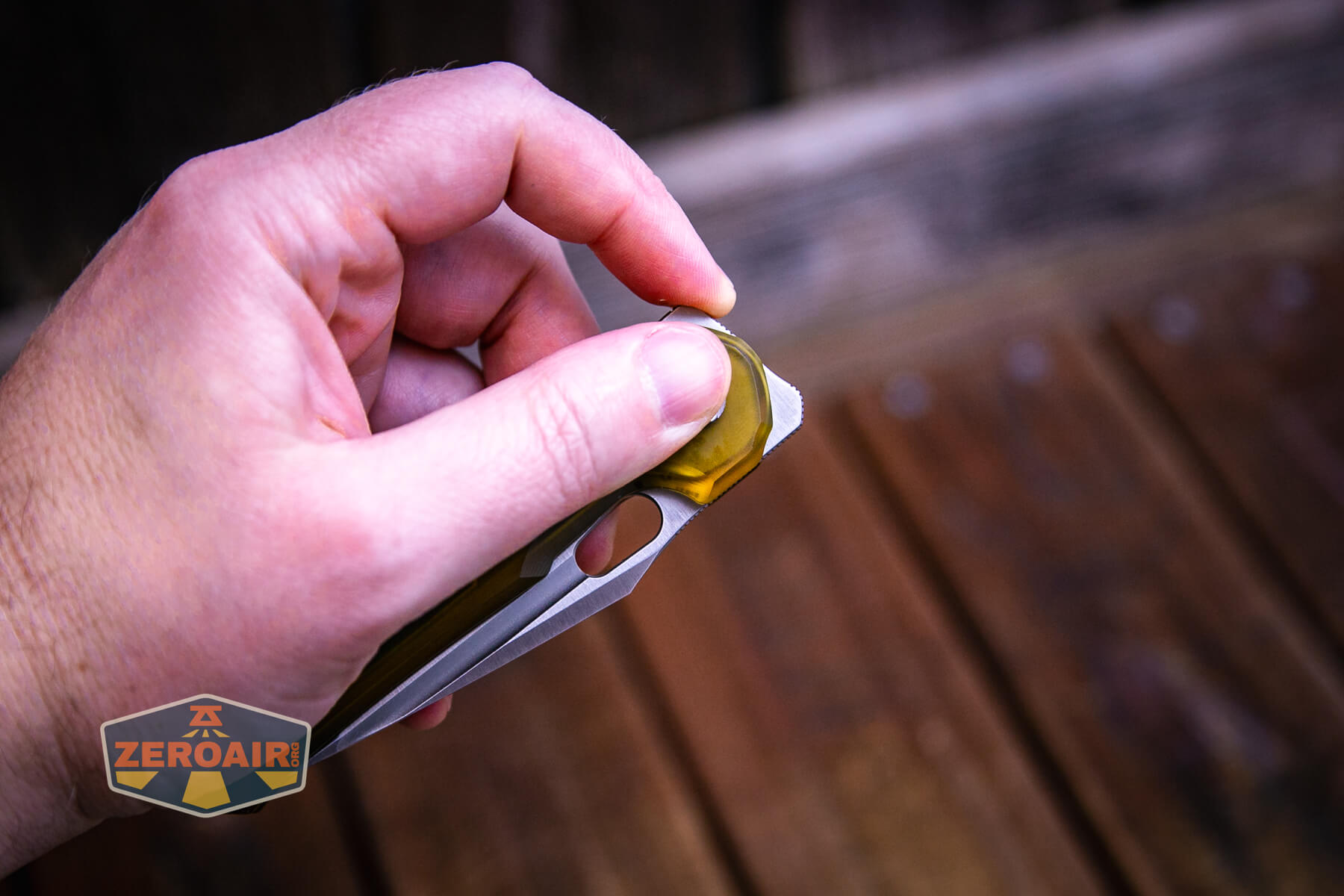 Opening the Vosteed Thunderbird Ultem knife is done by either using this thumb flipper tab or one of the ambidextrous thumb holes in the blade. You can even open it as a front flipper, too! Plenty of options…