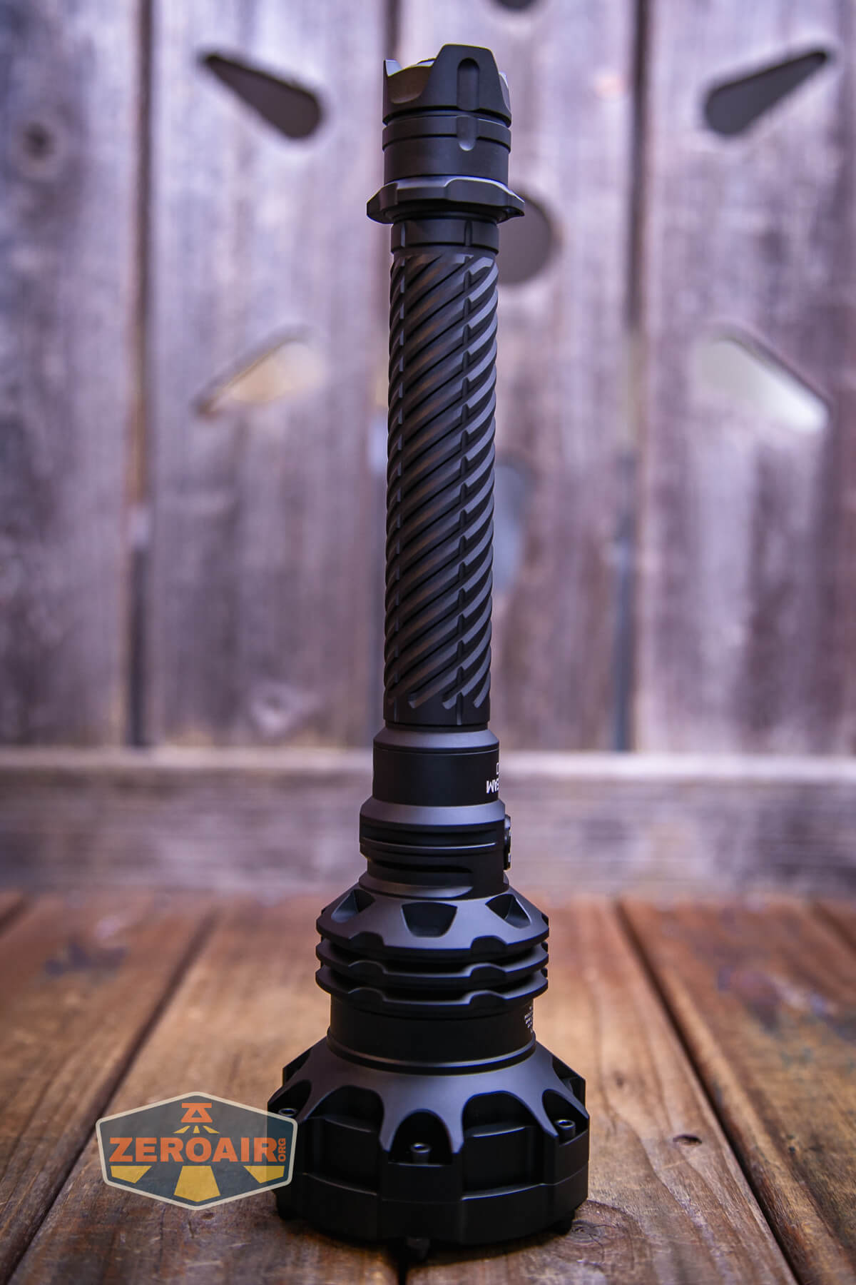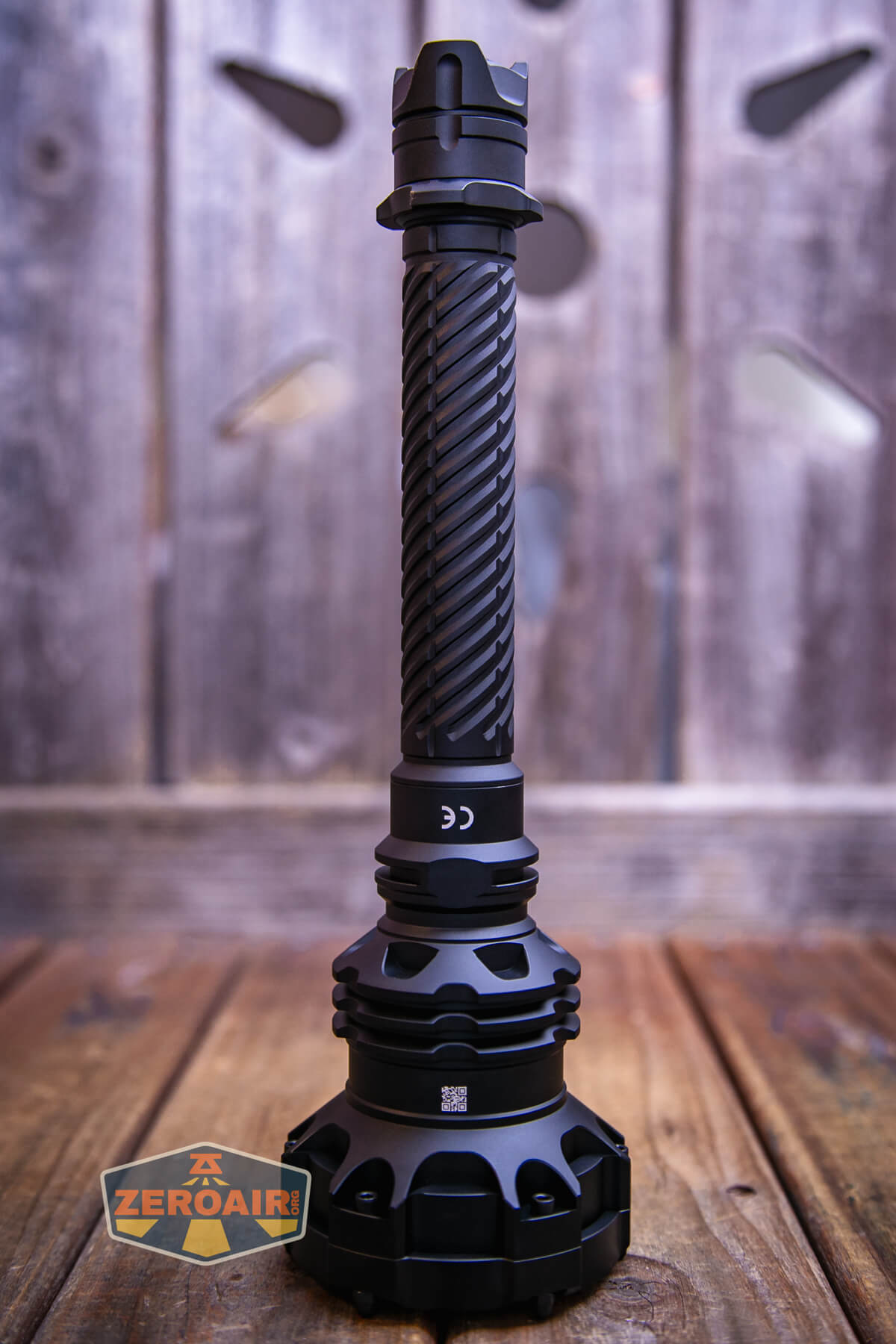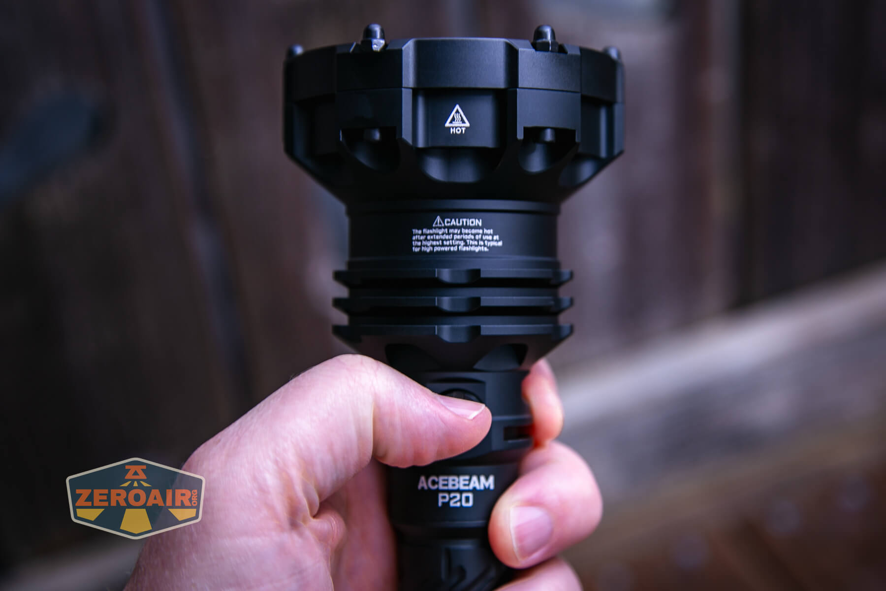 There’s a nice tripod around the switch, so despite being top-heavy and big, the Acebeam P20 flashlight will still tailstand.
