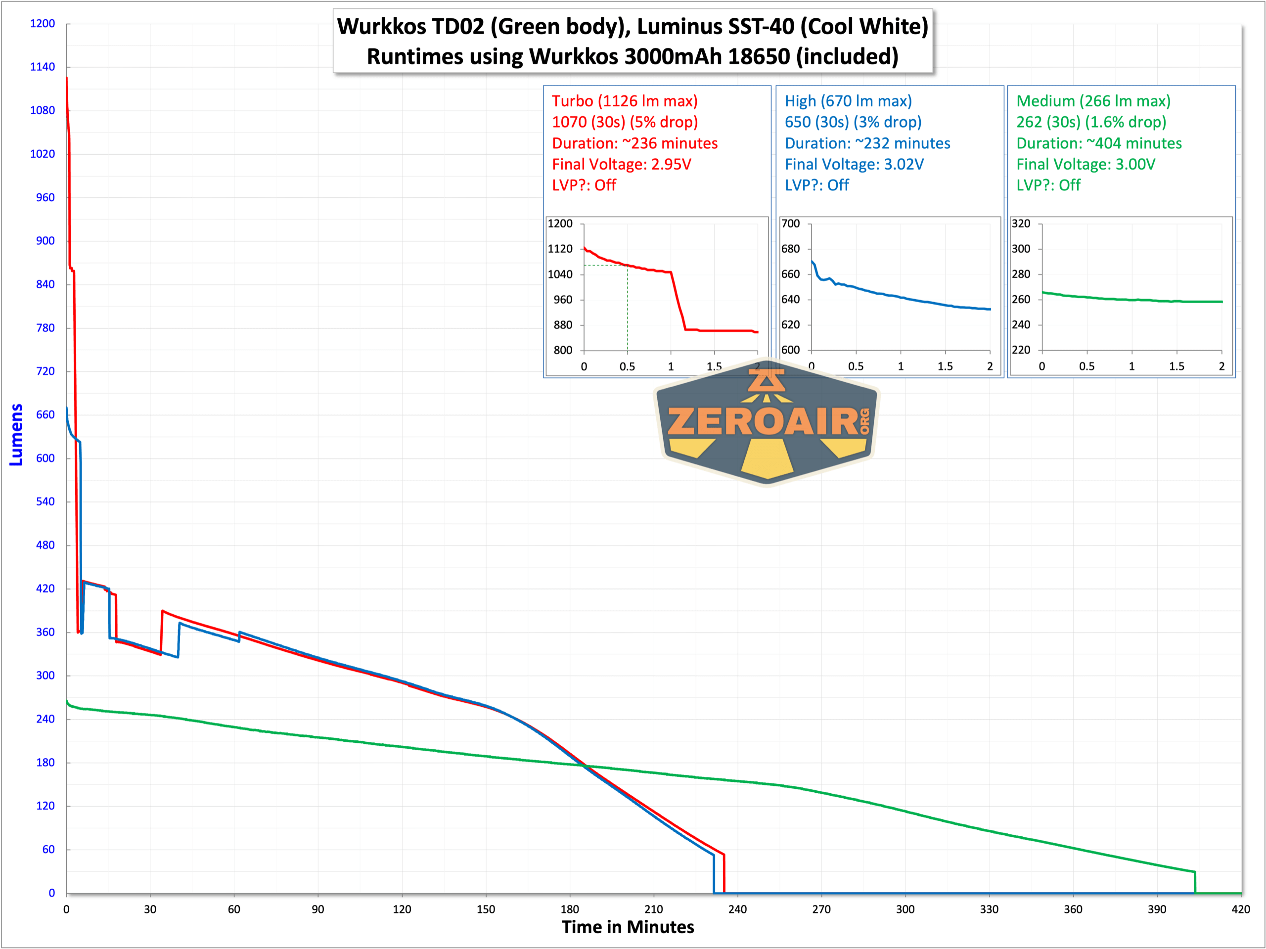 You might notice a tiny change in the three runtime charts below. I added a little label for what throw you could expect for that lumen value. This is just a calculation and it’s based on the cd/lm value that’s been included in The Big Table for a long while now. Please comment below what you think of this data point. It’s a bit of a pain to include and if you were ever interested in it you probably already inferred it from checking the cd/lm and calculating throw. (Ok that’s a bit of a stretch! I do know you all are smart, though!)