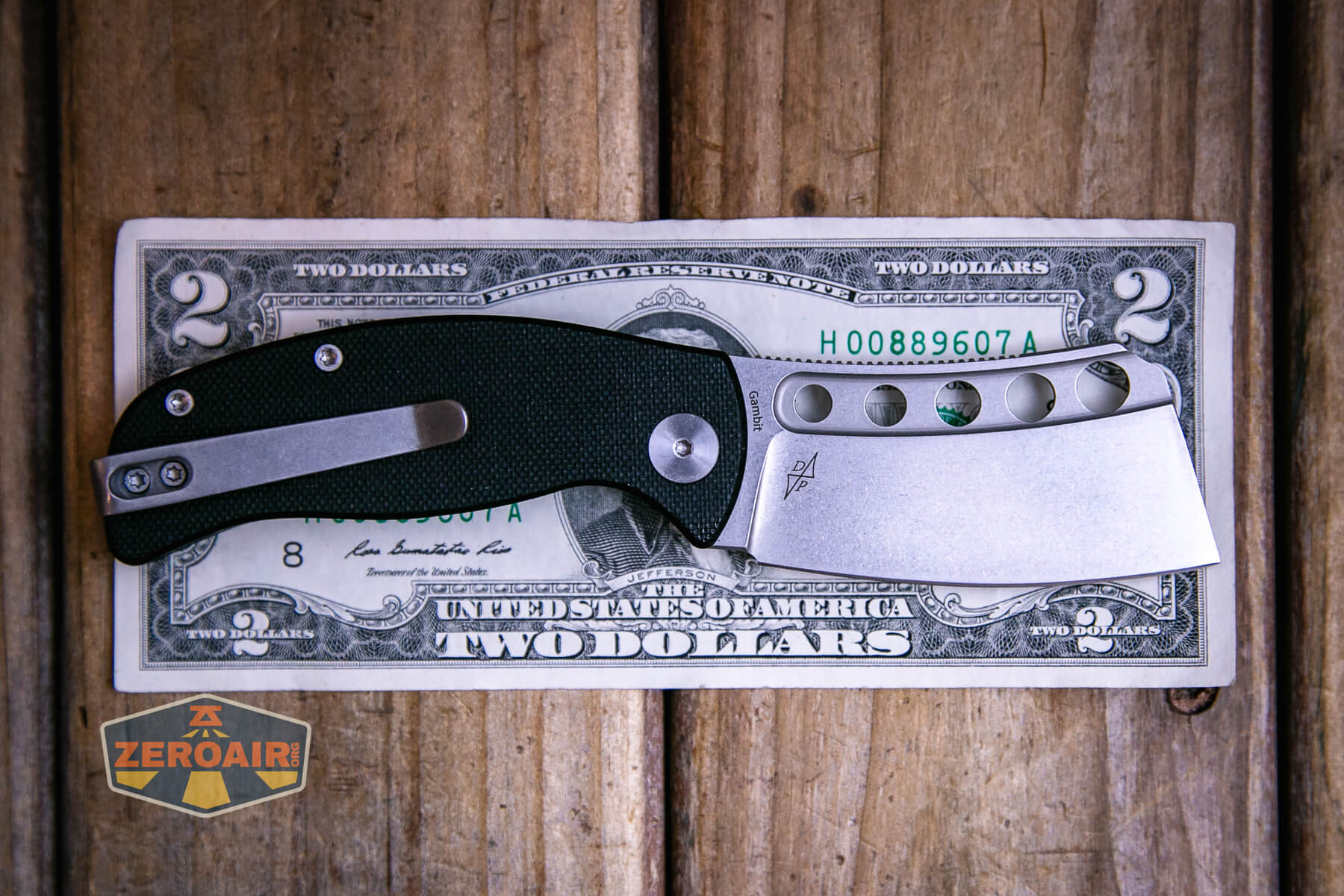 The look of this Shieldon Gambit outdoor knife is one of my favorites, though – I love a cleaver! The holes (which I jokingly want to call “Speed holes”) along the top of the blade look cool.