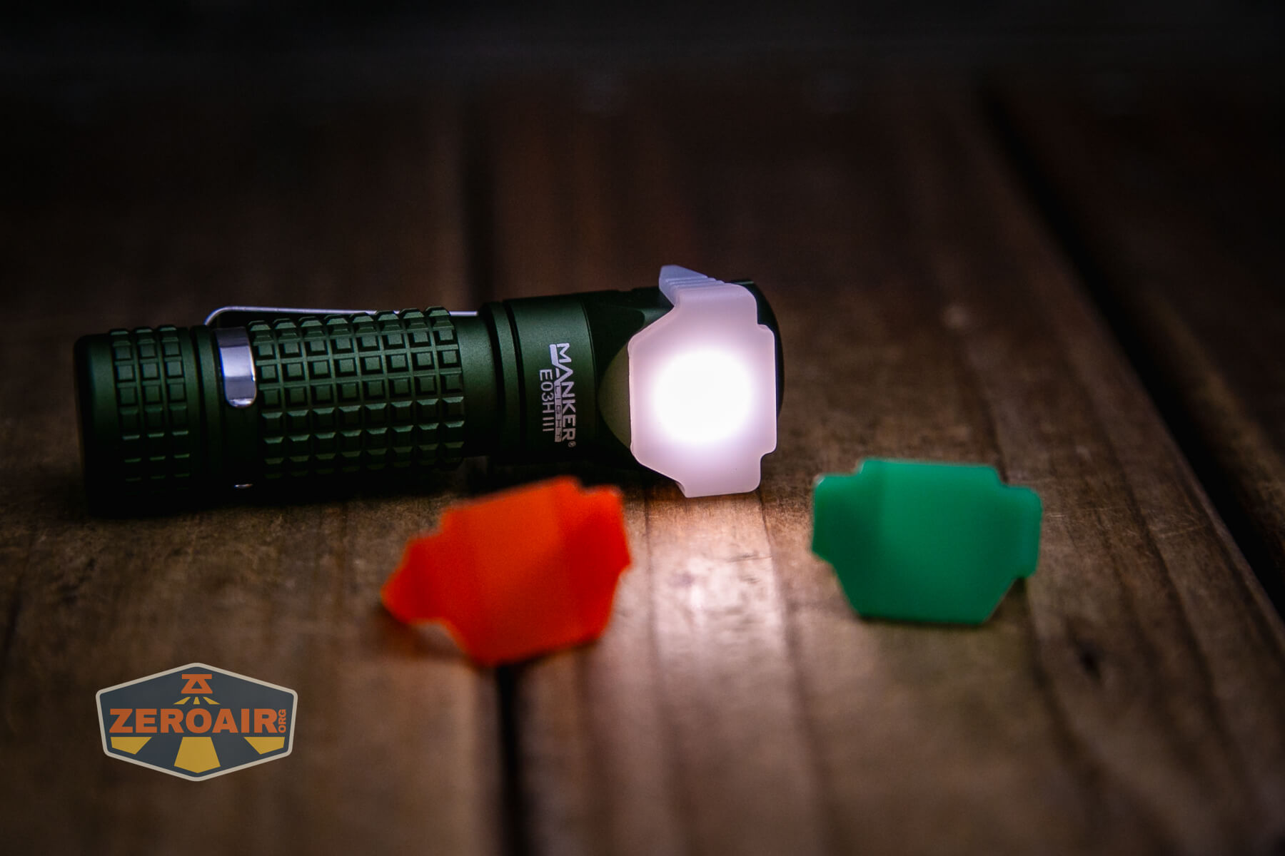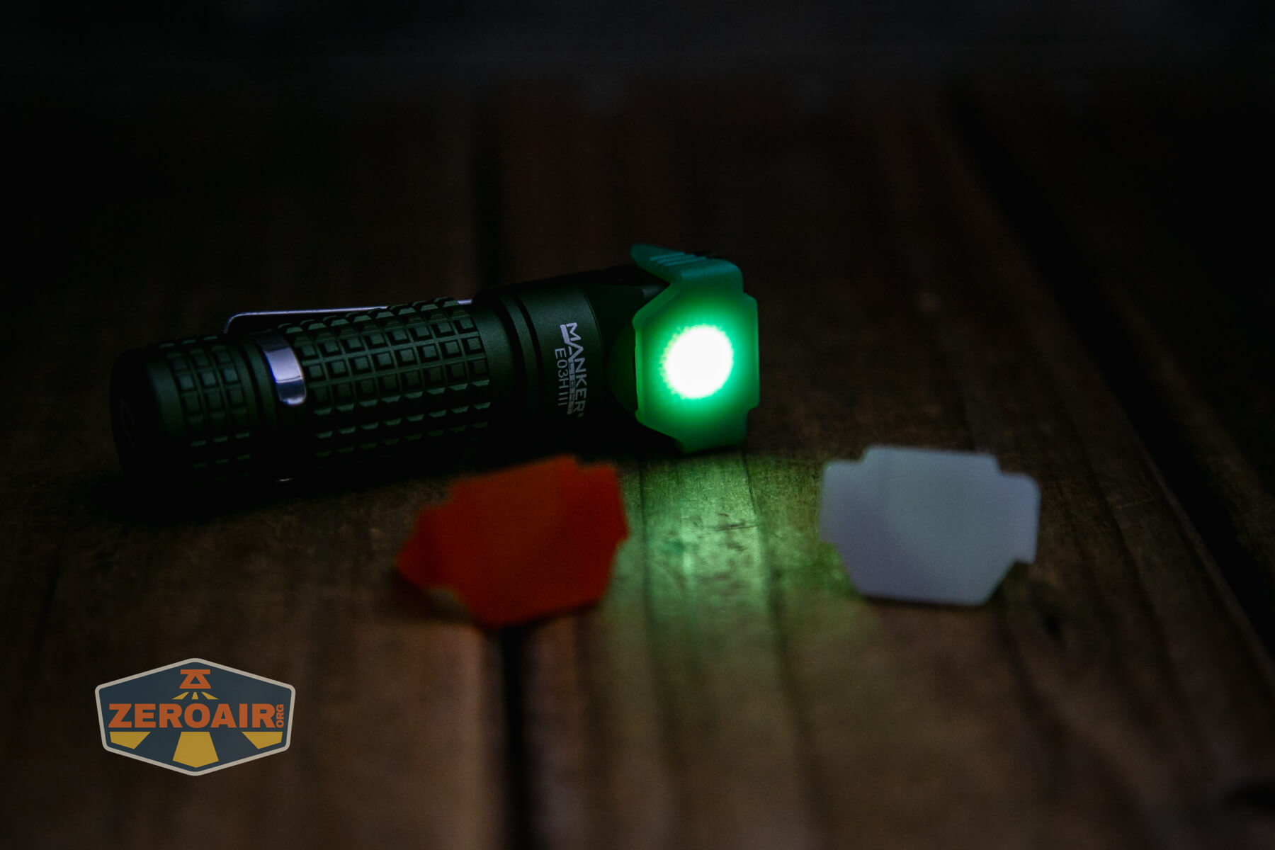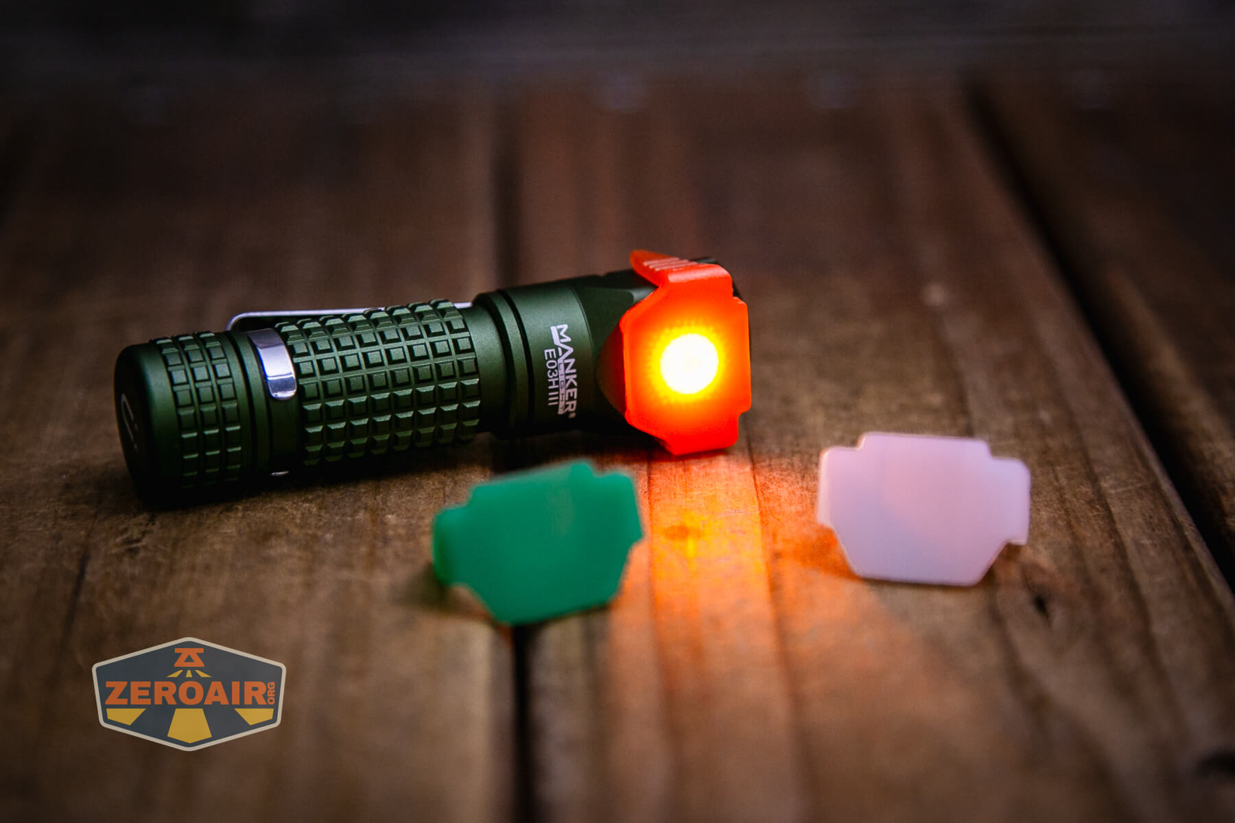 The Manker E03H III headlamp uses one High CRI 4000K Nichia 519a emitter and has three colored covers for modifying the output and it can run a 14500 or AA!