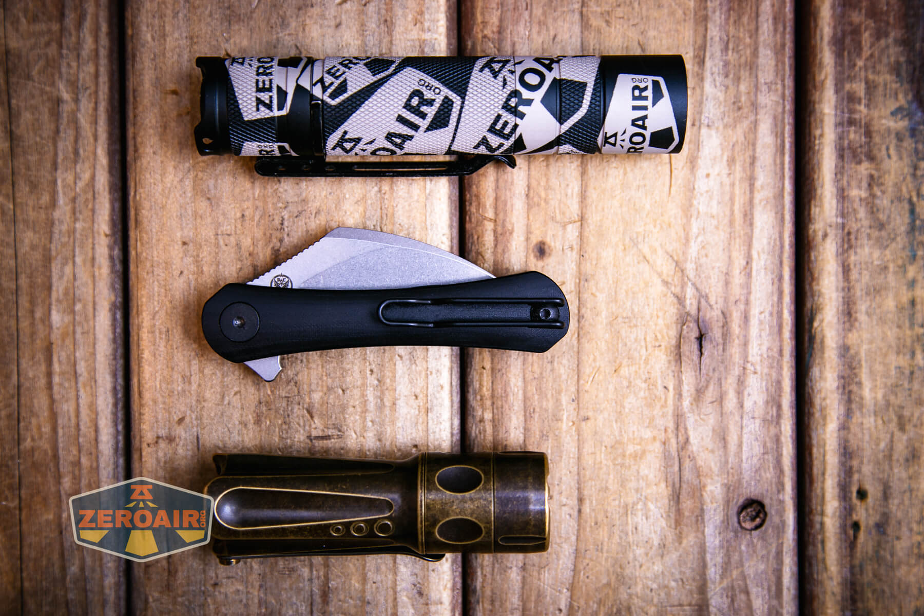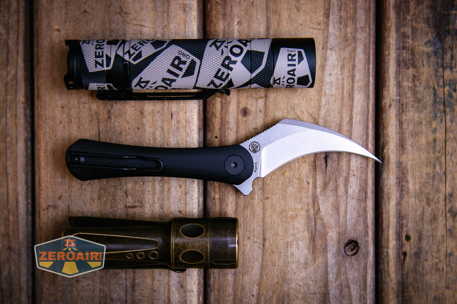 Also above is the knife beside a TorchLAB BOSS 35, an 18350 light. I reviewed the aluminum version of that light in both 35 and 70 formats. I also reviewed that specific edition, the “Oveready BOSS FT Collector Vintage Brass” 35. I love it!