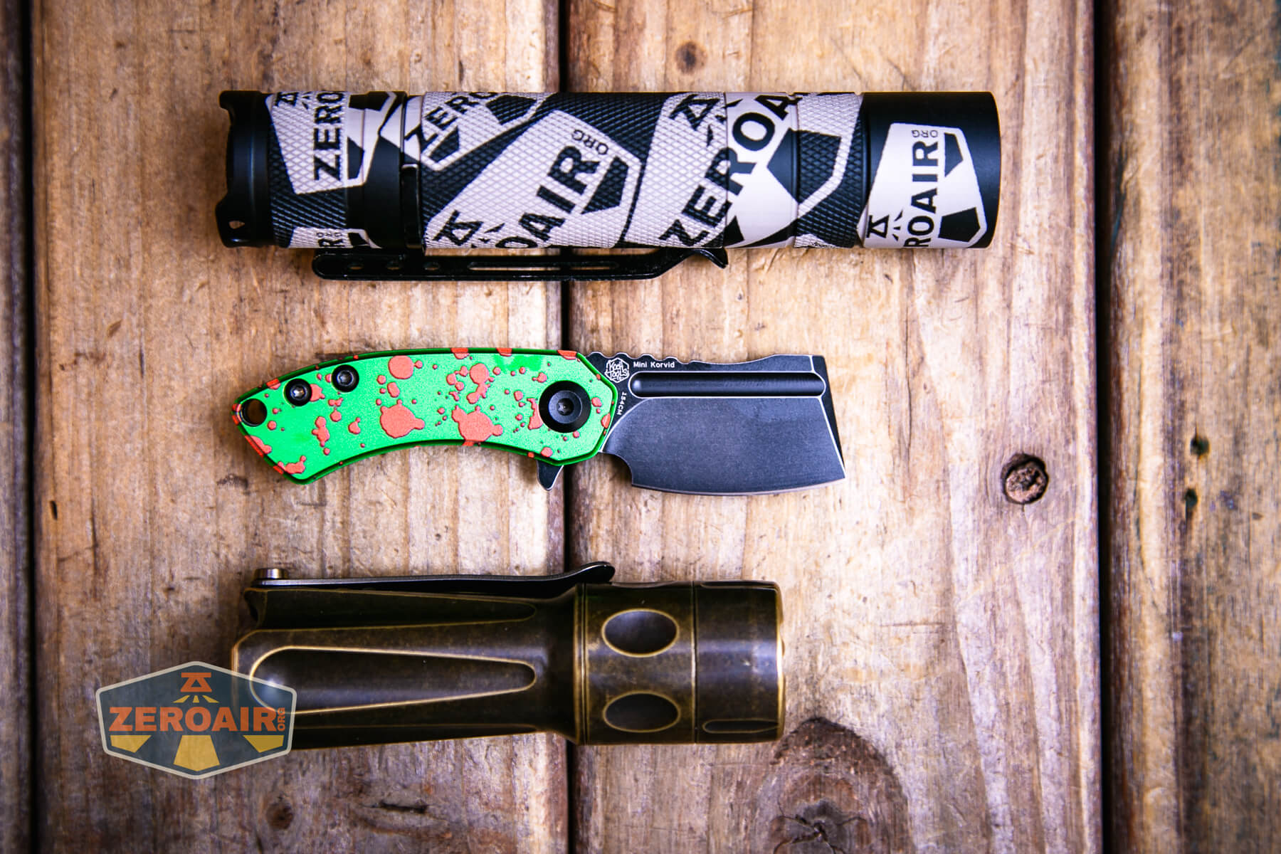 Below you can see the Kansept Mini Korvid Zombie Green knife with the venerable Convoy S2+. The version below is a custom laser-engraved Convoy S2+ host by GadgetConnections.com. I did a full post on an engraved orange host right here! Or go straight to GadgetConnections.com to buy your Convoy S2+ now!