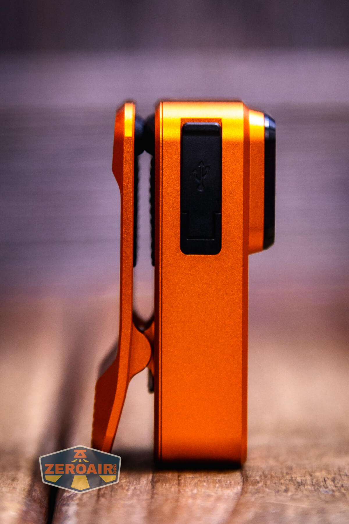 This port is another change from previous versions. Instead of a press-in silicone/soft cover, the Olight Oclip Pro flashlight has a hinged cover that flips open. It flips only as far as can be seen below, though. I do believe it’s metal!