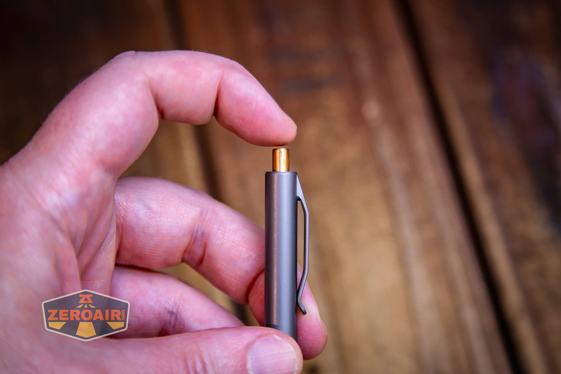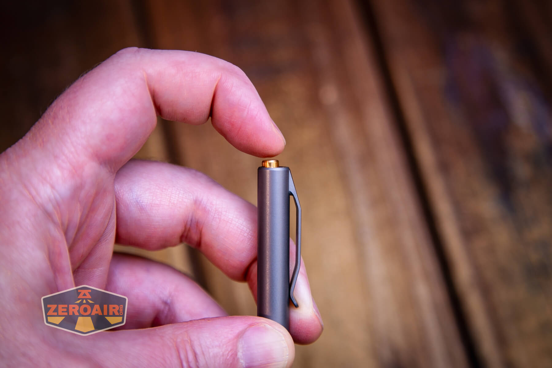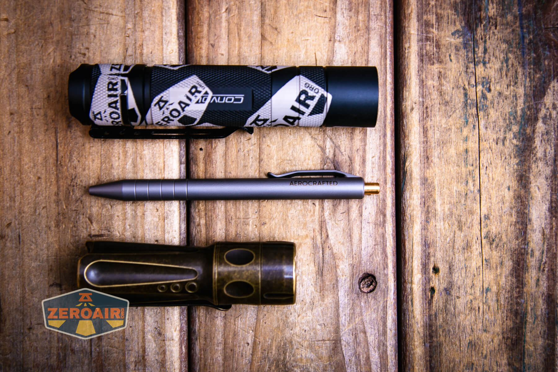 Also above is the Aerocrafted Retract Click Small pen beside a TorchLAB BOSS 35, an 18350 light. I reviewed the aluminum version of that light in both 35 and 70 formats. I also reviewed that specific edition, the “Oveready BOSS FT Collector Vintage Brass” 35. I love it!