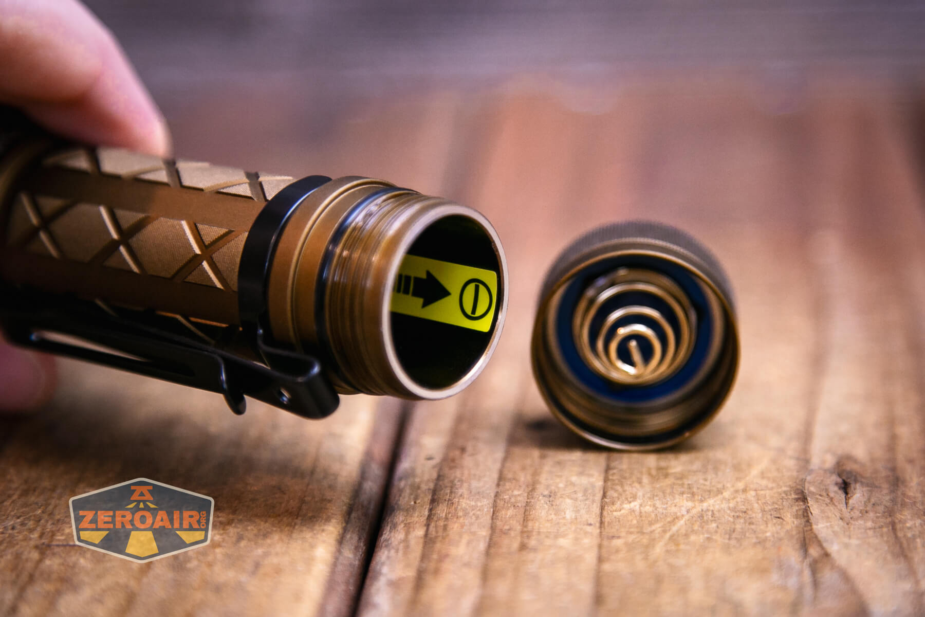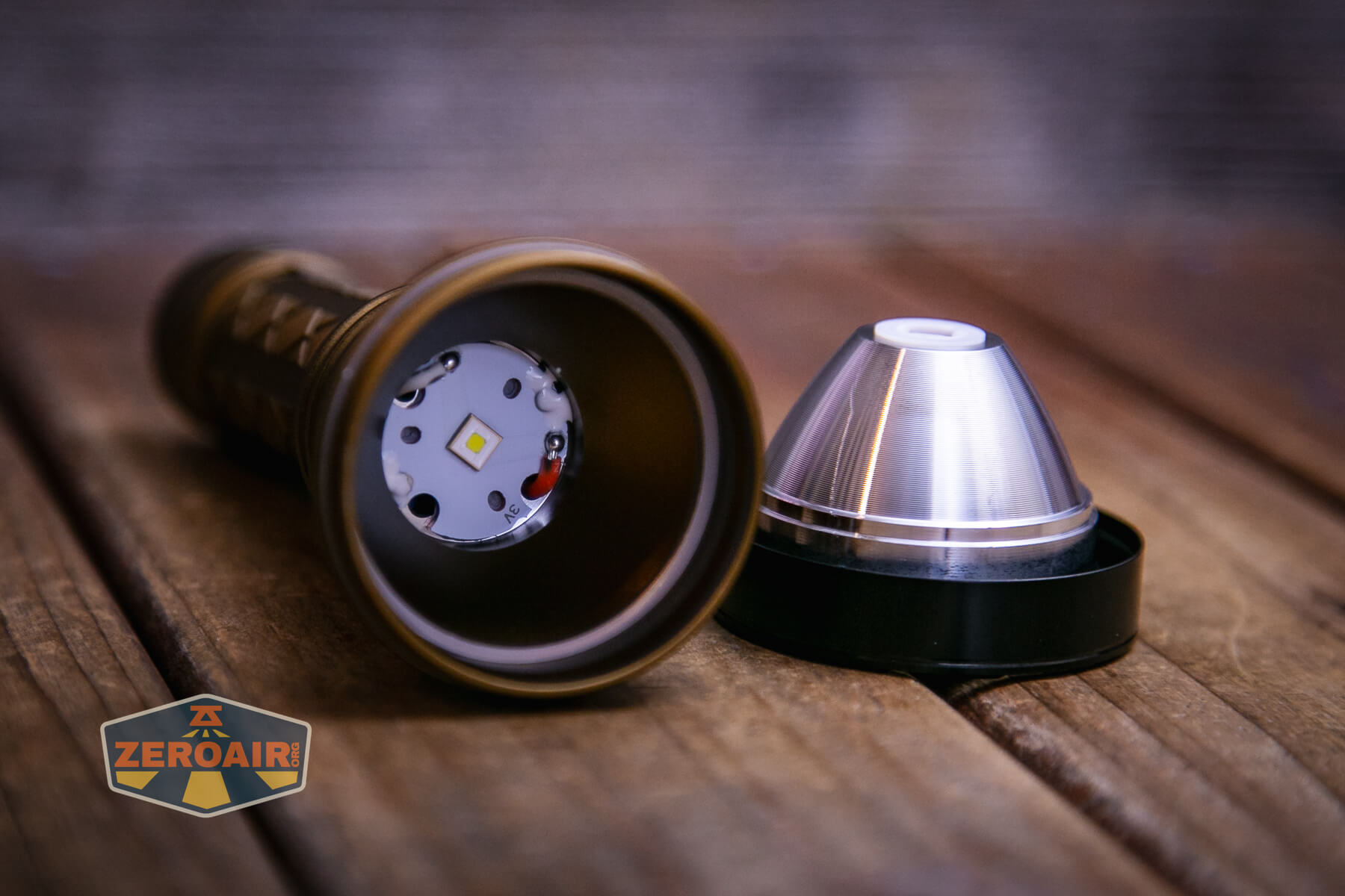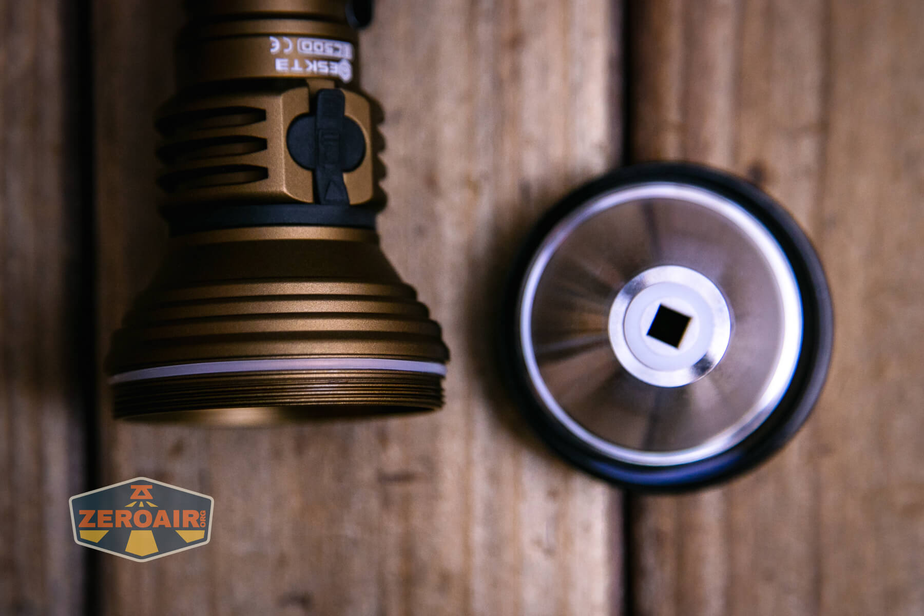 The bezel on this Skilhunt EC500 Coyote neutral white flashlight is not glued and removable, making access to the emitter easy.