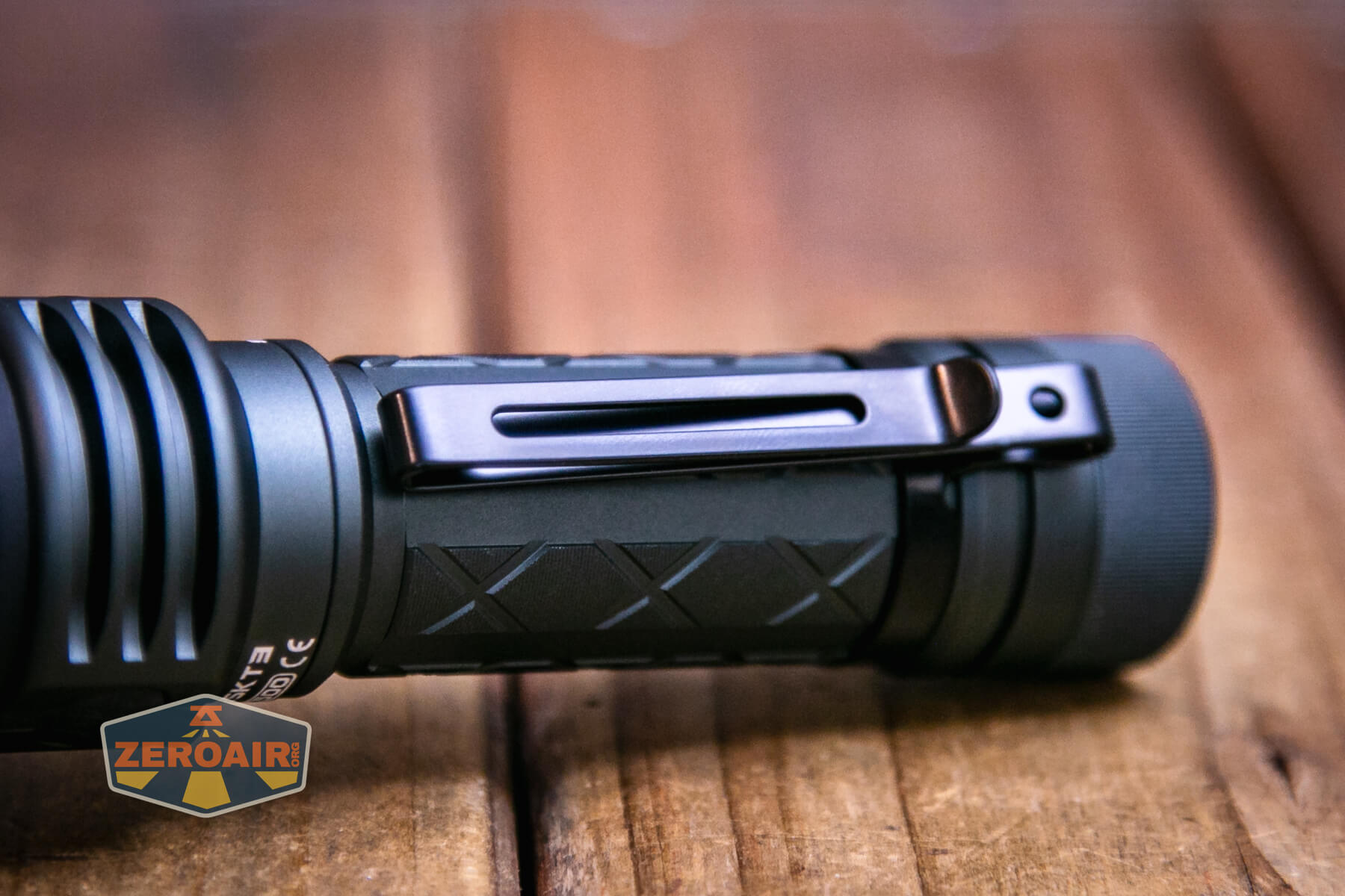 A pocket clip is included with the Skilhunt EC500 warm white flashlight. It ships unattached and is a friction-fit clip.