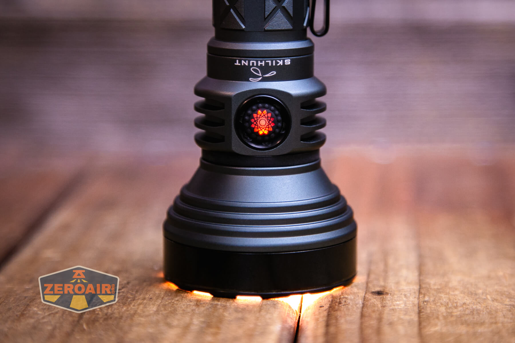 The switch on this Skilhunt EC500 warm white flashlight should be very familiar. It’s very much like what Skilhunt has used for a long while (at least back to 2022 on the EC300, for example). A single e-switch controls the light. This switch has a backlight function and can light in red or blue. While the switch has a transparent center, it has an interesting design pattern printed (?) in the center. It’s not a functional improvement, but a nice touch.