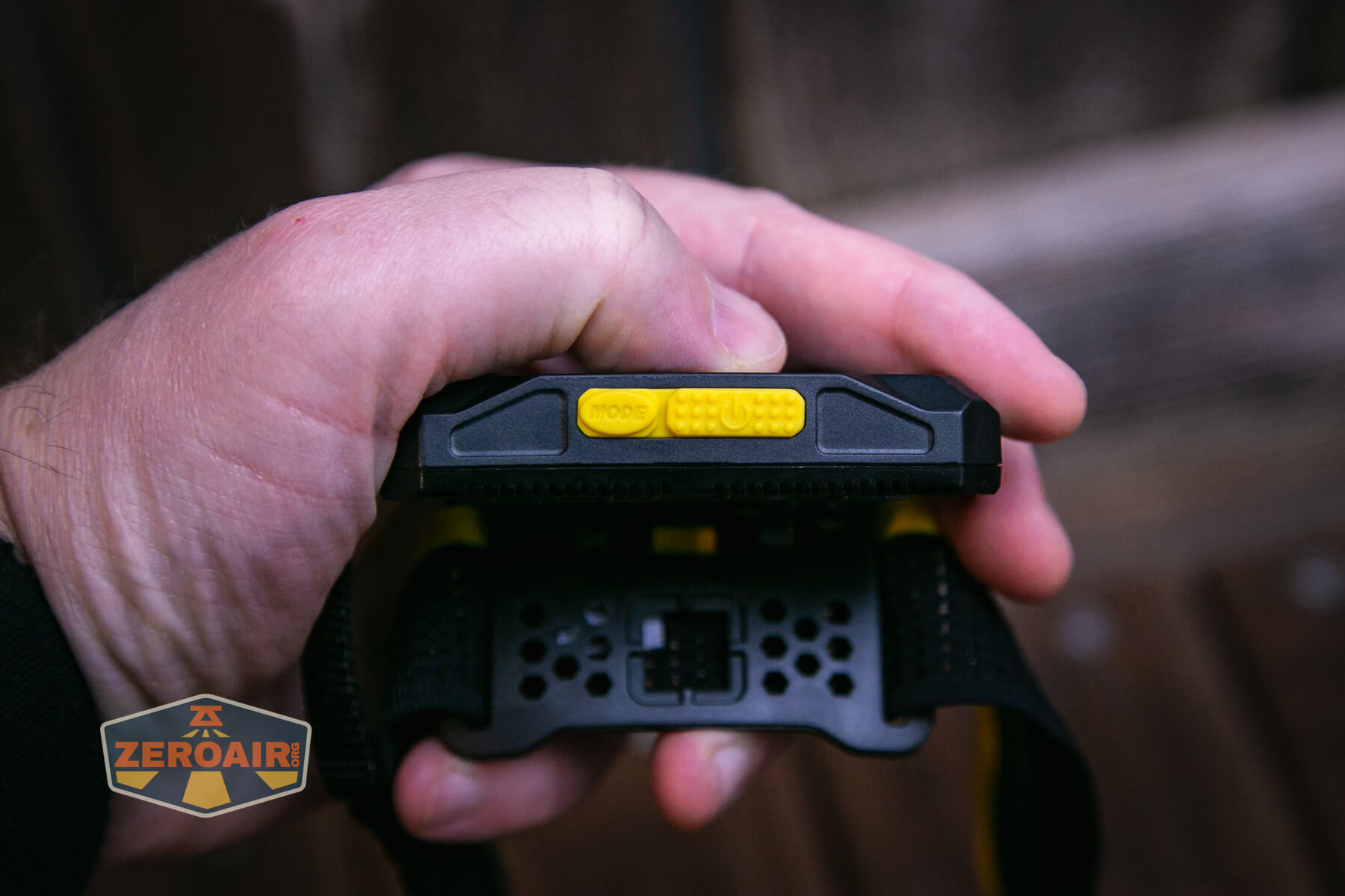 The Nitecore HU2000 headlamp is controlled with two e-switches. They are on the top (when the light is worn properly). I think the Nitecore HU2000 headlamp is fairly intuitive. Below you can see the bigger, textured power switch (right side) with the mode switch on the left.