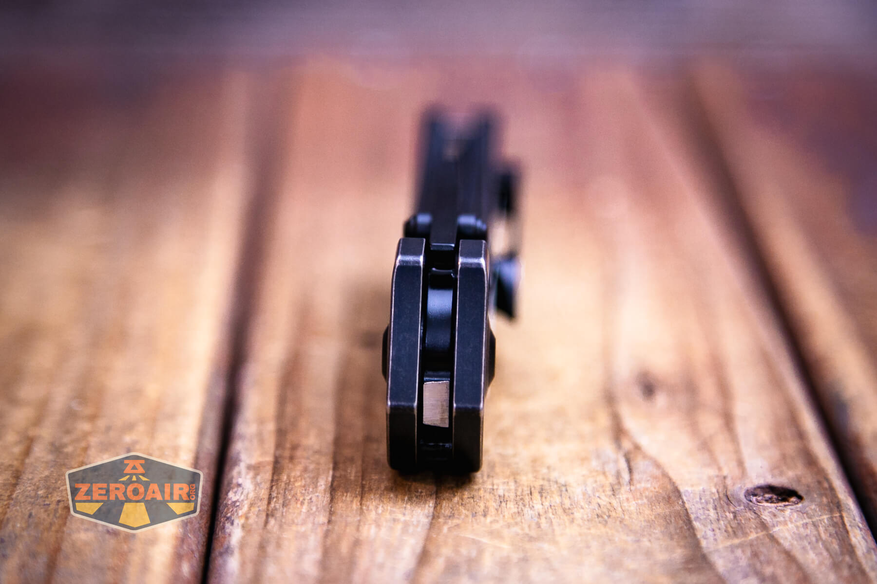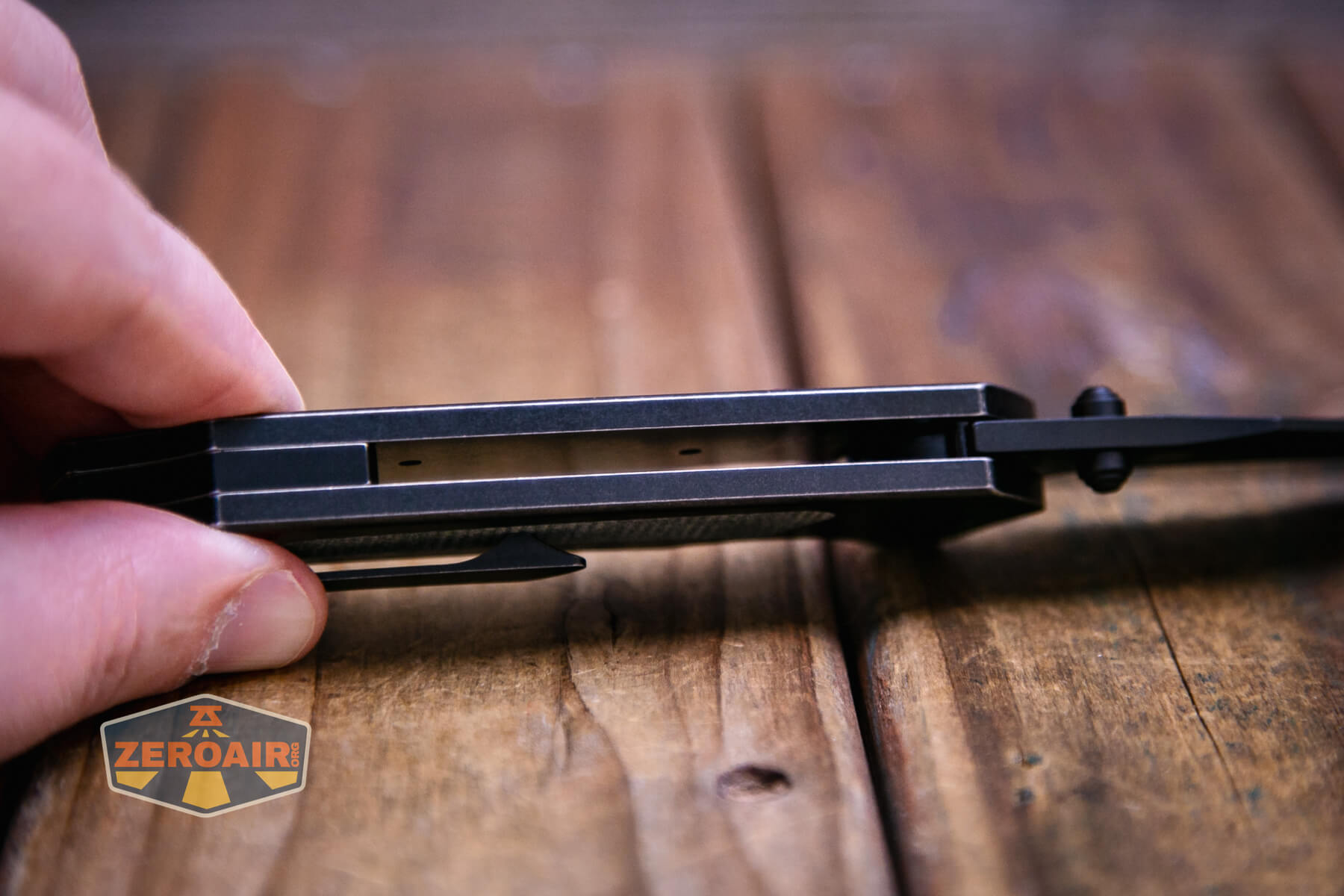 And here’s one of my favorite features of the Kansept Fermi knife. I love that this backspacer matches so nicely – all titanium of course. Both parts here (the scales and the backspacer) are antiqued, so the seams are very visible but in an intentional way.