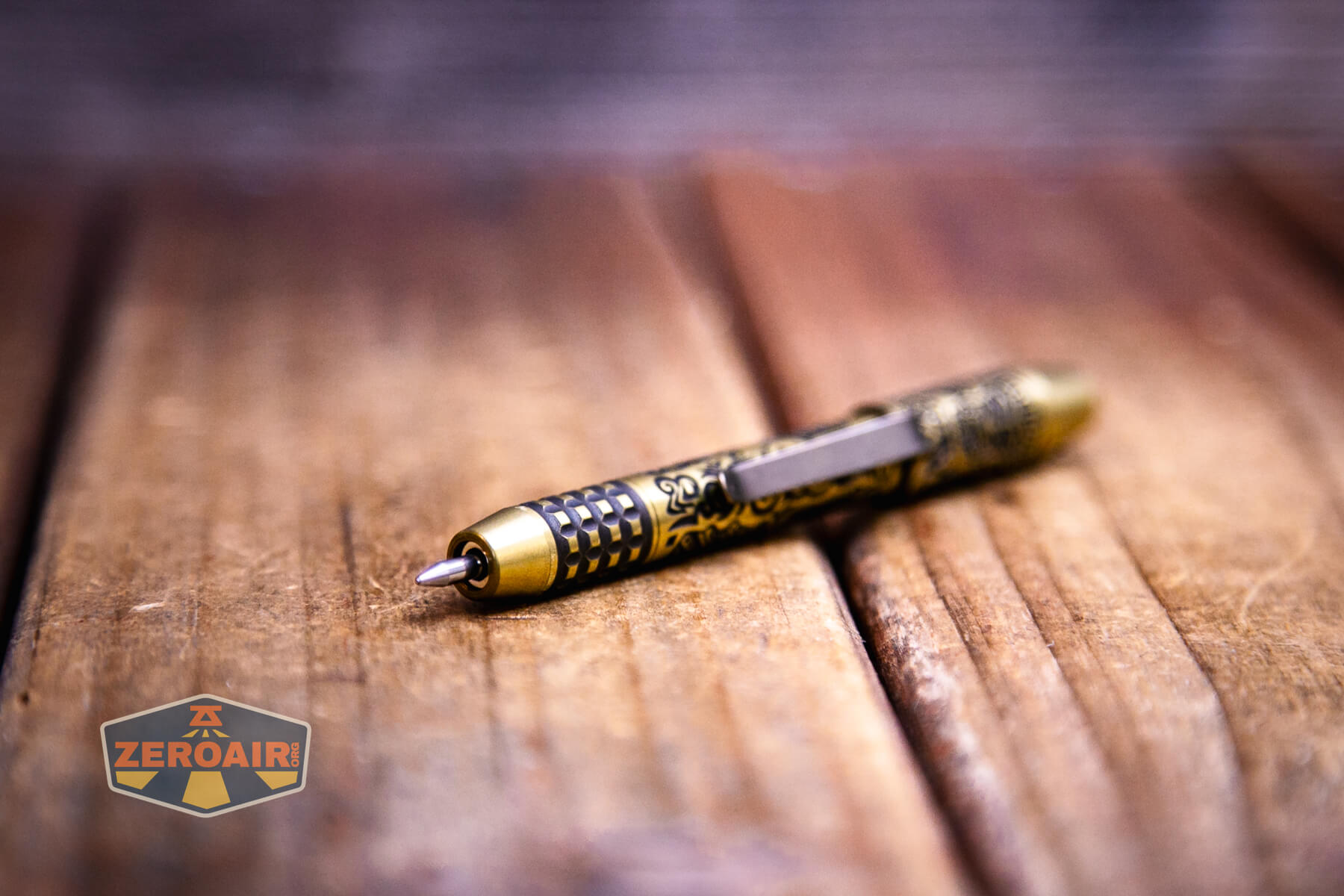 The Ti2 Techliner Brass Tiki Grid pen offers a pocket clip. I believe it’s titanium (non-ferrous, anyway) and it attaches on the tail end.