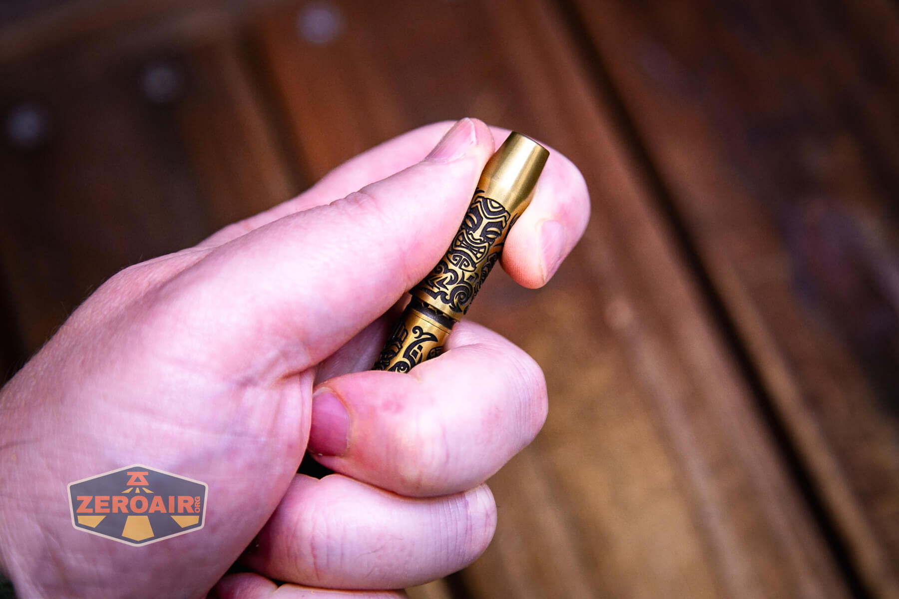 Also above is the pen beside a TorchLAB BOSS 35, an 18350 light. I reviewed the aluminum version of that light in both 35 and 70 formats. I also reviewed that specific edition, the “Oveready BOSS FT Collector Vintage Brass” 35. I love it!
